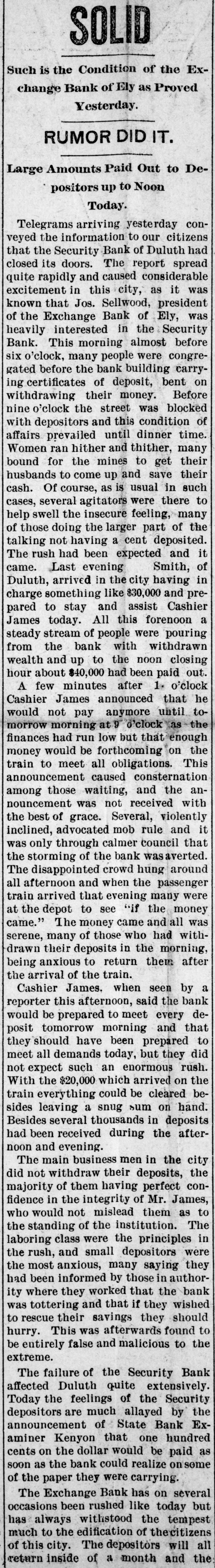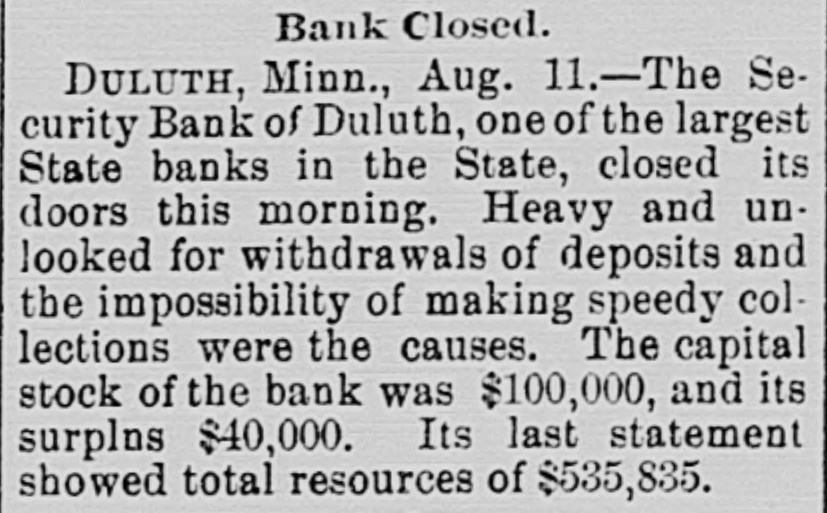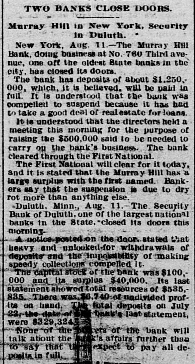 BANK DOORS ARE CLOSED One of New York's Solid Institutions Suecumbs to Real Estate Security. New York, Aug. 11.-The following notice signed by F. D. Kilburn, superintendent of banking, was posted on the door of the Murray Hill bank today: "This bank is closed, pending an investigation of the condition of its affairs." The bank is one of the oldest state institutions in this city. The deposits amount to albout $1,250,000, and it is believed that they will be paid in full. One reason advanced for the suspension is the fact that the bank had to take a considerable amount of real estate for loans. The Murray Hill bank was organized in 1870. It has been regarded as one of the strongest of the smaller up-town institutions. It is understood there is due its depositors about $1,250,000. The customers of the bank were cheifly local tradesmen and it had some brewery accounts. The capital of the bank was $100,000. Mr. F. T. Hopkins is president, and the directors are Rufus M. Stiver, John Weier, James Carney, Bernard Metzger, F. Hopkins and Phillip Diehl. Examiner Kilburn gave out a statement this afternoon that the cash assets of the bank amountel to $130,000, and $34,000 due from the clearing house. Of this amount $45,000 at least may be deducted in exchange for yesterday's business. It also has $56,400 unavailable assets in the shape of bonds of a brewing company to which the bank loaned large amounts but which are said to be not worth 10 cents on the dollar. The bank has sold $122,000 in second mortgage bonds and $108,000 of this amount is hypothecated for a loan of $84,000. The deposits of the bank have fallen off $250,000 in the last few months. Three hundred thousand dollars of the $872,000 which is outside available assets is hypothecated to secure large houses and another loan on the outside of $50,000. There are 1,254 depositors affected by the closing of the bank. Mr. Kilburn also said: "I closed the Murray Hill bank because it was in an unfit condition, after consulting with the clearing house committee and the board of directors of the bank. The trouble is, as far as I am able to ascertain, that they have not sufficient money to do business and no way of raising it without great sacrifice. It is my opinion that the depositors will be paid in full. "I had a meeting with the directors this morning and proposed to them that if they could raise $100,000 and put it into the assets, I would allow them to continue. I found this impossible and believing that a further continuance of business would develop into a worse state of affairs, I deemed it advisable to close the bank at once." Duluth, Minn., Aug. 11.-The Security Bank of Duluth, capital $100,000. one of the leading banks of the city, closed its doors this morning. Heavy withdrawals of deposits and impossibility of making speedy collections is given as the cause. M. D. Kenyon, state examiner, is in charge. The bank's deposits are in the neighborhood of $300,000. Chicago, Aug. 11.-The private bank of L. D. Taylor & Co., successors to North & Taylor, 959 West Madison street, was closed today. By order of the court the Equitable Trust company was made receiver. The assets are $150,000; liabilities about $100,000. Dallas, Tex., Aug. 11.-Hetherington and Nelson, dealers in machinery supplies, filed a deed of trust yesterday; liabilities $34,430.