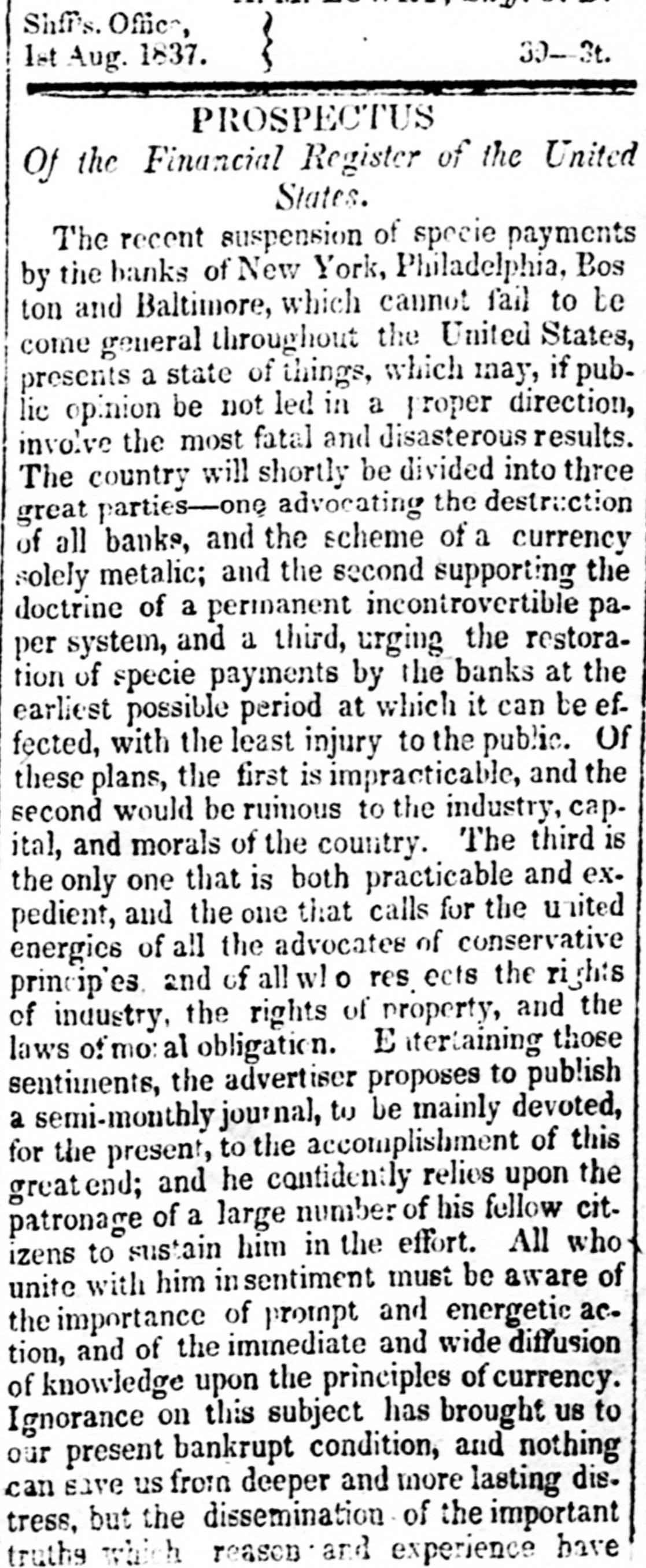 Shff's. Office, 30-3t. 1st Aug. 1837. PROSPECTUS Of the Financial Register of the United States. The recent suspension of specie payments by the banks of New York, Philadelphia, Bos ton and Baltimore, which cannot fail to be come general throughout the United States, presents a state of things, which may, if publie opinion be not led in a proper direction, involve the most fatal and disasterous results. The country will shortly be divided into three great parties-one advocating the destruction of all banks, and the scheme of a currency solely metalic; and the second supporting the doctrine of a permanent incontrovertible paper system, and a third, urging the restoration of specie payments by the banks at the earliest possible period at which it can be effected, with the least injury to the public. Of these plans, the first is impracticable, and the second would be ruinous to the industry, cap. ital, and morals of the country. The third is the only one that is both practicable and expedient, and the one that calls for the united energies of all the advocates of conservative princip'es and of all wlo res ects the rights of industry, the rights of property, and the laws of moral obligation. E intertaining those sentiments, the advertiser proposes to publish a semi-monthly journal, to be mainly devoted, for the present, to the accomplishment of this greatend; and he contidently relies upon the patronage of a large number of his fellow citizens to sustain him in the effort. All who unite with him in sentiment must be aware of the importance of prompt and energetic ac. tion, and of the immediate and wide diffusion of knowledge upon the principles of currency. Ignorance on this subject has brought us to our present bankrupt condition, and nothing can save us from deeper and more lasting dis. tress, but the dissemination of the important reason and experience have truths