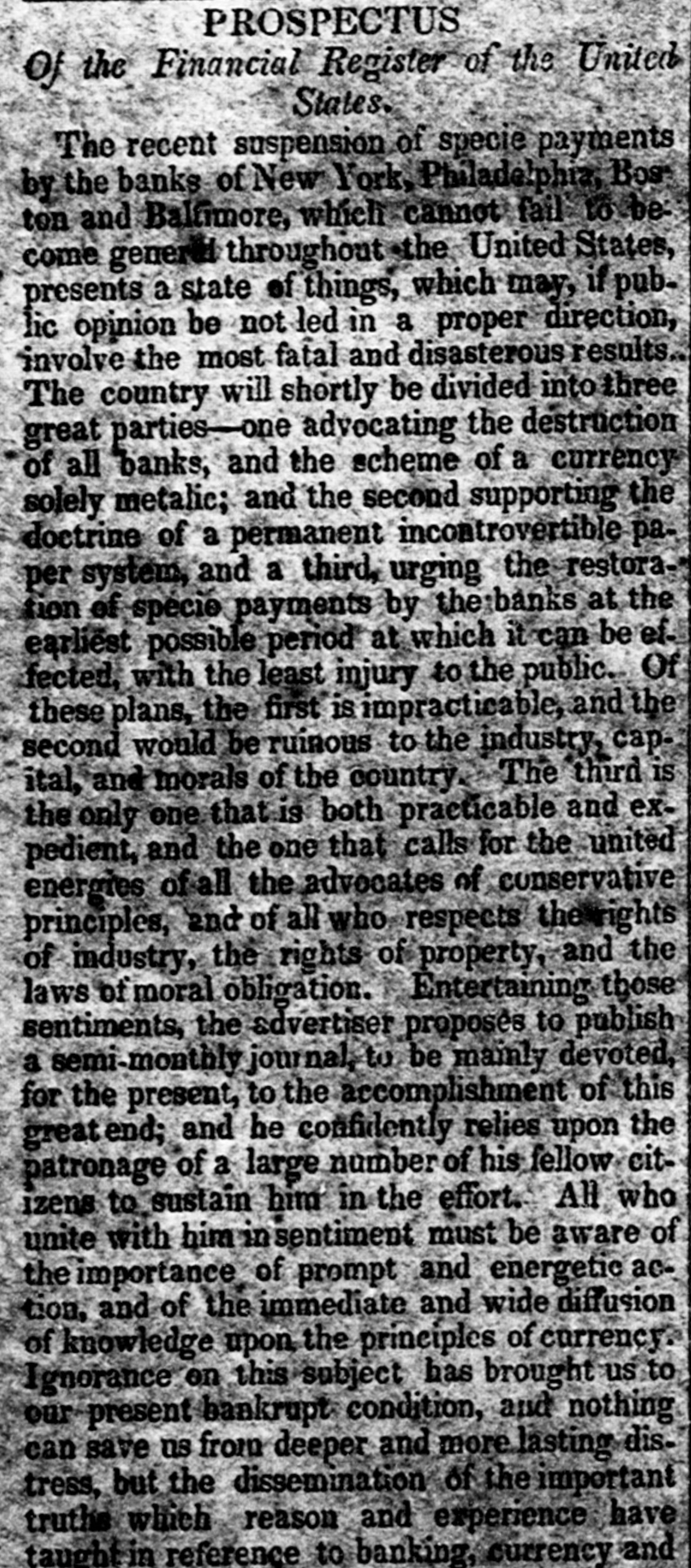 PROSPECTUS of the Financial Register of the United States. The recent suspension of specie payments by the banks of New York, Philadelphia Bos ton and Baltimore, which cannot fail to be come general throughout the United States, presents a state of things, which may, if public opinion be not led in a proper direction, involve the most fatal and disasterous results.. The country will shortly be divided into three great parties-one advocating the destruction of all banks, and the scheme of a currency solely metalic; and the second supporting the doctrine of a permanent incontrovertible paper system, and a third, urging the restoration of specio payments by the banks at the earliest possible period at which it can be ef. Of fected, with the least injury to the public, these plans, the first is impracticable, and the second would be ruinous to the industry cap. ital, and morals of the country. The third is the only one that is both practicable and expedient, and the one that calls for the united energies of all the advocates of conservative principles, 2nd of all who respects the rights of industry, the rights of property, and the laws of moral obligation. Entertaining those sentiments, the advertiser proposés to publish a semi-monthly journal, to be mamly devoted, for the present, to the accomplishment of this great end; and he confidently relies upon the patronage of a large number of his fellow citizens to sustain him in the effort. All who unite with him in sentiment must be aware of the importance of prompt and energetic action, and of the immediate and wide diffusion of knowledge upon the principles of currency. Ignorance on this subject has brought us to our present bankrupt condition, and nothing can save us from deeper and more lasting distress, but the dissemination of the important truths which reason and experience have taught reference to banking, currency and