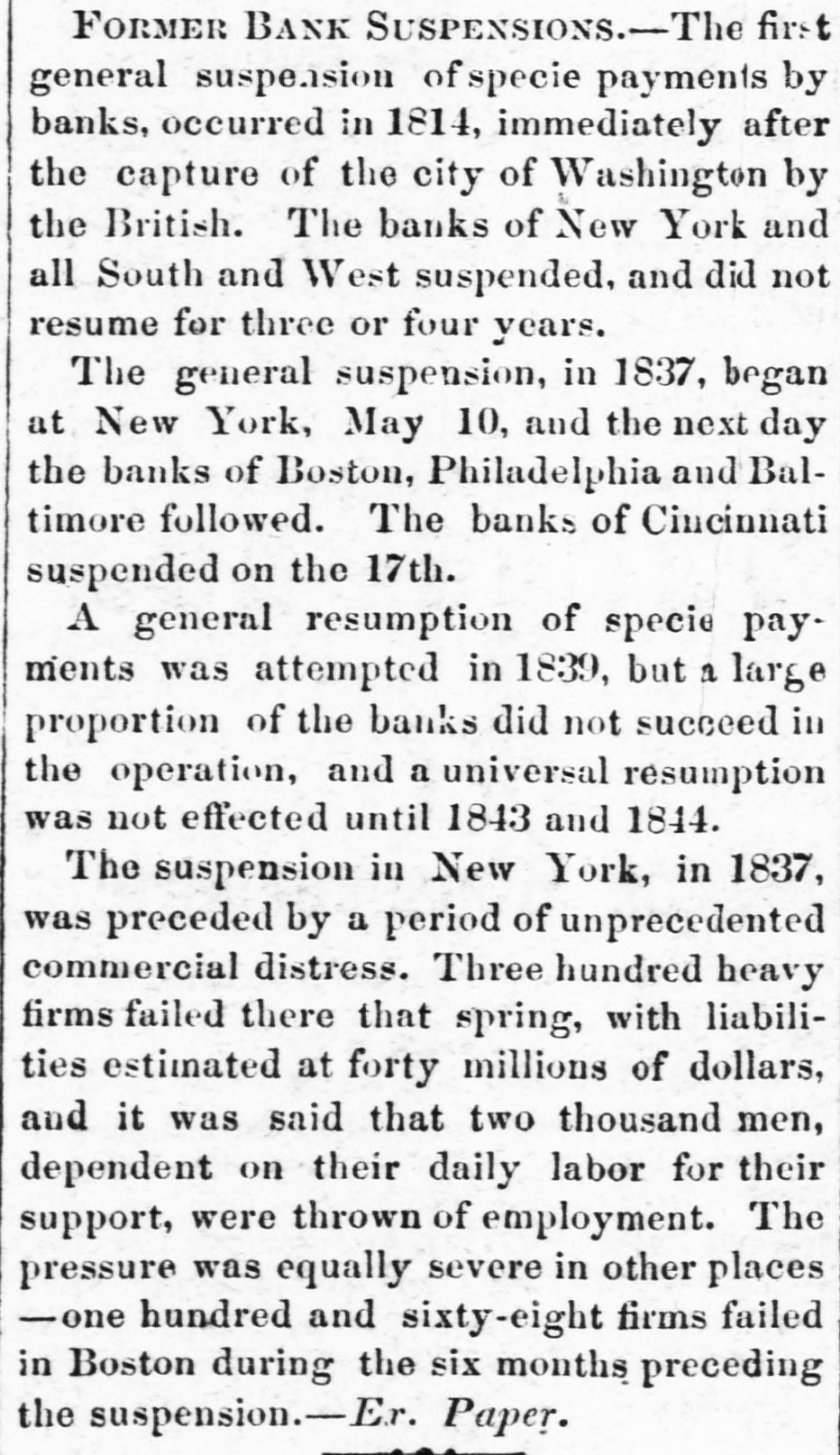 FORMER BANK SUSPENSIONS.-The first general suspension of specie payments by banks, occurred in 1814, immediately after the capture of the city of Washington by the British. The banks of New York and all South and West suspended, and did not resume for three or four years. The general suspension, in 1837, began at New York, May 10, and the next day the banks of Boston, Philadelphia and Baltimore followed. The banks of Cincinnati suspended on the 17th. A general resumption of specie payments was attempted in 1839, but a large proportion of the banks did not succeed in the operation, and a universal resumption was not effected until 1843 and 1844. The suspension in New York, in 1837, was preceded by a period of unprecedented commercial distress. Three hundred heavy firms failed there that spring, with liabilities estimated at forty millions of dollars, and it was said that two thousand men, dependent on their daily labor for their support, were thrown of employment. The pressure was equally severe in other places -one hundred and sixty-eight firms failed in Boston during the six months preceding the suspension.-Er. Paper.