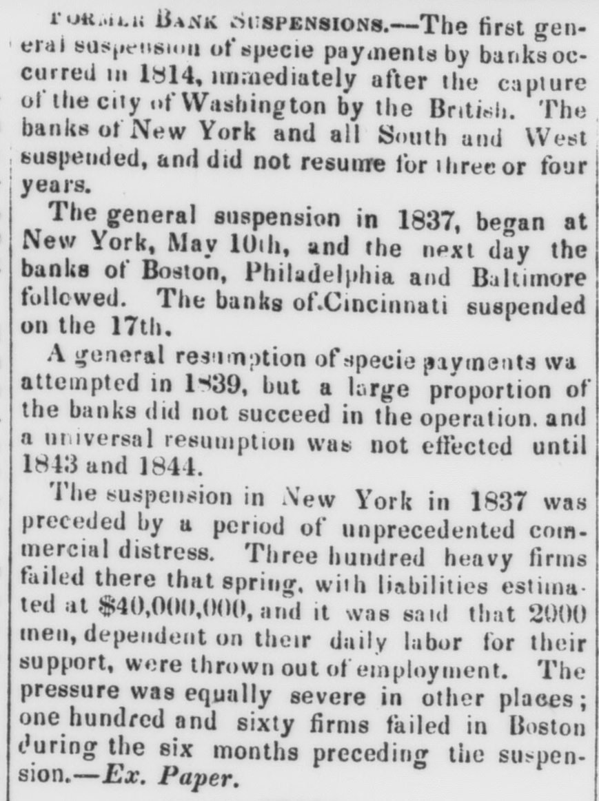 TORMER BANK SUSPENSIONS.--The - first general suspension of specie payments by banks occurred III 1814, immediately after the capture of the city of Washington by the British. The banks of New York and all South and West suspended, and did not resumre for three or four years. The general suspension in 1837, began at New York, May 10th, and the next day the banks of Boston, Philadelphia and Baltimore followed. The banks of.Cincinnati suspended on the 17th. A general resumption of specie payments Wa attempted in 1839, but a large proportion of the banks did not succeed in the operation. and a universal resumption was not effected until 1843 and 1844. The suspension in New York in 1837 was preceded by u period of unprecedented commercial distress. Three hundred heavy firms failed there that spring. with liabilities estima. ted at $40,000,000, and it was said that 2000 men, dependent on their daily labor for their support, were thrown out of employment. The pressure was equally severe in other places; one hundred and sixty firms failed in Boston during the six months preceding the suspension.-Ex. Paper.