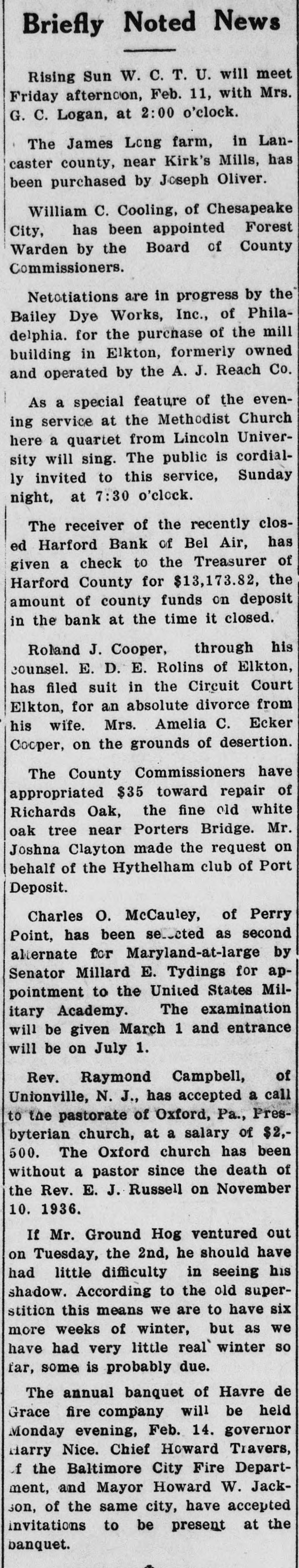 Briefly Noted News Rising Sun W. C. T. U. will meet Friday afternoon, Feb. 11, with Mrs. G. C. Logan, at 2:00 o'clock. The James Long farm, in Lancaster county, near Kirk's Mills, has been purchased by Joseph Oliver. William C. Cooling, of Chesapeake City, has been appointed Forest Warden by the Board of County Commissioners. Netotiations are in progress by the Bailey Dye Works, Inc., of Philadelphia. for the purchase of the mill building in Elkton, formerly owned and operated by the A. J. Reach Co. As a special feature of the evening service at the Methodist Church here a quartet from Lincoln University will sing. The public is cordially invited to this service, Sunday night, at 7:30 o'clock. The receiver of the recently closed Harford Bank of Bel Air, has given a check to the Treasurer of Harford County for $13,173.82, the amount of county funds on deposit in the bank at the time it closed. Roland J. Cooper, through his counsel. E. D. E. Rolins of Elkton, has filed suit in the Circuit Court Elkton, for an absolute divorce from his wife. Mrs. Amelia C. Ecker Cooper, on the grounds of desertion. The County Commissioners have appropriated $35 toward repair of Richards Oak, the fine old white oak tree near Porters Bridge. Mr. Joshna Clayton made the request on behalf of the Hythelham club of Port Deposit. Charles O. McCauley, of Perry Point, has been selected as second alternate for Maryland-at-large by Senator Millard E. Tydings for appointment to the United States Military Academy. The examination will be given March 1 and entrance will be on July 1. Rev. Raymond Campbell, of Unionville, N. J., has accepted a call to the pastorate of Oxford, Pa., Presbyterian church, at a salary of $2,500. The Oxford church has been without a pastor since the death of the Rev. E. J. Russell on November 10. 1936. If Mr. Ground Hog ventured out on Tuesday, the 2nd, he should have had little difficulty in seeing his shadow. According to the old superstition this means we are to have six more weeks of winter, but as we have had very little real` winter so far, some is probably due. The annual banquet of Havre de Grace fire company will be held Monday evening, Feb. 14. governor Harry Nice. Chief Howard Travers, .f the Baltimore City Fire Department, and Mayor Howard W. Jackson, of the same city, have accepted invitations to be present at the banquet.