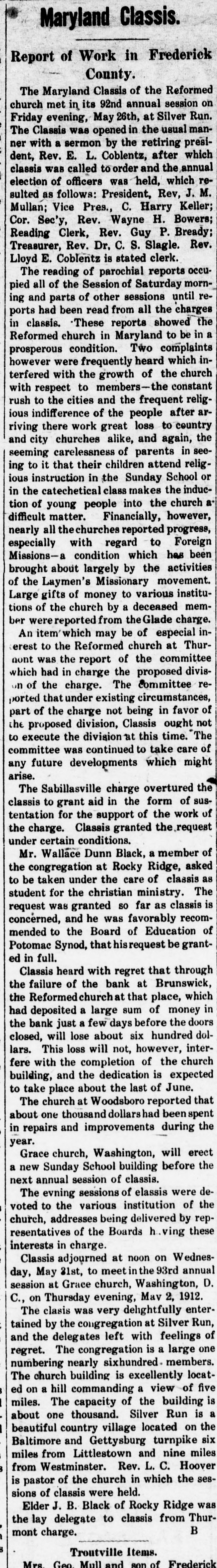 Maryland Classis. Report of Work in Frederick County. The Maryland Classis of the Reformed church met in its 92nd annual session on Friday evening, May 26th, at Silver Run. The Classis was opened in the usual manner with a sermon by the retiring president, Rev. E. L. Coblentz, after which classis was called to order and the annual election of officers was held, which resulted as follows: President, Rev, J. M. Mullan; Vice Pres., C. Harry Keller; Cor. Sec'y, Rev. Wayne H. Bowers; Reading Clerk, Rev. Guy P. Bready; Treasurer, Rev. Dr. C. S. Slagle. Rev. Lloyd E. Coblentz is stated clerk. The reading of parochial reports occupied all of the Session of Saturday morning and parts of other sessions until reports had been read from all the charges in classis. These reports showed the Reformed church in Maryland to be in a prosperous condition. Two complaints however were frequently heard which interfered with the growth of the church with respect to members-the constant rush to the cities and the frequent religious indifference of the people after arriving there work great loss to country and city churches alike, and again, the seeming carelessness of parents in seeing to it that their children attend religious instruction in the Sunday School or in the catechetical class makes the induetion of young people into the church a* difficult matter. Financially, however, nearly all the churches reported progress, especially with regard to Foreign Missions-a condition which has been brought about largely by the activities of the Laymen's Missionary movement. Large gifts of money to various institutions of the church by a deceased member were reported from the Glade charge. An item which may be of especial inerest to the Reformed church at Thurnont was the report of the committee which had in charge the proposed divison of the charge. The committee reported that under existing circumstances, part of the charge not being in favor of the proposed division, Classis ought not to execute the division at this time. The committee was continued to take care of any future developments which might arise. The Sabillasville charge overtured the classis to grant aid in the form of sustentation for the support of the work of the charge. Classis granted the request under certain conditions. Mr. Wallace Dunn Black, a member of the congregation at Rocky Ridge, asked to be taken under the care of classis as student for the christian ministry. The request was granted so far as classis is concerned, and he was favorably recommended to the Board of Education of Potomac Synod, that isrequest be granted in full. Classis heard with regret that through the failure of the bank at Brunswick, the Reformed churcha that place, which had deposited a large sum of money in the bank just a few days before the doors closed, will lose about six hundred dollars. This loss will not, however, interfere with the completion of the church building, and the dedication is expected to take place about the last of June. The church at Woodsboro reported that about one thousand dollars beenspent in repairs and improvements during the year. Grace church, Washington, will erect a new Sunday School building before the next annual session of classis. The evning sessions of elassis were devoted to the various institution of the church, addresses being delivered by representatives of the Boards ving these interests in charge. Classis adjourned at noon on Wednesday, May 31st, to meet in the 93rd annual session at Grace church, Washington, D. C., on Thursday evening, Mav 2, 1912. The clasis was very dehghtfully entertained by the congregation at Silver Run, and the delegates left with feelings of regret. The congregation is a large one numbering nearly sixhundred. members. The church building is excellently located on a hill commanding a view of five miles. The capacity of the building is about one thousand. Silver Run is a beautiful country village located on the Baltimore and Gettysburg turnpike six miles from Littlestown and nine miles from Westminster. Rev. L. C. Hoover is pastor of the church in which the sessions of classis were held. Elder J. B. Black of Rocky Ridge was the lay delegate to classis from ThurB