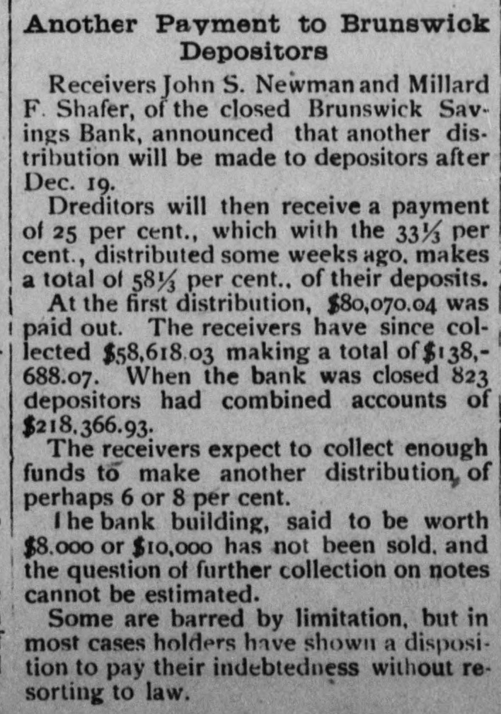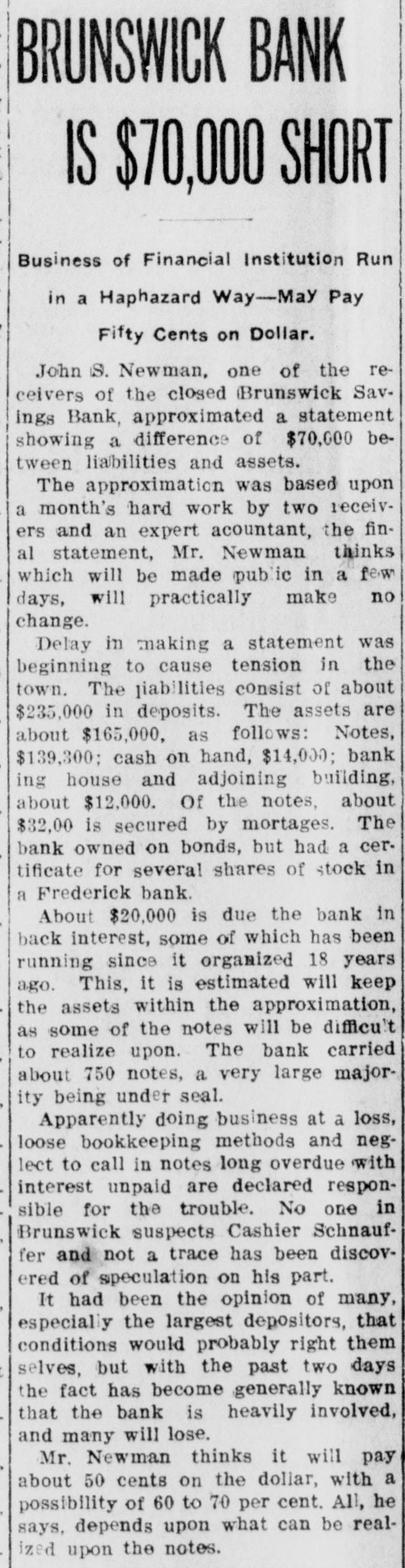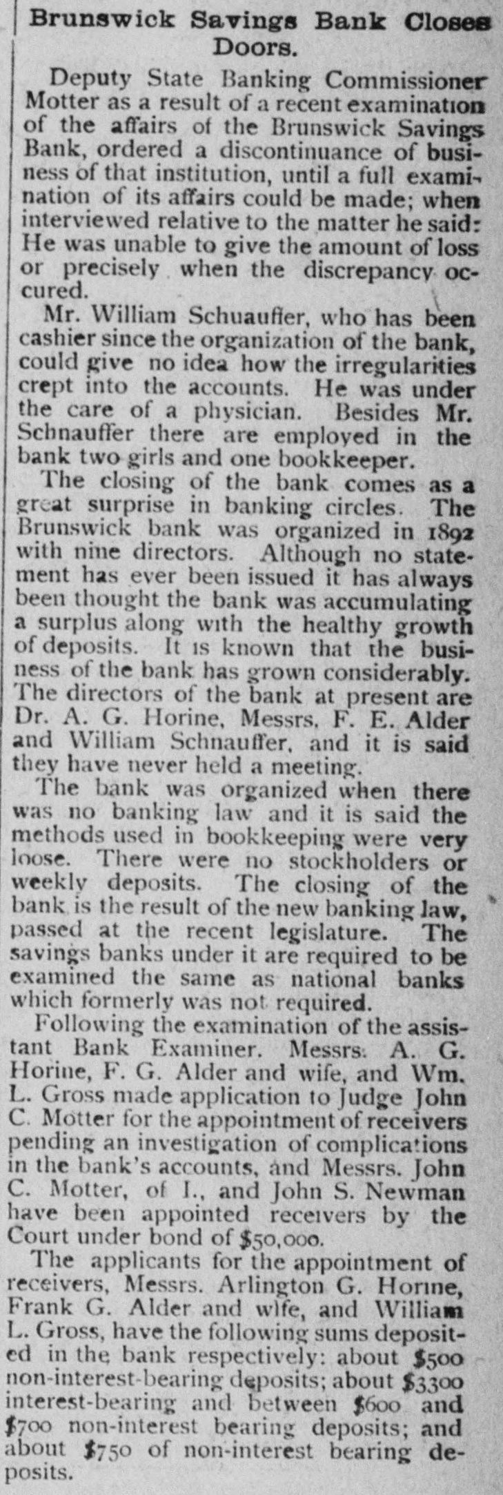 Brunswick Savings Bank Closes Doors. Deputy State Banking Commissioner of Motter the as affairs a result of the of a Brunswick recent examination Savings Bank, ordered a discontinuance of business of that institution, until a full examination of its affairs could be made; when interviewed relative to the matter he said: He was unable to give the amount of loss or precisely when the discrepancy occured. Mr. William Schuaufler, who has been no could cashier give since the idea organization how the irregularities of the bank, crept into the accounts. He was under the care of a physician. Besides Mr. Schnauffer there are employed in the bank two girls and one bookkeeper. The closing of the bank comes as a great surprise in banking circles. The Brunswick bank was organized in 1892 with nine directors. Although no statement has ever been issued it has always been thought the bank was accumulating a surplus along with the healthy growth of deposits. It IS known that the business of the bank has grown considerably. The directors of the bank at present are Dr. A. G. Horine, Messrs, F. E. Alder and William Schnauffer, and it is said they have never held a meeting. The bank was organized when there was no banking law and it is said the methods used in bookkeeping were very loose. There were no stockholders or weekly deposits. The closing of the bank is the result of the new banking law, passed at the recent legislature. The savings banks under it are required to be examined the same as national banks which formerly was not required. Following the examination of the assistant Bank Examiner. Messrs: A. G. Horine, F. G. Alder and wife, and Wm. L. Gross made application to Judge John C. Motter for the appointment of receivers pending an investigation of complications in the bank's accounts, and Messrs. John C. Motter, of I., and John S. Newman have been appointed receivers by the Court under bond of $50,000. The applicants for the appointment of receivers, Messrs. Arlington G. Horne, Frank G. Alder and wife, and William L. Gross, have the following sums deposited in the bank respectively: about $500 non-interest-bearing deposits; about $3300 interest-bearing and between $600 and $700 non-interest bearing deposits; and about $750 of non-interest bearing deposits.