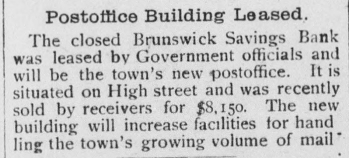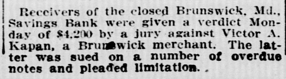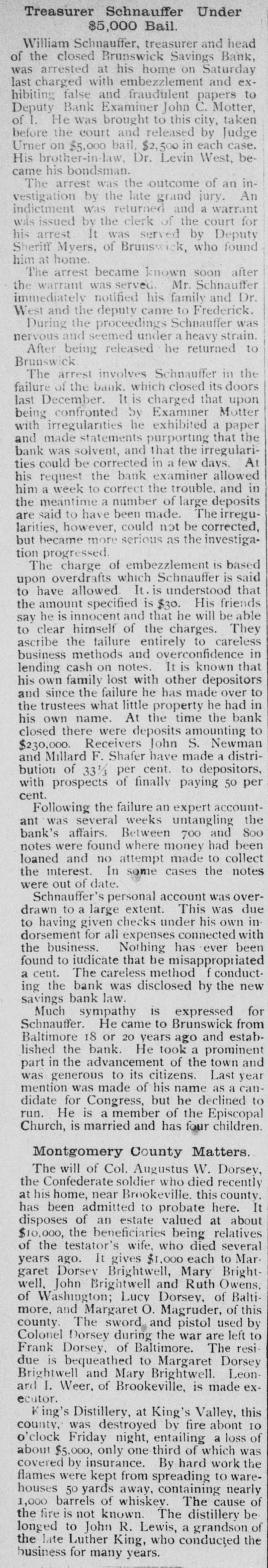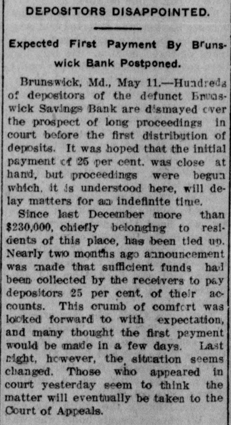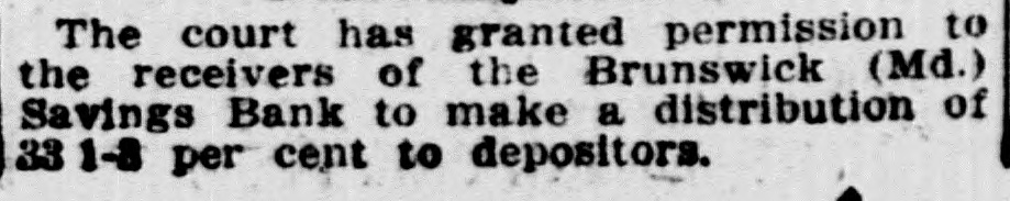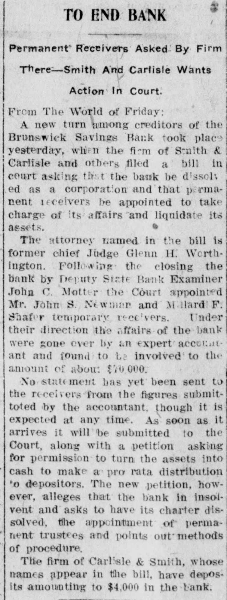 Brunswick Savings Bank Closes Doors. Deputy State Banking Commissioner of Motter the as affairs a result of the of a Brunswick recent examination Savings Bank, ordered a discontinuance of business of that institution, until a full examination of its affairs could be made; when interviewed relative to the matter he said: He was unable to give the amount of loss or precisely when the discrepancy occured. Mr. William Schuaufler, who has been no could cashier give since the idea organization how the irregularities of the bank, crept into the accounts. He was under the care of a physician. Besides Mr. Schnauffer there are employed in the bank two girls and one bookkeeper. The closing of the bank comes as a great surprise in banking circles. The Brunswick bank was organized in 1892 with nine directors. Although no statement has ever been issued it has always been thought the bank was accumulating a surplus along with the healthy growth of deposits. It IS known that the business of the bank has grown considerably. The directors of the bank at present are Dr. A. G. Horine, Messrs, F. E. Alder and William Schnauffer, and it is said they have never held a meeting. The bank was organized when there was no banking law and it is said the methods used in bookkeeping were very loose. There were no stockholders or weekly deposits. The closing of the bank is the result of the new banking law, passed at the recent legislature. The savings banks under it are required to be examined the same as national banks which formerly was not required. Following the examination of the assistant Bank Examiner. Messrs: A. G. Horine, F. G. Alder and wife, and Wm. L. Gross made application to Judge John C. Motter for the appointment of receivers pending an investigation of complications in the bank's accounts, and Messrs. John C. Motter, of I., and John S. Newman have been appointed receivers by the Court under bond of $50,000. The applicants for the appointment of receivers, Messrs. Arlington G. Horne, Frank G. Alder and wife, and William L. Gross, have the following sums deposited in the bank respectively: about $500 non-interest-bearing deposits; about $3300 interest-bearing and between $600 and $700 non-interest bearing deposits; and about $750 of non-interest bearing deposits.