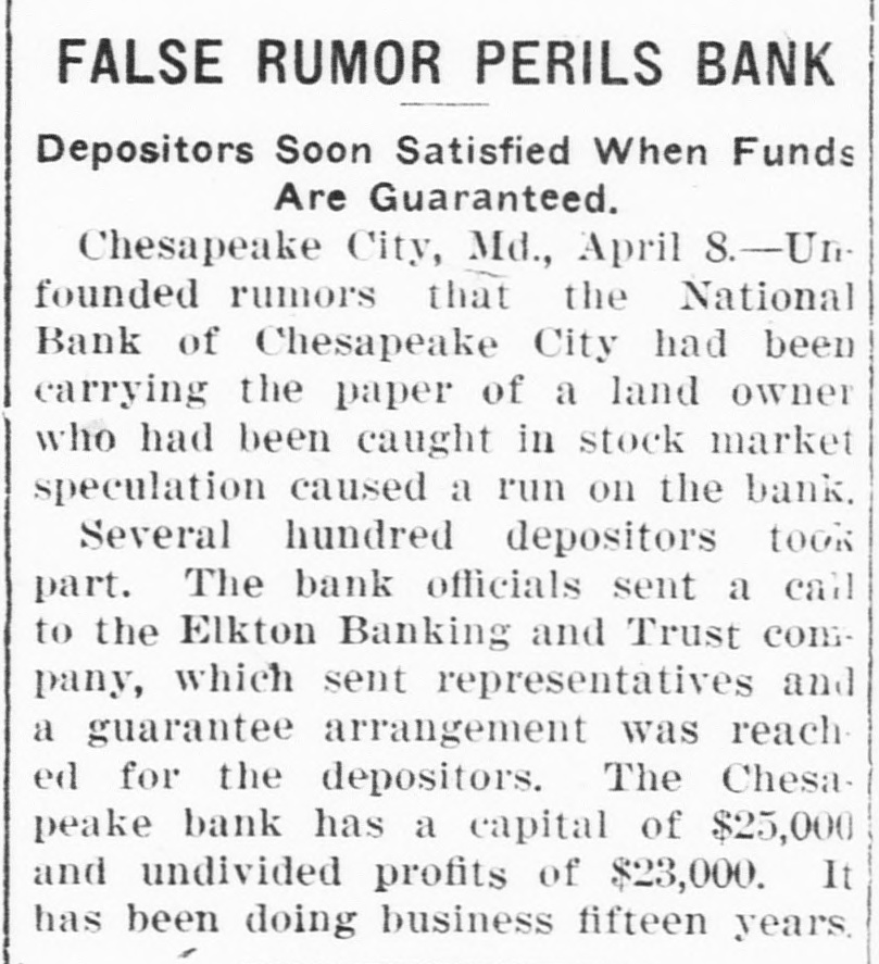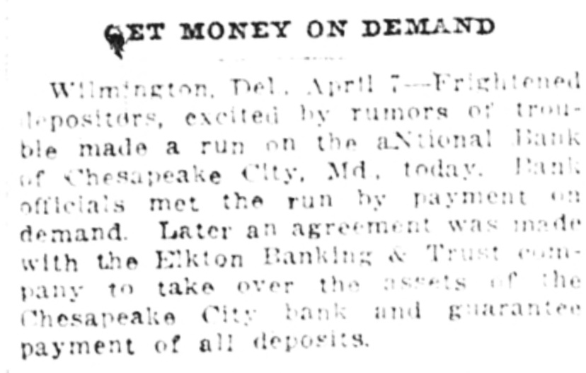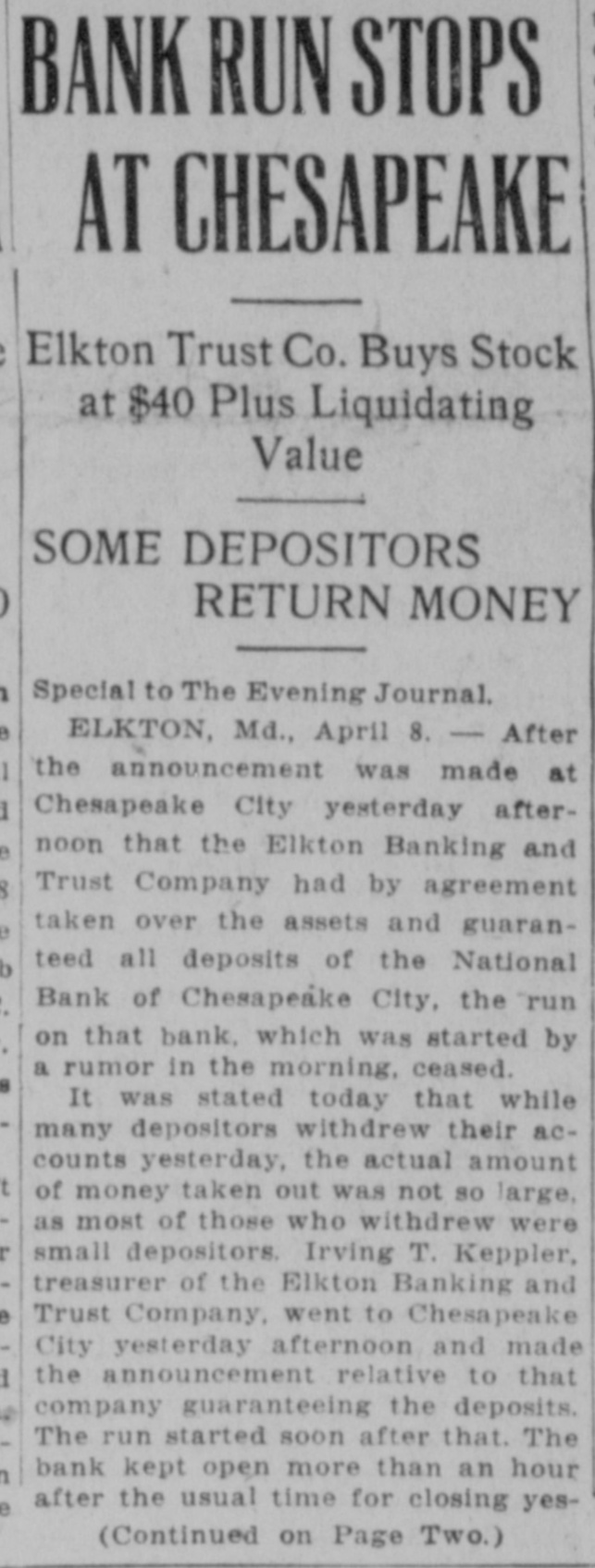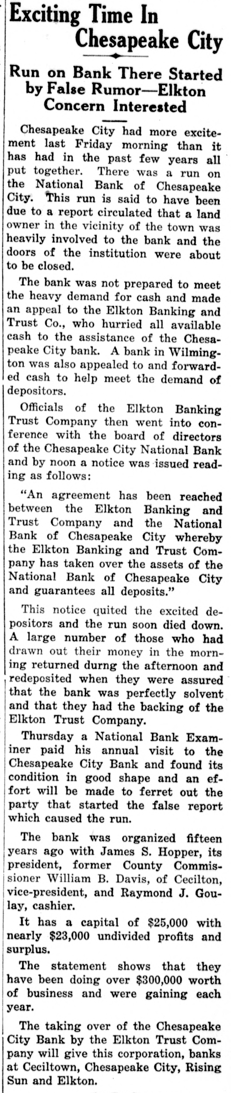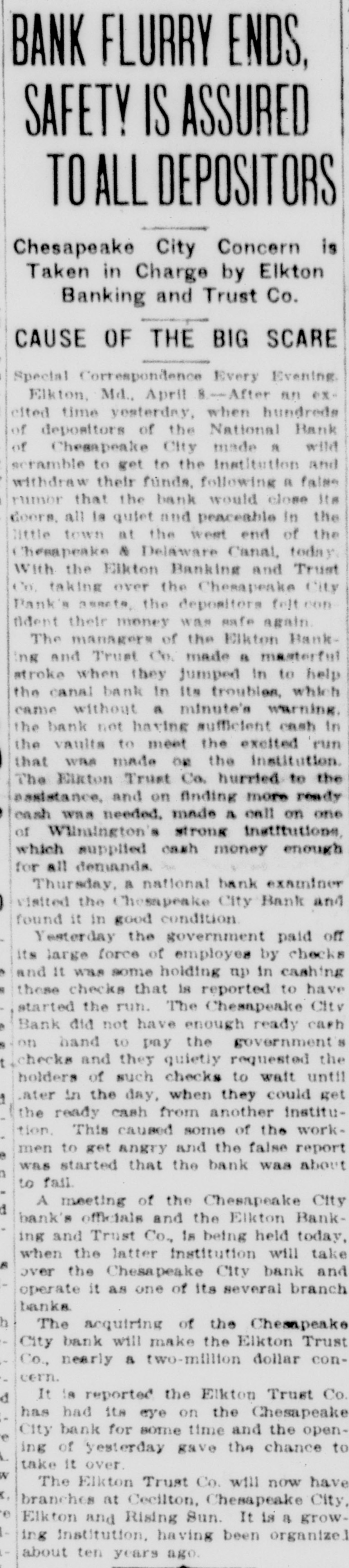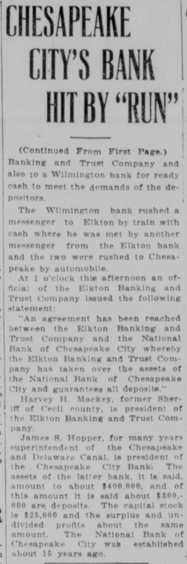 CHESAPEAKE CITY'S BANK HIT BY "RUN' (Continued From First Page.) Banking and Trust Company and also to a Wilmington bank for ready cash to meet the demands of the depositors. The Wilmington bank rushed a messenger to Elkton by train with cash where he was met by another messenger from the Elkton bank and the two were rushed to Chesapeake by automobile. At 1 o'clock this afternoon an official of the Elkton Banking and Trust Company issued the following statement: "An agreement has been reached between the Elkton Banking and Trust Company and the National Bank of Chesapeake City whereby the Elkton Banking and Trust Company has taken over the assets of the National Bank of Chesapeake City and guarantees all deposite." Harvey H. Mackey, former Sheriff of Cecil county, is president of the Elkton Banking and Trust Company. James S. Hopper, for many years superintendent of the Chesapeake and Delaware Canal, is president of the Chesapeake City Bank The assets of the latter bank. it is said. amount to about $400,000. and of this amount It is said about $300.000 are deposits. The capital stock is $25,000 and the surplus and undivided profits about the same amount. The National Bank of Chesapeake City was established about 15 years ago.