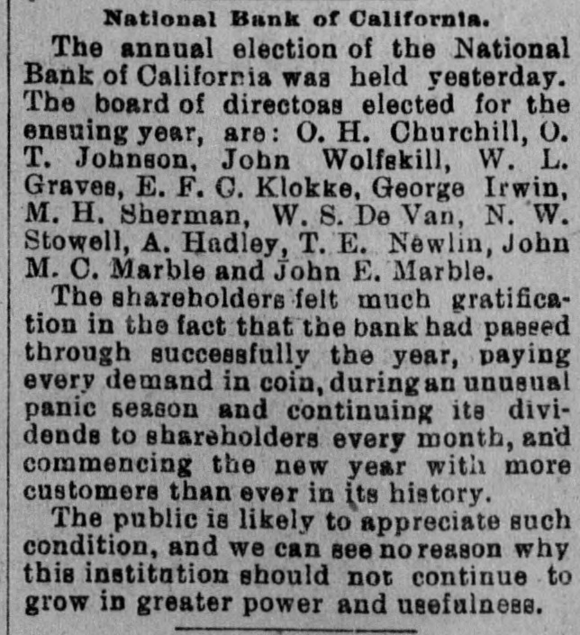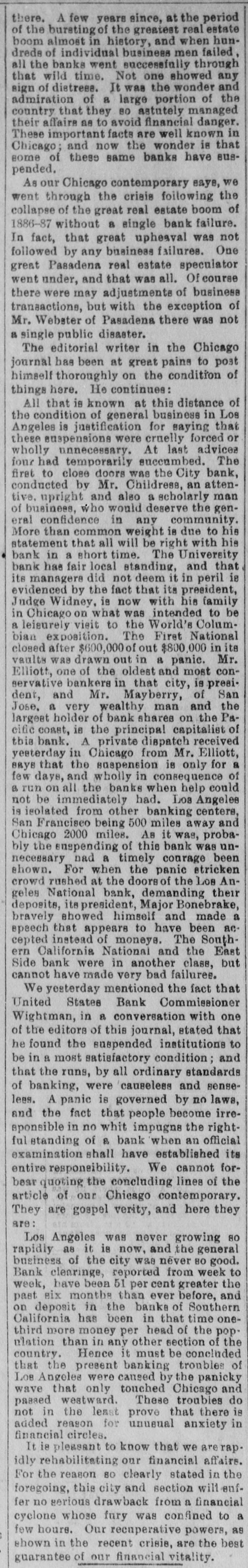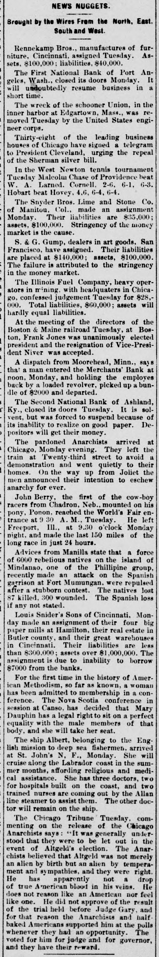 NEWS NUGGETS. Brought by the Wires From the North, East. South and West. Rennekamp Bros., manufactures of furniture, Cincinnati, assigned Tuesday. Assets, $100,000; liabilities, $40,000. National Bank AnIt geles, closed its doors The Wash., First business of Monday. Port in will undoubtedly resume a short time. The wreck of the schooner Union, in the inner at was reharbor Edgartown, United Mass., States engimoved Tuesday by the neer corps. Thirty-eight of the leading business houses of Chicago have signed a telegram to President Cleveland, urging the repeal of the Sherman silver bill. In the West Newton tennis tournament Tuesday Malcolum Chase of Providence beat W. A. Larned. Cornell. 2-6, 6-1, 6-3. Hobart beat Hovey, 4,6, 6-4, 6-4. The Snyder Bros. Lime and Stone Co. of Manitou, Col., made an assignment Monday. Their liabilities are $35,000; assets, $100,000. Stringency of the money market is the cause. G. Gump, dealers in art goods, San have assigned. Francisco, S. Their $100,000. liabilities at $140,000; assets, is attributed to The are placed failure the stringency in the money market. Fuel operators in with The Illinois mining. Company, headquaters heavy in Chicajudgement Total $60,000; 000. go, confessed liabilities, Tuesday assets for $28, will hardly equal liabilities. of the the & Maine railroad Boston At the meeting Tuesday, directors at of Boston, Frank Jones was unanimously elected president and the resignation of Vice-President Niver was accepted. A dispatch from Moorehead, Minn., says entered the Merchants' Bank at and a loaded revolver, up a back that noon, a by Monday, man holding picked the employes bundle of $2000 and departed. National Bank closed its doors The Second Tuesday. of It Ashland, is solbut was forced to of its to realize on paper. vent, Ky. inability suspend good because Depositors will get their money. The pardoned Anarchists arrived at Monday evening. They left the street to and went demonstration train Chicago, at Twenty-third quietly avoid to their a homes. On the way up from Joliet the men announced their intention to eschew anarchy for ever. John Berry, the first of the cow-boy from Chadron, Neb. mounted on his reached the at 9 30 A. M., racers trance pony, Ponon, Tuesday. World's Fair Monday He left enIll., at 9.30 o'clock and made the last 150 night, Freeport, hours. miles of the long race in just 24 from Manilla state a of rebelious natives on Advices 6000 the that island force of Mindanao, one of the Phillipine group, recently made an attack on the Spanish garrison at Fort Mumungan, were repulsed after a stubborn contest. The natives lost 87 killed. 300 wounded. The Spanish loss if any not stated. Louis Snider's Sons of Cincinnati. Monmade an assignment of their four big mills at Hamilton, their in Butler and their great day paper county, real warehouses estate less in Cincinnati. Their liabilities are than $300,000; assets over $1,000,000. The assignment is due to inability to borrow $7000 from the banks. For the first time in the history of American Methodism, so far as known, a woman has been admitted to membership in a conThe Nova Scotia conference in at Canso. has has a legal right to sit on a ference. Dauphin session decided that of perfect Mary that equality with the male members body, and she will take her seat. Albert, belonging to the Eng lish to deep sea The mission ship fishermen, She arrived will at St. John's N. F., Monday. cruise the Labrador coast summer affording religious months, along doctors, in and the mediShe has three two for built on the cal hospitals assistance. coast, by the and Allan two trained nurses are coming out line steamer to assist them. The other doctor will remain on the ship. Chicago Tribune Tuesday, comon the release of Anarchists says It was menting The generally the Chicago understood that were to be out the election. event of they Altgeld's let The in Anarthat Altgeld was an birth but an alien chists alien believed by by not tempera- merely right. ment and sympathies, and they were He has apparently not a drop of true American blood in his veins. He like an American nor feel He did not approve like does one. not reason of Gary, the result and of the trial held before Judge for that reason the Anarchists and half baked Americans supported him at the The polls whenever they had an opportunity. voted for him for judge and for governor, and they have their reward.