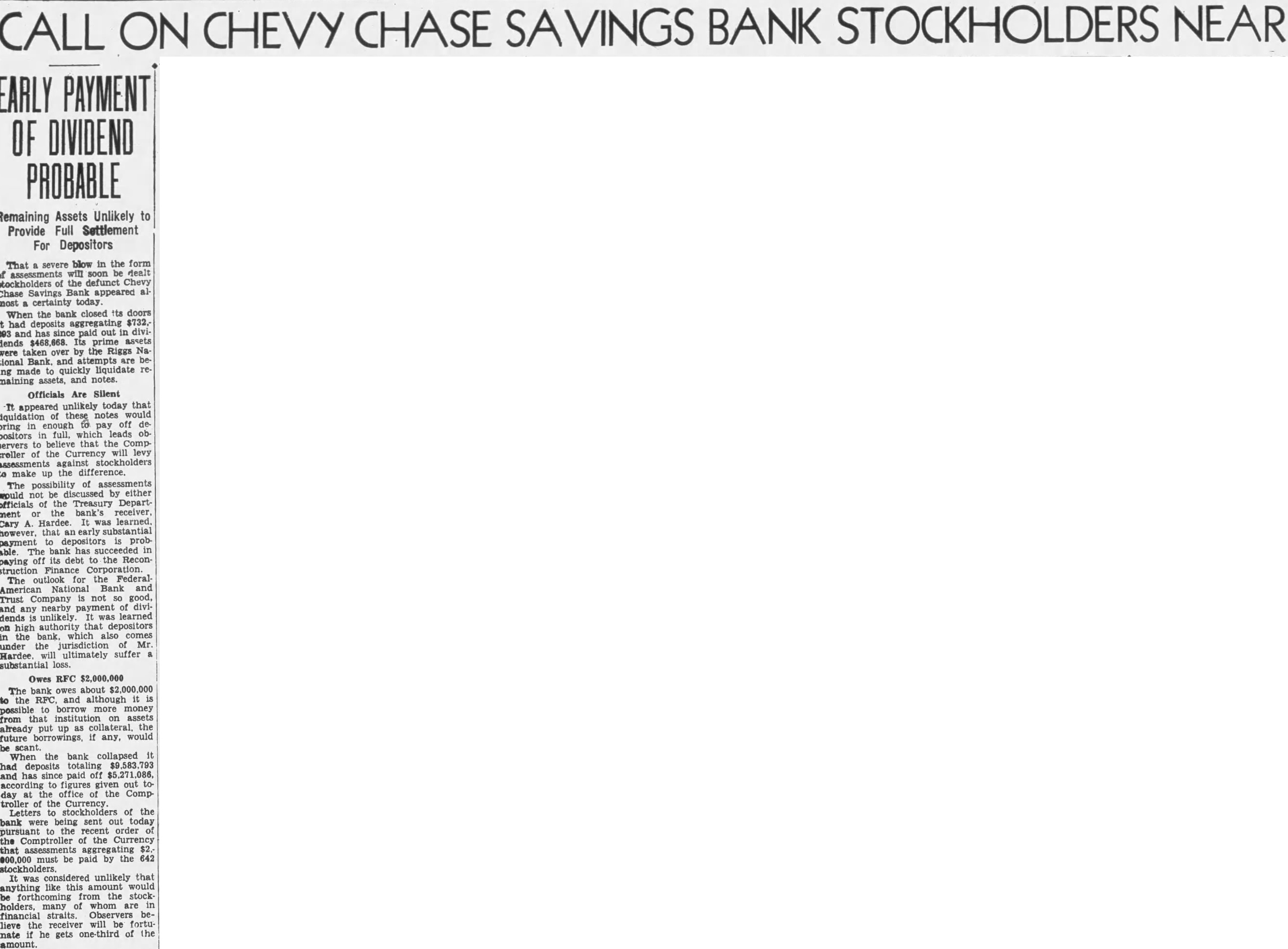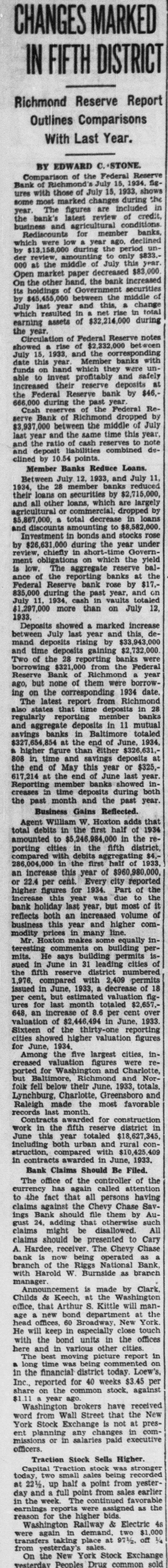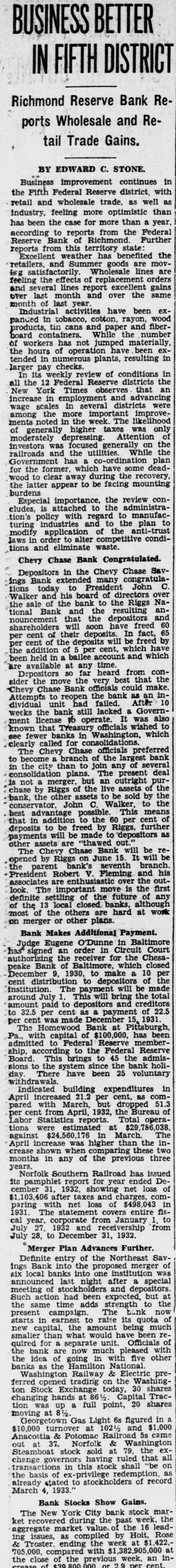 BUSINESS IN FIFTH DISTRICT Richmond Reserve Bank Reports Wholesale and Retail Trade Gains. BY EDWARD C. STONE. Business improvement continues in the Fifth Federal Reserve district with retail and wholesale trade. as well as industry, feeling more optimistic than has been the case for more than a year according to reports from the Federal Further Reserve Bank of Richmond reports from this territory state Excellent weather has benefited the retailers, and Summer goods are movtag satisfactorily Wholesale lines are feeling the effects of replacement orders and several lines report excellent gains over last month and over the same year. of last month Industrial activities have been expanced in tobacco. cotton rayon wood products. tin cans and paper and fiberboard containers While the number of workers has not jumped materially the hours of operation have been ex tended in numerous plants, resulting in larger pay checks In its weekly review of conditions in all the 12 Federal Reserve districts the New York Times observes that an increase employment and advancing wage scales in several districts were among the more important improvements noted in the week The likelihood of generally higher taxes was only moderately depressing Attention of investors was focused generally on the railroads and the utilities While the co-ordination plan has Government for the former which have some deadwood to clear away during the recovery the latter appear to be facing mounting burdens Especial importance, the review concludes attached to the administra tion's policy with regard to manufacturing industries and to the plan to modify application of the anti-trust laws in order to alter competitive conditions and eliminate waste. Chevy Chase Bank Congratulated. Depositors in the Chevy Chase Sav ings Bank extended many congratulaC tions today to President John Walker and his board of directors over the sale of the bank to the Riggs National Bank and the resulting announcement that the depositors and shareholders will soon have freed 60 per cent of their deposits. In fact 65 per cent of the deposits will be freed by the addition of per cent. which have been held in bailee account and which are available at any time Depositors so far heard from con sider the move the very best that the Chevy Chase Bank officials could make Attempts to reopen the bank an in dividual unit had failed After 10 weeks the bank still lacked a Govern ment license to operate It was also known that Treasury officials wished to see fewer banks in Washington, which clearly called for consolidations The Chevy Chase officials preferred to become branch of the largest bank in the city than to join any of several consolidation plans. The present deal is not merger but an outright pur chase by Riggs of the live assets of the bank the other assets to be sold by the conservator, John C Walker to the best advantage possible This means that in addition to the 60 per cent of deposits to be freed by Riggs. further payments will be made to depositors as other assets are 'thawed out. The Chevy Chase Bank will be pened by Riggs on June 15 It will be the parent bank's seventh branch President Robert V. Fleming and his associates are enthusiastic over the outlook. The important move is the first definite settling of the future of any of the 13 local closed banks, although most of the others are hard at WORK on merger or other plans. Bank Makes Additional Payment. Judge Eugene O'Dunne in Baltimore has signed an order in Circuit Court authorizing the receiver for the Chesa peake Bank of Baltimore. which closed December 9. 1930, to make 10 per cent distribution to depositors of the institution. The payment will be made around July 1. This will bring the total amount paid to depositors and creditors to 32.5 per cent as payment of 22.5 per cent was made December 1931 The Homewood Bank at Pittsburgh Pa. with capital of $100,000. has been admitted to Federal Reserve member ship. according to the Federal Reserve Board This brings to 45 the admissions to the system since the bank holidav. There have been 25 voluntary withdrawals Indicated building expenditures in April 21.2 per cent. as compared with March but dropped 51.3 per cent from April, 1932. the Bureau of Labor Statistics reports. Total opera tions were estimated at $29,756,038 against $24,560,176 in March The April increase was higher than the inshown when comparing these two months in any of the previous three years. Norfolk Southern Railroad has issued its pamphlet report for year ended De cember 1932 showing net loss of $1,103,406 after taxes and charges. comin paring with net loss of $498,043 1931 The statement covers entire fiscal year. corporate from January to July 1932 and receivership from July 28, to December 31, 1932 Merger Plan Advances Further. Definite entry of the Northeast Savings Bank into the proposed merger of six local banks into one institution was announced last night after special meeting of stockholders and depositors Such action had been expected, but at the same time adds strength to the present campaign. The bank now starts in earnest to raise its quota of new capital, the amount being much smaller than what would have been required for separate unit. Officials of with pleased much bank now are the the idea of going with five other banks as the Hamilton National preWashington Railway & Electric ferred opened trading on the Washington Stock Exchange today 30 shares changing hands at 861/4 Capital Traction was up full point, 20 shares moving at 8 1/2 a Georgetown Gas Light 6s figured in $10,000 turnover at 1021/2 and $1,000 Anacostia & Potomac Railroad 5s came out 37. Norfolk & Washington Steamboat stock sold at the change governors having ruled that all transactions in this stock shall on as the basis of ex-privilege redempt already stated to stockholders of record March 4, 1933 Bank Stocks Show Gains The New York City bank stock mar ke recovered during the past week the aggregate market