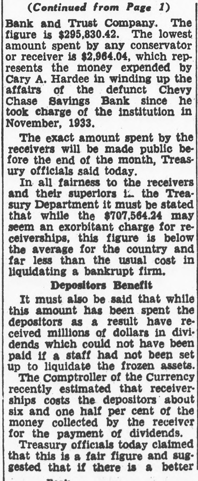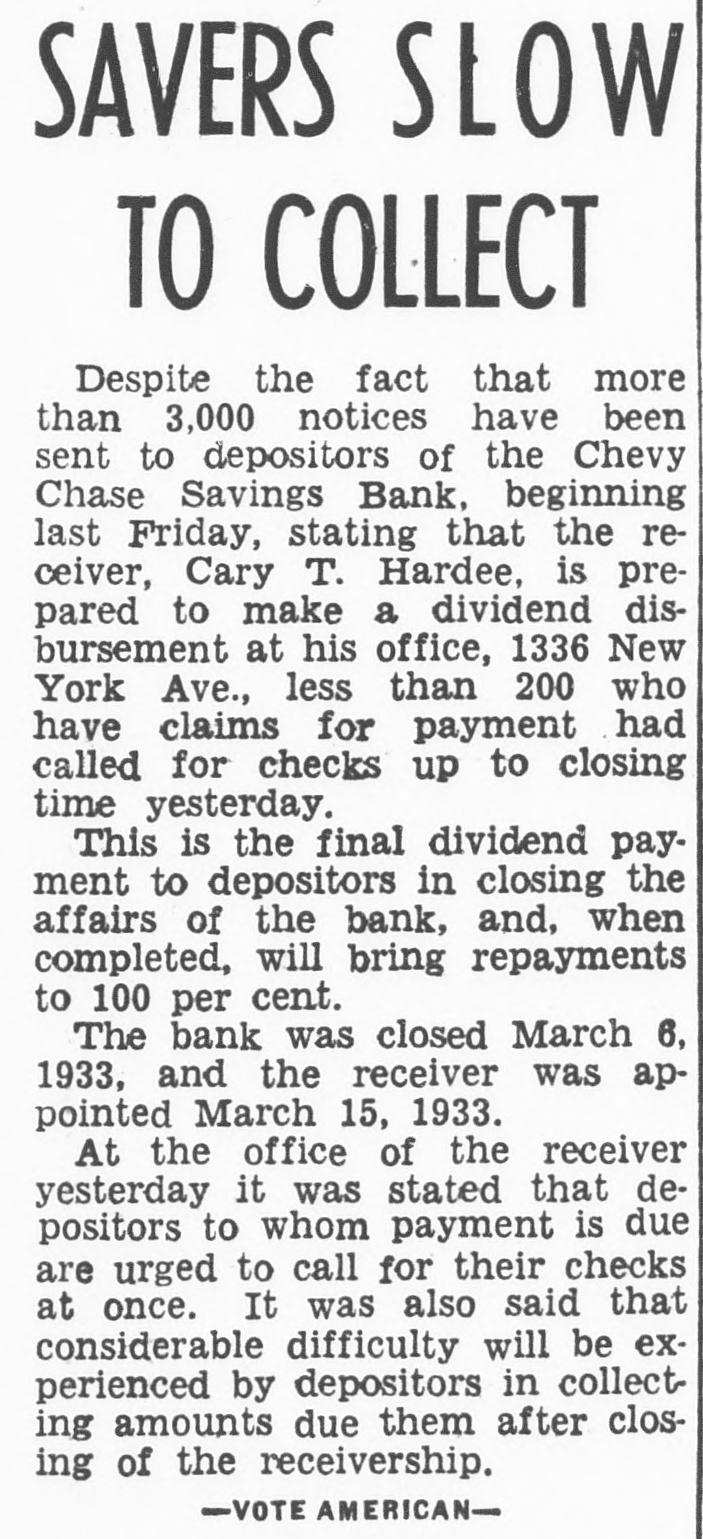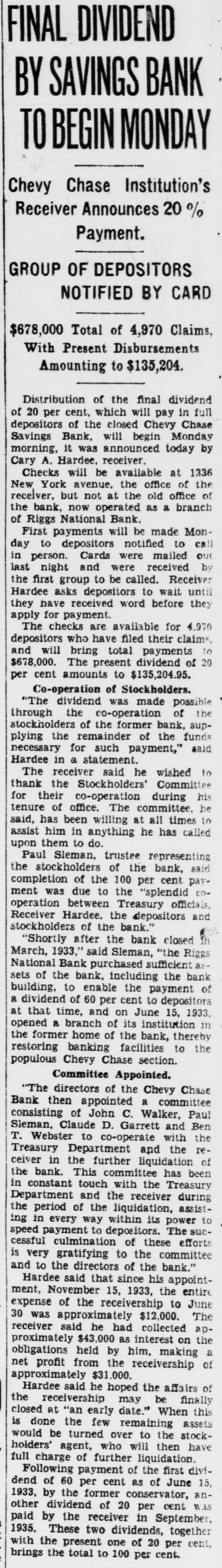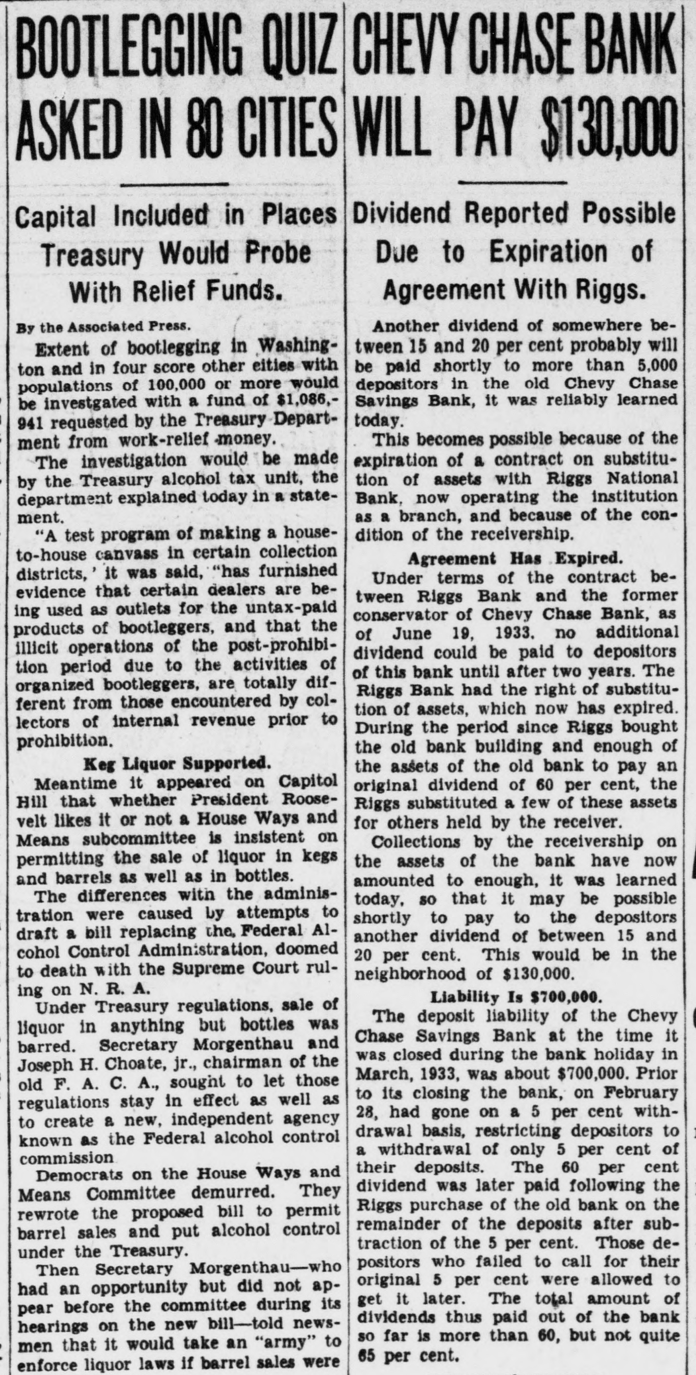 BUSINESS IN FIFTH DISTRICT Richmond Reserve Bank Reports Wholesale and Retail Trade Gains. BY EDWARD C. STONE. Business improvement continues in the Fifth Federal Reserve district with retail and wholesale trade. as well as industry, feeling more optimistic than has been the case for more than a year according to reports from the Federal Further Reserve Bank of Richmond reports from this territory state Excellent weather has benefited the retailers, and Summer goods are movtag satisfactorily Wholesale lines are feeling the effects of replacement orders and several lines report excellent gains over last month and over the same year. of last month Industrial activities have been expanced in tobacco. cotton rayon wood products. tin cans and paper and fiberboard containers While the number of workers has not jumped materially the hours of operation have been ex tended in numerous plants, resulting in larger pay checks In its weekly review of conditions in all the 12 Federal Reserve districts the New York Times observes that an increase employment and advancing wage scales in several districts were among the more important improvements noted in the week The likelihood of generally higher taxes was only moderately depressing Attention of investors was focused generally on the railroads and the utilities While the co-ordination plan has Government for the former which have some deadwood to clear away during the recovery the latter appear to be facing mounting burdens Especial importance, the review concludes attached to the administra tion's policy with regard to manufacturing industries and to the plan to modify application of the anti-trust laws in order to alter competitive conditions and eliminate waste. Chevy Chase Bank Congratulated. Depositors in the Chevy Chase Sav ings Bank extended many congratulaC tions today to President John Walker and his board of directors over the sale of the bank to the Riggs National Bank and the resulting announcement that the depositors and shareholders will soon have freed 60 per cent of their deposits. In fact 65 per cent of the deposits will be freed by the addition of per cent. which have been held in bailee account and which are available at any time Depositors so far heard from con sider the move the very best that the Chevy Chase Bank officials could make Attempts to reopen the bank an in dividual unit had failed After 10 weeks the bank still lacked a Govern ment license to operate It was also known that Treasury officials wished to see fewer banks in Washington, which clearly called for consolidations The Chevy Chase officials preferred to become branch of the largest bank in the city than to join any of several consolidation plans. The present deal is not merger but an outright pur chase by Riggs of the live assets of the bank the other assets to be sold by the conservator, John C Walker to the best advantage possible This means that in addition to the 60 per cent of deposits to be freed by Riggs. further payments will be made to depositors as other assets are 'thawed out. The Chevy Chase Bank will be pened by Riggs on June 15 It will be the parent bank's seventh branch President Robert V. Fleming and his associates are enthusiastic over the outlook. The important move is the first definite settling of the future of any of the 13 local closed banks, although most of the others are hard at WORK on merger or other plans. Bank Makes Additional Payment. Judge Eugene O'Dunne in Baltimore has signed an order in Circuit Court authorizing the receiver for the Chesa peake Bank of Baltimore. which closed December 9. 1930, to make 10 per cent distribution to depositors of the institution. The payment will be made around July 1. This will bring the total amount paid to depositors and creditors to 32.5 per cent as payment of 22.5 per cent was made December 1931 The Homewood Bank at Pittsburgh Pa. with capital of $100,000. has been admitted to Federal Reserve member ship. according to the Federal Reserve Board This brings to 45 the admissions to the system since the bank holidav. There have been 25 voluntary withdrawals Indicated building expenditures in April 21.2 per cent. as compared with March but dropped 51.3 per cent from April, 1932. the Bureau of Labor Statistics reports. Total opera tions were estimated at $29,756,038 against $24,560,176 in March The April increase was higher than the inshown when comparing these two months in any of the previous three years. Norfolk Southern Railroad has issued its pamphlet report for year ended De cember 1932 showing net loss of $1,103,406 after taxes and charges. comin paring with net loss of $498,043 1931 The statement covers entire fiscal year. corporate from January to July 1932 and receivership from July 28, to December 31, 1932 Merger Plan Advances Further. Definite entry of the Northeast Savings Bank into the proposed merger of six local banks into one institution was announced last night after special meeting of stockholders and depositors Such action had been expected, but at the same time adds strength to the present campaign. The bank now starts in earnest to raise its quota of new capital, the amount being much smaller than what would have been required for separate unit. Officials of with pleased much bank now are the the idea of going with five other banks as the Hamilton National preWashington Railway & Electric ferred opened trading on the Washington Stock Exchange today 30 shares changing hands at 861/4 Capital Traction was up full point, 20 shares moving at 8 1/2 a Georgetown Gas Light 6s figured in $10,000 turnover at 1021/2 and $1,000 Anacostia & Potomac Railroad 5s came out 37. Norfolk & Washington Steamboat stock sold at the change governors having ruled that all transactions in this stock shall on as the basis of ex-privilege redempt already stated to stockholders of record March 4, 1933 Bank Stocks Show Gains The New York City bank stock mar ke recovered during the past week the aggregate market