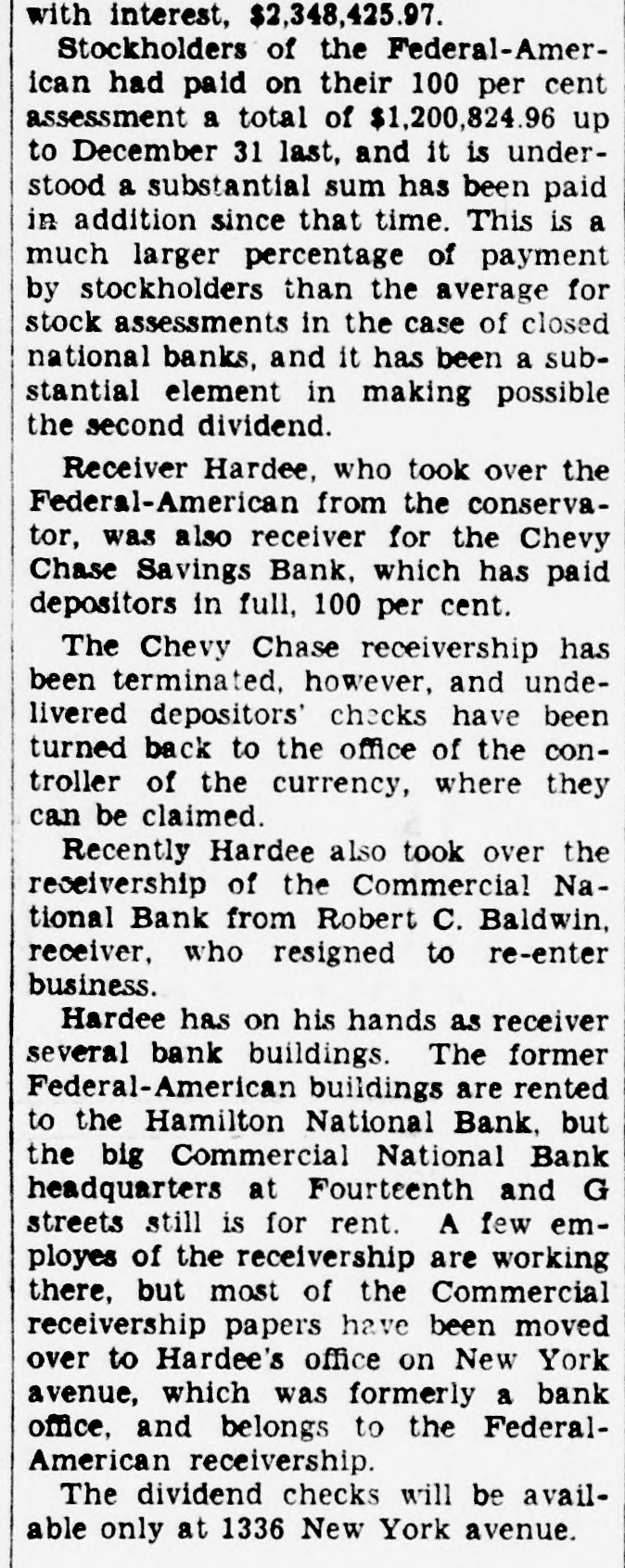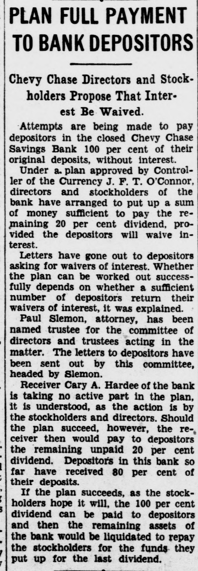PLAN FULL PAYMENT TO BANK DEPOSITORS Chevy Chase Directors and Stockholders Propose That Interest Be Waived. Attempts are being made to pay depositors in the closed Chevy Chase Savings Bank 100 per cent of their original deposits, without interest. Under a. plan approved by Controller of the Currency J. F. T. O'Connor, directors and stockholders of the bank have arranged to put up a sum of money sufficient to pay the remaining 20 per cent dividend, provided the depositors will waive interest. Letters have gone out to depositors asking for waivers of interest. Whether the plan can be worked out successfully depends on whether a sufficient number of depositors return their waivers of interest, it was explained. Paul Slemon, attorney, has been named trustee for the committee of directors and trustees acting in the matter. The letters to depositors have been sent out by this committee, headed by Slemon. Receiver Cary A. Hardee of the bank is taking no active part in the plan, it is understood, as the action is by the stockholders and directors. Should the plan succeed, however, the re-, ceiver then would pay to depositors the remaining unpaid 20 per cent dividend. Depositors in this bank so far have received 80 per cent of their deposits. If the plan succeeds, as the stockholders hope it will, the 100 per cent dividend can be paid to depositors and then the remaining assets of the bank would be liquidated to repay the stockholders for the funds they put up for the last dividend.
