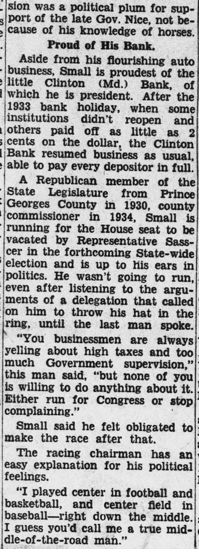 sion was a political plum for support of the late Gov. Nice, not because of his knowledge of horses. Proud of His Bank. Aside from his flourishing auto business, Small is proudest of the little Clinton (Md.) Bank, of which he is president. After the 1933 bank holiday, when some institutions didn't reopen and others paid off as little as 2 cents on the dollar, the Clinton Bank resumed business as usual, able to pay every depositor in full. A Republican member of the State Legislature from Prince Georges County in 1930, county commissioner in 1934, Small is running for the House seat to be vacated by Representative Sasscer in the forthcoming State-wide election and is up to his ears in politics. He wasn't going to run, even after listening to the arguments of a delegation that called on him to throw his hat in the ring, until the last man spoke. "You businessmen are always yelling about high taxes and too much Government supervision," this man said, "but none of you is willing to do anything about it. Either run for Congress or stop complaining." Small said he felt obligated to make the race after that. The racing chairman has an easy explanation for his political feelings. "I played center in football and basketball, and center field in baseball-right down the middle. I guess you'd call me a true middle-of-the-road man."