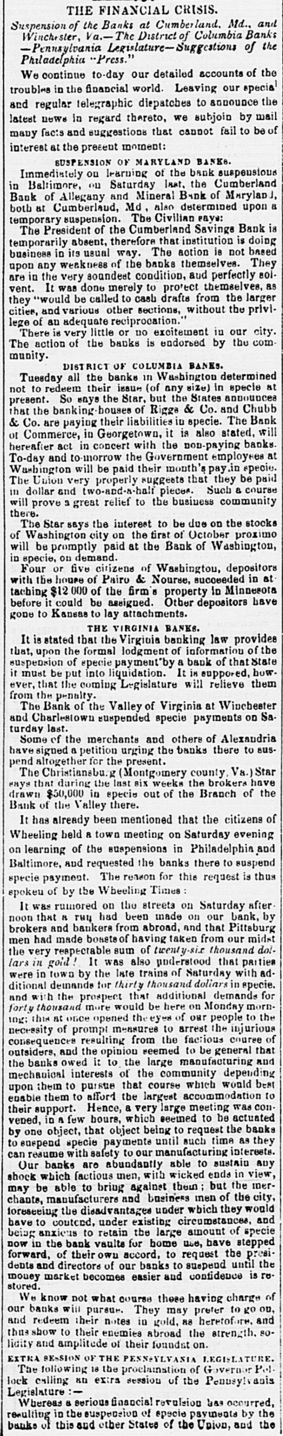 THE FINANCIAL CRISIS. Suspension of the Banks at Cumberland, Md., and Winchister, Va.- The District of Columbia Banks -Pennsylvania Legislature-Suggestions of the Phrladelphia "Press." We continue to-day our detailed accounts of the troubles in the financial world. Leaving our special and regular telegraphic dispatches to announce the latest news in regard thereto, we subjoin by mail many facts and suggestions that cannot fail to be of interest at the present moment: BUSPENSION OF MARYLAND BANKS. Immediately on learning of the bank suspensions in Baltimore, on Saturday last, the Cumberland Bank of Allegany and Mineral Bank of Marylan 1, both at Cumberlaud, Md, also determined upon a temporary suspension. The Civilian says: The President of the Cumberland Savings Bank is temporarily absent, therefore that institution is doing business in its usual way. The action is not based upon any weakness of the banks themselves. They are in the very soundest condition, aud perfectly solvent. It was done merely to protect themselves, as they "would be called to cash drafts from the larger cities, and various other sections, without the privilege of an adequate reciprocation." There is very little or no excitement in our city. The action of the banks is endorsed by the community. DISTRICT OF COLUMBIA BANKS. Tuesday all the banks in Washington determined not to redeem their issue (of any size) in specie at present. So says the Star, but the States announces that the banking-bouses of Rigge & Co. and Chubb & Co. are paying their liabilities in specie. The Bank of Commerce, in Georgetown, it is also stated, will hereafter act in concert with the non-paying banks. To-day and to-morrow the Government employees at Washington will be paid their month's pay in specie. The Union very properly suggests that they be paid in dollar and two-and-a-half pieces. Such a course will prove a great relief to the business community there. The Star says the interest to be due on the stocks of Washington city on the tirst of October proximo will be promptly paid at the Bank of Washington, in specie, on demand. Four or five citizens of Washington, depositors with the house of Pairo & Nourse, succeeded in at taching $12 000 of the firm's property in Minnesota before it could be assigned. Other depositors have gone to Kansas to lay attachments. THE VIRGINIA BANKS. It is stated that the Virgioia banking law provides that, upon the formal lodgment of information of the suspension of specie payment'by a bank of that State it must be put into liquidation. It in suppored, how. ever, that the coming Legislature will relieve them from the penalty. The Bank of the Valley of Virginia at Winchester and Charlestown suspended specie payments on Saturday last. Some of the merchants and others of Alexandria have signed a petition urging the banks there to suspend altogether for the present. The Christiansbu. (Montgomery county, Va.) Star says that during the last six weeks the brokers have drawn $50,000 in specie out of the Branch of the Bank of the Valley there. It has already been mentioned that the citizens of Wheeling held a town meeting on Saturday evening on learning of the suspensions in Philadelphia and Baltimore, and requested the banks there to suspend specie payment. The reason for this request is thus spoken of by the Wheeling Times It was rumored on the streets on Saturday after. noon that 8 THU had been made on our bank, by brokers and bankers from abroad, and that Pittsburg men had made boasts of having taken from our midst the very respectable sum of twenty-six thousand dollars in gold! It was also understood that parties were in town by the late trains of Saturday with additional demands for thirty thousand dollars in specie. and with the prospect that additional demands for forty thousand more would be here on Monday morning: this at once opened the eyes of our people to the necessity of prompt measures to arrest the injurious consequences resulting from the factious course of outsiders, and the opinion seemed to be general that the banks owed it to the large manufacturing and mechanical interests of the community depending upon them to pursue that course which would best enable them to afford the largest accommodation to their support. Hence, a very large meeting was convened, in A few hours, which seemed to be actuated by one object, that object being to request the banks to suspend specie payments until such time as they can resume with safety to our manufacturing interests. Our banks are abundantly able to sustain any shock which factious men, with wicked ends in view, may be able to bring against their but the merchants, manufacturers and business men of the city, foreseeing the disadvantages under which they would have to coutend, under existing circumstances, and being anxieus to retain the large amount of specie now in the bank vaults for home use, have stepped forward, of their own accord, to request the presidents and directors of our banks to suspend until the money market becomes easier and confidence is restored. We know not what course these having charge of our banks will pursue. They may prefer to go on, and redeem their notes in gold, 88 heretofore, and thus show to their enemies abroad the strength. solidity and amplitude of their foundat on. EXTRA SESSION OF THE PENNSYLVANIA LEGISLATURE. The following 18 the proclamation of Governor Pol. lock calling 80 extra session of the Pennsylv anis Legislature :Whereas 8 serious financial revulsion has occurred, resulting in the suspension of specie payments by the banks of this and other States of the Union, and the
