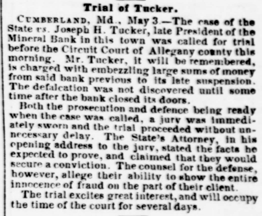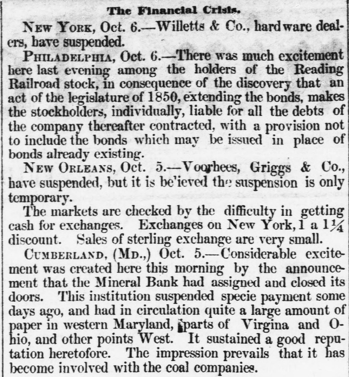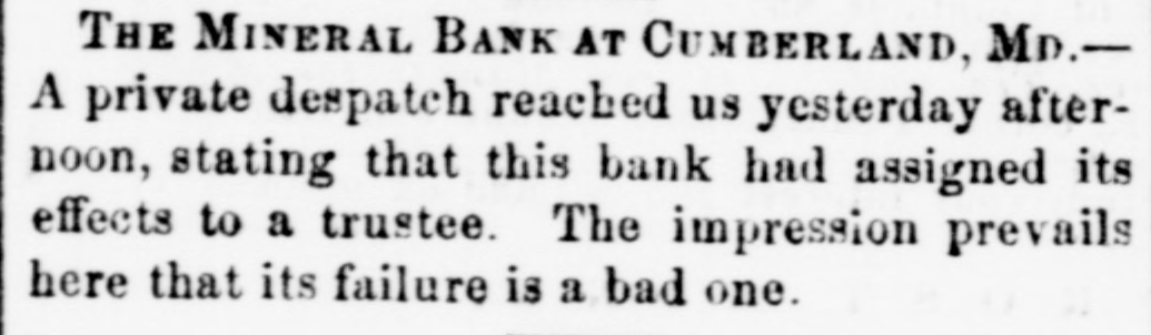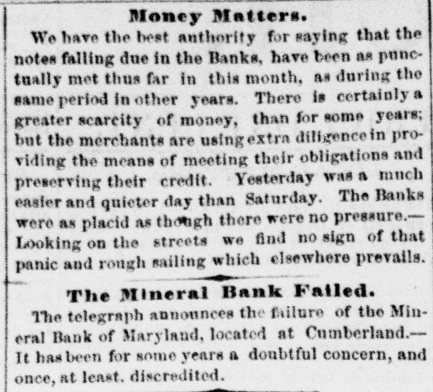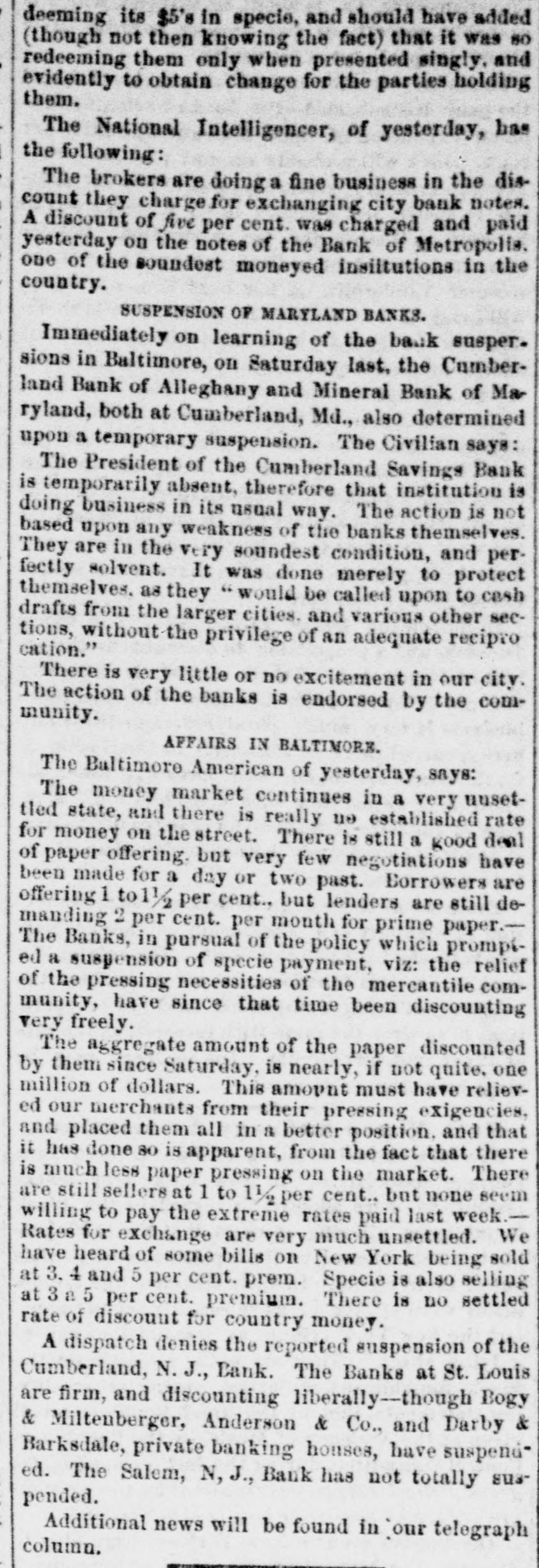deeming its $5's in specie, and should have added not then knowing the them when presented redeeming (though only fact) that singly. it was and so evidently to obtain change for the parties holding them. The National Intelligencer, of yesterday, has the following: The brokers are doing a fine business in the discount they charge for exchanging city bank notes. A discount of five per cent. was charged and paid yesterday on the notes of the Bank of Metropolis. one of the soundest moneyed institutions in the country. SUSPENSION OF MARYLAND BANKS. Immediately on learning of the back susper. sions in Baltimore, on Saturday last, the Cumberland Bank of Alleghany and Mineral Bank of Ma ryland, both at Cumberland, Md., also determined upon a temporary suspension. The Civilian says: The President of the Cumberland Savings Bank is temporarily absent. therefore that institution is doing business in its usual way. The action is not based upon any weakness of the banks themselves. They are in the Very soundest condition, and perfectly solvent. It was done merely to protect themselves. as they "would be called upon to cash drafts from the larger cities. and various other sections, without the privilege of an adequate recipro cation." There is very little or no excitement in our city. The action of the banks is endorsed by the community. AFFAIRS IN BALTIMORE. The Bultimore American of yesterday, says: The money market continues in a very uusettled state, and there is really no established rate for money on the street. There is still a good deal of paper offering. but very few negotiations have been made for a day or two past. Borrowers are offering 1 to 11/2 per cent., but lenders are still demanding 2 per cent. per month for prime paper.The Banks, in pursual of the policy which prompted a suspension of specie payment, viz: the relief of the pressing necessities of the mercantile community, have since that time been discounting very freely. The aggregate amount of the paper discounted by them since Saturday, is nearly, if not quite. one million of dollars. This amount must have relieved our merchants from their pressing exigencies, and placed them all in a better position. and that it has done so is apparent, from the fact that there is much less paper pressing on the market. There are still sellers at 1 to 11/2 per cent.. but none seem willing to pay the extreme rates paid last week.Rates for exchange are very much unsettled. We have heard of some bills on New York being sold at 3. 4 and 5 per cent. prem. Specie is also selling at 3 a 5 per cent. premium. There is no settled rate of discount for country money. A dispatch denies the reported suspension of the Cumberland, N. J., Bank. The Banks at St. Louis are firm, and discounting liberally--though Bogy & Miltenberger, Anderson & Co., and Darby & Barksdale, private banking houses, have suspended. The Salem, N, J., Bank has not totally suapended. Additional news will be found in `our telegraph column.