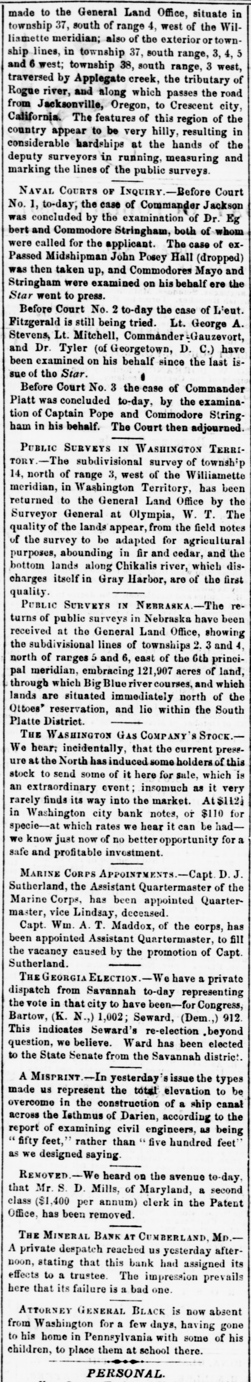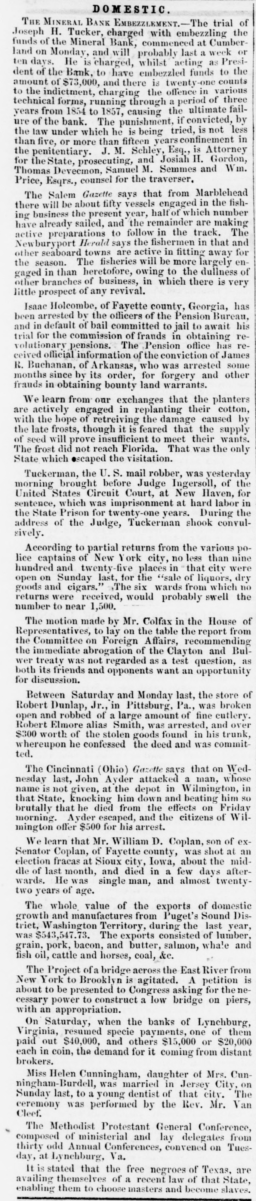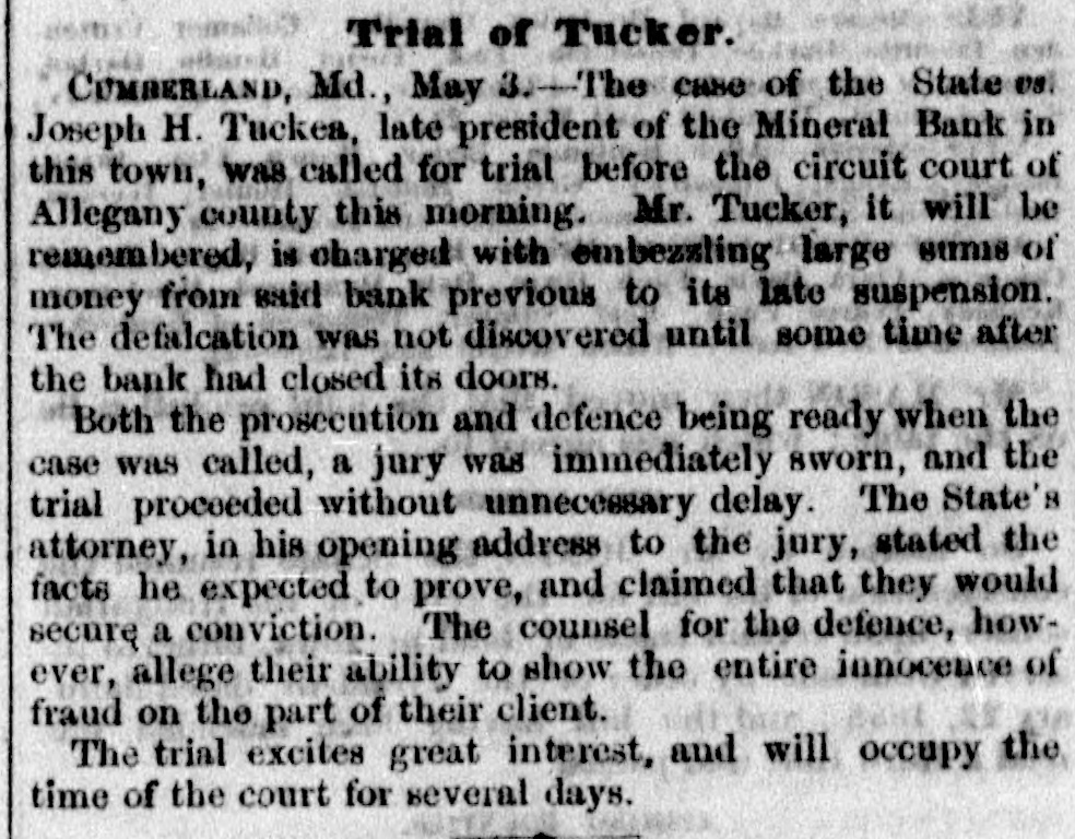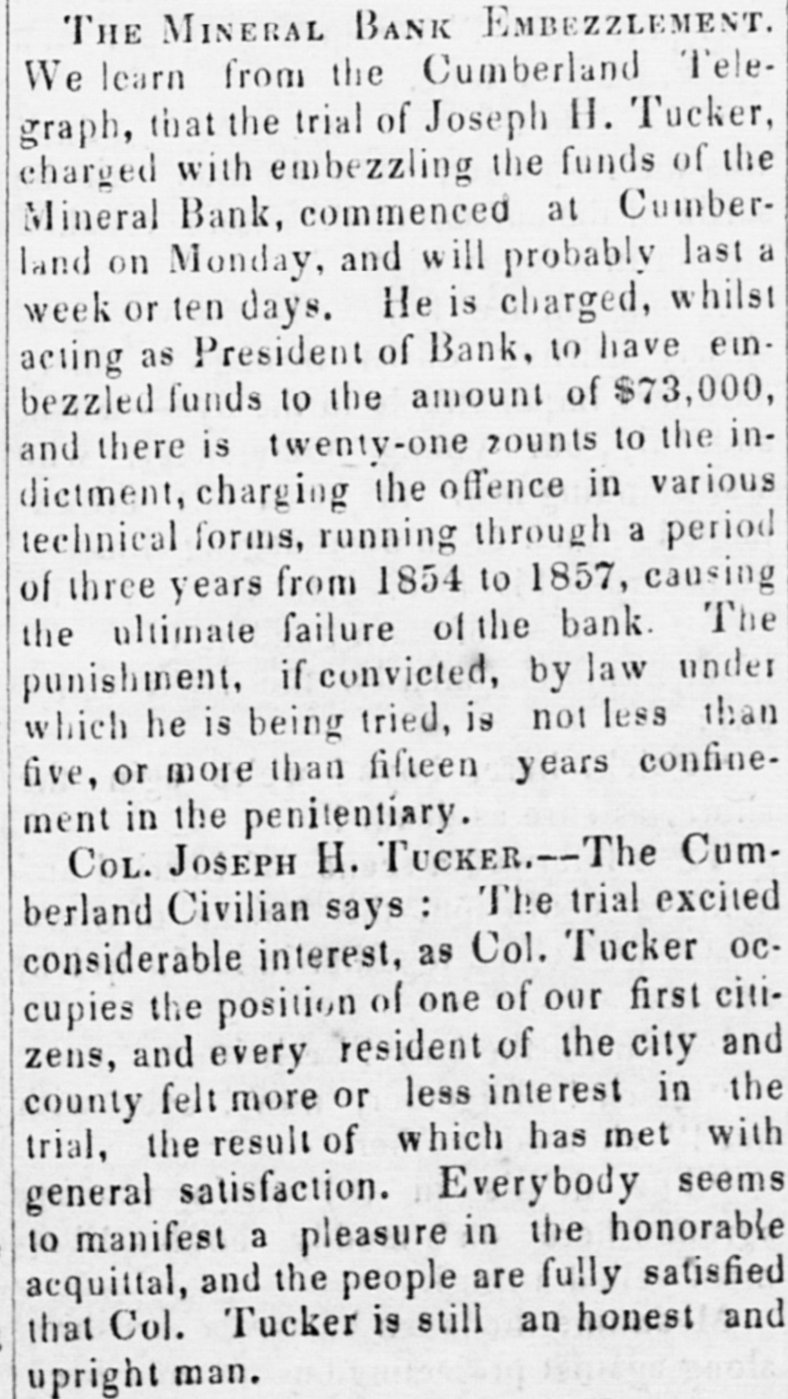 deeming its $5's in specie, and should have added not then knowing the them when presented redeeming (though only fact) that singly. it was and so evidently to obtain change for the parties holding them. The National Intelligencer, of yesterday, has the following: The brokers are doing a fine business in the discount they charge for exchanging city bank notes. A discount of five per cent. was charged and paid yesterday on the notes of the Bank of Metropolis. one of the soundest moneyed institutions in the country. SUSPENSION OF MARYLAND BANKS. Immediately on learning of the back susper. sions in Baltimore, on Saturday last, the Cumberland Bank of Alleghany and Mineral Bank of Ma ryland, both at Cumberland, Md., also determined upon a temporary suspension. The Civilian says: The President of the Cumberland Savings Bank is temporarily absent. therefore that institution is doing business in its usual way. The action is not based upon any weakness of the banks themselves. They are in the Very soundest condition, and perfectly solvent. It was done merely to protect themselves. as they "would be called upon to cash drafts from the larger cities. and various other sections, without the privilege of an adequate recipro cation." There is very little or no excitement in our city. The action of the banks is endorsed by the community. AFFAIRS IN BALTIMORE. The Bultimore American of yesterday, says: The money market continues in a very uusettled state, and there is really no established rate for money on the street. There is still a good deal of paper offering. but very few negotiations have been made for a day or two past. Borrowers are offering 1 to 11/2 per cent., but lenders are still demanding 2 per cent. per month for prime paper.The Banks, in pursual of the policy which prompted a suspension of specie payment, viz: the relief of the pressing necessities of the mercantile community, have since that time been discounting very freely. The aggregate amount of the paper discounted by them since Saturday, is nearly, if not quite. one million of dollars. This amount must have relieved our merchants from their pressing exigencies, and placed them all in a better position. and that it has done so is apparent, from the fact that there is much less paper pressing on the market. There are still sellers at 1 to 11/2 per cent.. but none seem willing to pay the extreme rates paid last week.Rates for exchange are very much unsettled. We have heard of some bills on New York being sold at 3. 4 and 5 per cent. prem. Specie is also selling at 3 a 5 per cent. premium. There is no settled rate of discount for country money. A dispatch denies the reported suspension of the Cumberland, N. J., Bank. The Banks at St. Louis are firm, and discounting liberally--though Bogy & Miltenberger, Anderson & Co., and Darby & Barksdale, private banking houses, have suspended. The Salem, N, J., Bank has not totally suapended. Additional news will be found in `our telegraph column.
