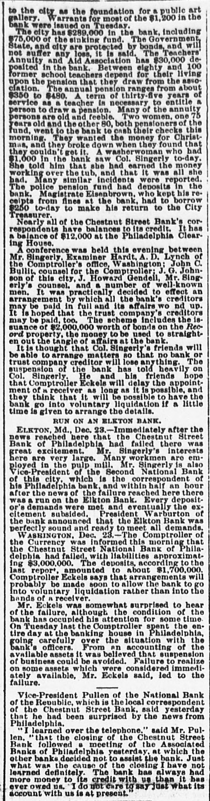 to the city as the foundation for a public art gallery. Warrants for most of the $1,200 in the bank were issued on Tuesday. The city has $289,000 in the bank, including $75,000 of the sinking fund. The Government, State, and city are protected by bonds, and will not suffer any loss, it is said. The Teachers' Annuity and Aid Association has $30,000 deposited in the bank. Between eighty and 100 former school teachers depend for their living upon the pension that they draw from the assoclation. The annual pension ranges from about 8350 to $480. A term of thirty-five years of service as a teacher in necessary to entitle a person to draw a pension. Many of the annuity persons are old and feeble. Two women. one 75 years old and the other 80, both pensioners of the fund, went to the bank to cash their checks this morning. They wanted the money for Christmas, and they broke down when they found that they couldn't get it. A washerwoman who had $1,000 In the bank saw Col. Singerly to-day. She told him that she had earned the money working over the tub, and that it was all she had. Many similar incidents were reported. The police pension fund had deposits In the bank. Magistrate Eisenbrown, who kept his receipts from fines at the bank, had to borrow $250 to-day to make his return to the City Treasurer. Nearly all of the Chestnut Street Bank's correspondents have balances to its credit. It has a balance of $12,000 at the Philadelphia Clearing House. A conference was held this evening between Mr. Singerly. Examiner Hardt. A. D. Lynch of the Comptroller's office, Washington; John C. Bullit, counsel for the Comptroller; J. G. Johnson of this city, J. Howard Gendell, Mr. Singerly's counsel. and a number of well-known men. It was practically decided to effect an arrangement by which all the bank's creditors may be paid in full and its affairs wo nd up. It is hoped that the trust company's creditors may be paid, too. The scheme includes the issuance of $2,000,000 worth of bonds on the Record property, the money to be used to straighten out the tangle of affairs at the bank. It is thought that Col. Singerly's friends will be able to arrange matters 80 that no bank or trust company creditor will lose anything. The suspension of the bank has told heavily on Col. Singerly. He and his friends hope that Comptroller Eckels will delay the appointment of is receiver as long as it is possible, and they think that it will be possible to have the bank go into voluntary liquidation if a little time is given to arrange the details. RUN ON AN ELETON BANK. ELKTON, Md., Dec. 23.-Immediately after the news reached here that the Chestnut Street Bank of Philadelphia had failed there was great excitement. Mr. Singerly's interests here are very large. Many workmen are employed in the pulp mill. Mr. Singerly is also Vice-President of the Second National Bank of this city, which is the correspondent of his Philadelphia bank, and within half an hour after the news of the failure reached here there was a run on the Elkton Bank. Every depositor's demands were met and eventually the excitement subsided. President Warburton of the bank announced that the Elkton Bank was perfectly sound and ready to meet all demands. VASHINGTON, Dec. 23.-The Comptroller of the Currency was informed this morning that the Chestnut Street National Bank of Philadelphia had failed. with liabilities approximating $3,000,000. The deposits, according to the last report, amounted to about $1,700,000. Comptroller Eckels says that arrangements will probably be made soon to allow the bank to go into voluntary liquidation rather than into the hands of a receiver. Mr. Eckels was somewhat surprised to hear of the failure, although the condition of the bank has occupied his attention for some time. On Tuesday last the Comptroller spent the entire day at the banking house in Philadelphia, going carefully over the situation with the bank's officers. From an accounting of the available assets it was believed that suspension of business could be avoided. Failure to realize on some assets which were considered immediately available, Mr. Eckels said, led to the failure. Vice-President Pullen of the National Bank of the Republic, which is the local correspondent of the Chestnut Street Bank, said yesterday that he had been surprised by the news from Philadelphia. "I learned over the telephone." said Mr. Pullen. that the closing of the Chestnut Street Bank followed a meeting of the Associated Banks of Philadelphia yesterday. at which the other banks decided not to assist the bank. Just what was the cause of the closing I have not learned definitely. The bank has always had more money to its credit with us than it has ever owed us. I do not care to say just what its account with us is at present.