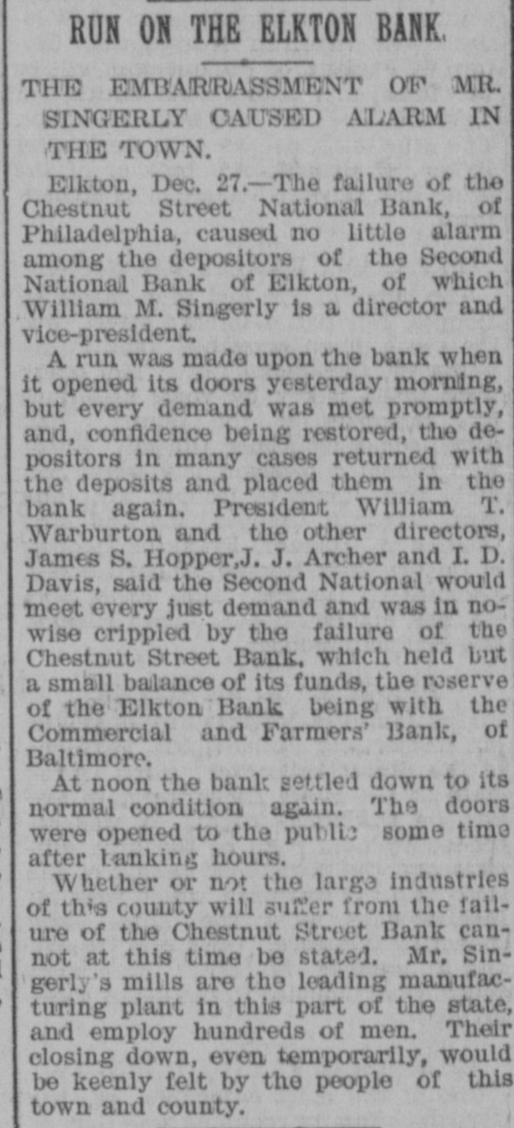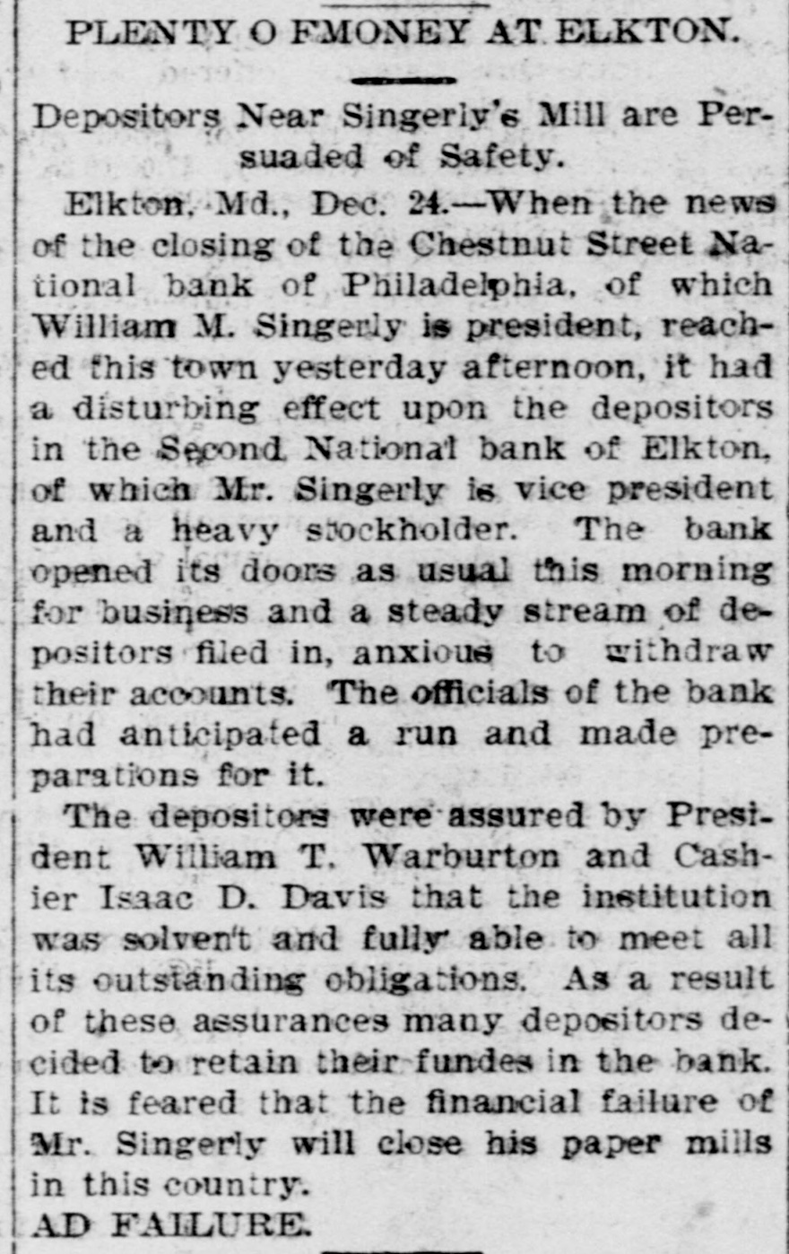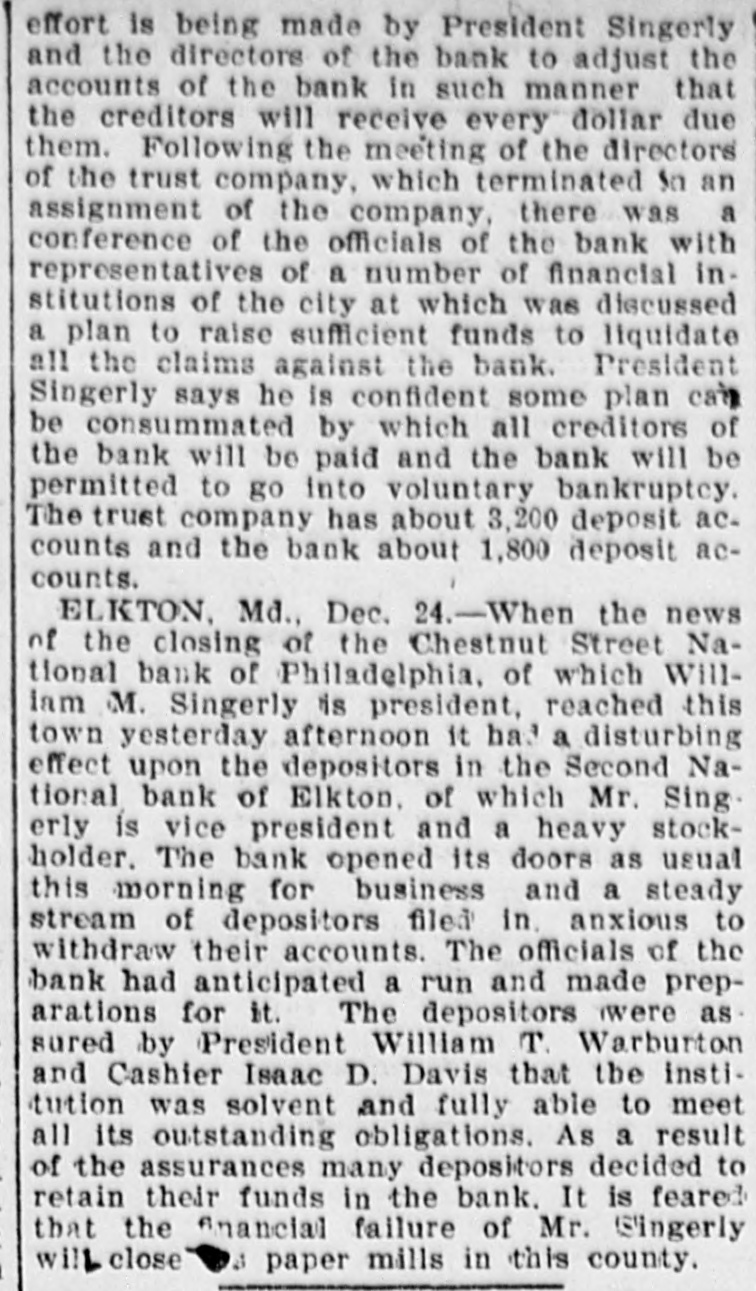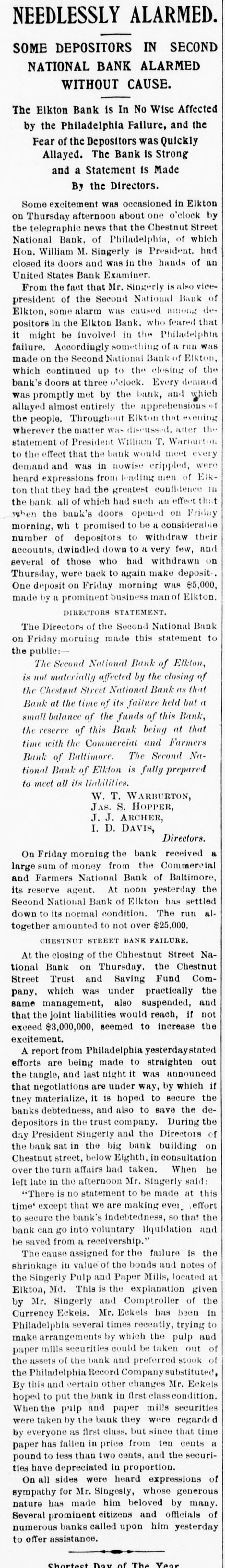 SOME DEPOSITORS IN SECOND NATIONAL BANK ALARMED WITHOUT CAUSE. The Elkton Bank is In No Wise Affected by the Philadelphia Failure, and the Fear of the Depositors was Quickly Allayed. The Bank is Strong and a Statement is Made By the Directors. Some excitement was occasioned in Elkton on Thursday afternoon about one o'clock by the telegraphic news that the Chestnut Street National Bank, of Philadelphia, of which Hon. William M. Singerly is President. had closed its doors and was in the hands of an United States Bank Examiner. From the fact that Mr. Singerly is also vicepresident of the Second National Bank of Elkton, some alarm was caused among depositors In the Elkton Bank. who feared that it might be involved in the Philadelphia failure. Accordingly something of a run was made on the Second National Bank of Elkton, which continued up to the closing of the bank's doors at three o'clock. Every demand was promptly met by the bank, and which allayed almost entirely the apprehensions of the people. Throughout Elkton that evening wherever the matter was discussed. after the statement of President William T. Warburton to the effect that the bank would meet every demand and was in nowise crippled. were heard expressions from leading men of Elkton that they had the greatest confidence 111 the bank all of which had such an effect that when the bank's doors opened on Friday morning, wh t promised to be a considerable number of depositors to withdraw their accounts, dwindled down to a very few, and several of those who had withdrawn on Thursday, were back to again make deposit. One deposit on Friday morning was 85,000, made by a prominent business man of Elkton. DIRECTORS STATEMENT. The Directors of the Second National Bank on Friday morning made this statement to the public:The Second National Bank of Elkton, is not materially affected by the closing of the Chestnut Street National Bank as that Bank at the time of its failure held but a small balance of the funds of this Bank, the reserve of this Bank being at that time with the Commercial and Farmers Bank of Baltimore. The Second National Bank of Elkton is fully prepared to meet all its liabilities. W. T. WARBURTON, JAS. S. HOPPER, J.J. ARCHER, I. D. DAVIS, Directors. On Friday morning the bank received a large sum of money from the Commercial and Farmers National Bank of Baltimore, its reserve agent. At noon yesterday the Second National Bank of Elkton has settled down to its normal condition. The run altogether amounted to not over $25,000. CHESTNUT STREET BANK FAILURE. At the closing of the Chhestnut Street National Bank on Thursday. the Chestnut Street Trust and Saving Fund Company, which was under practically the same management, also suspended, and that the joint liabilities would reach, if not exceed $ 83,000,000, seemed to increase the excitement. A report from Philadelphia yesterdaystate efforts are being made to straighten out the tangle, and last night it was announced that negotlations are under way, by which if they materialize, it is hoped to secure the banks debtedness, and also to save the dedepositors in the trust company. During the day President Singerly and the Directors of the bank sat in the big bank building on Chestnut street, below Eighth, in consultation over the turn affairs had taken. When he left late in the afternoon Mr. Singerly said: "There is no statement to be made at this time except that we are making ever. effort to secure the bank's indebtedness, so that the bank can go into voluntary liquidation and be saved from a receivership.' The cause assigned for the failure is the shrinkage in value of the bonds and notes of the Singerly Pulp and Paper Mills, located at Elkton, Md. This is the explanation given by Mr. Singerly and Comptroller of the Currency Eckels. Mr. Eckels has been in Philadelphia several times recently, trying to make arrangements by which the pulp and paper mills securities could be taken out of the assets of the bank and preferred stook of the Philadelphia Record company substituted, By this and certain other changes Mr. Eckels hoped to put the bank in first class condition. When the pulp and paper mills securities were taken by the bank they were regarded as first class. but since that time has fallen a to less than two cents, paper by pound everyone in price from and ten the cents securities have depreciated in proportion. On all sides were heard expressions of sympathy for Mr. Singesly, whose generous nature has made him beloved by many. Several prominent citizens and officials of numerous banks called upon him yesterday to offer assistance. Shortest Day of The Year