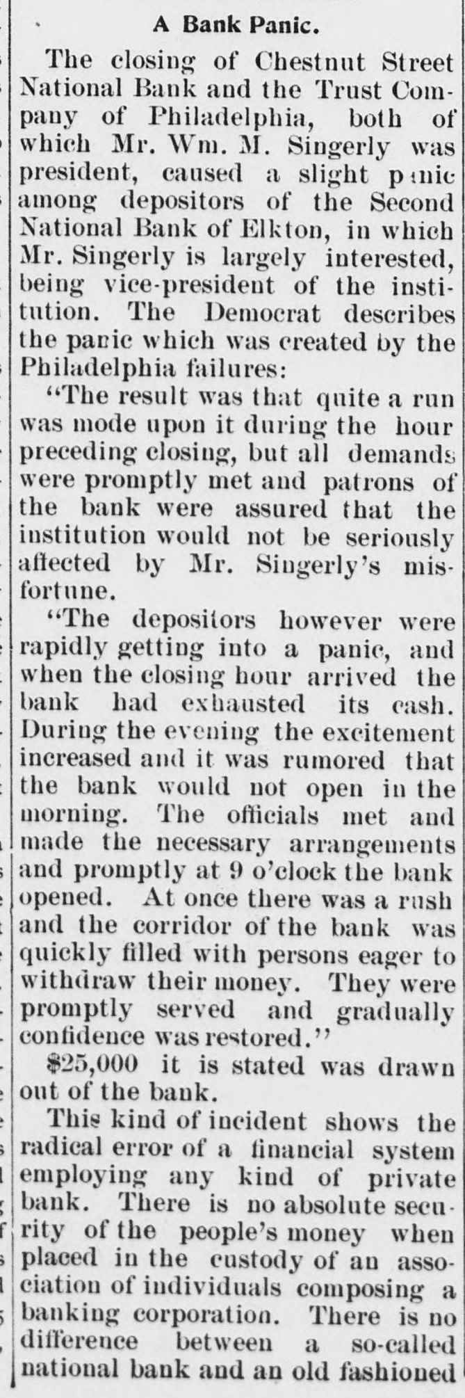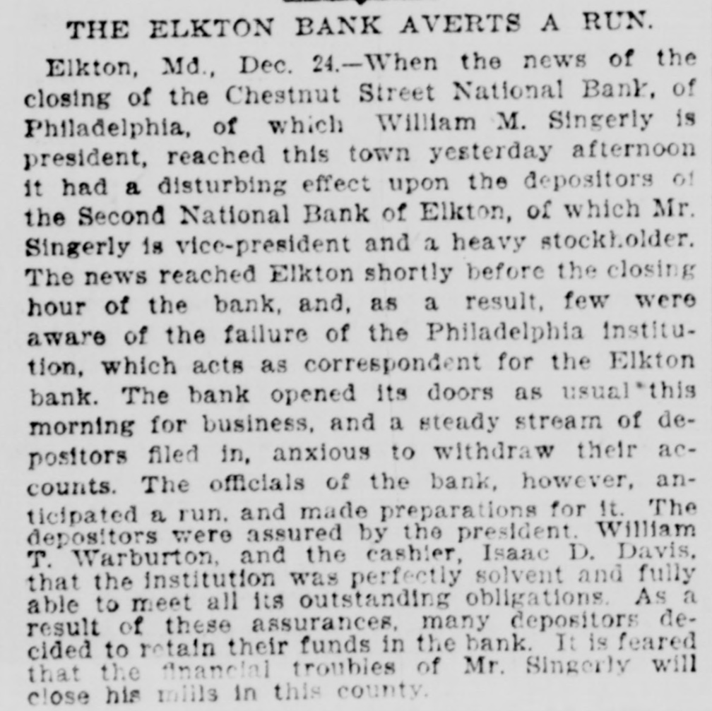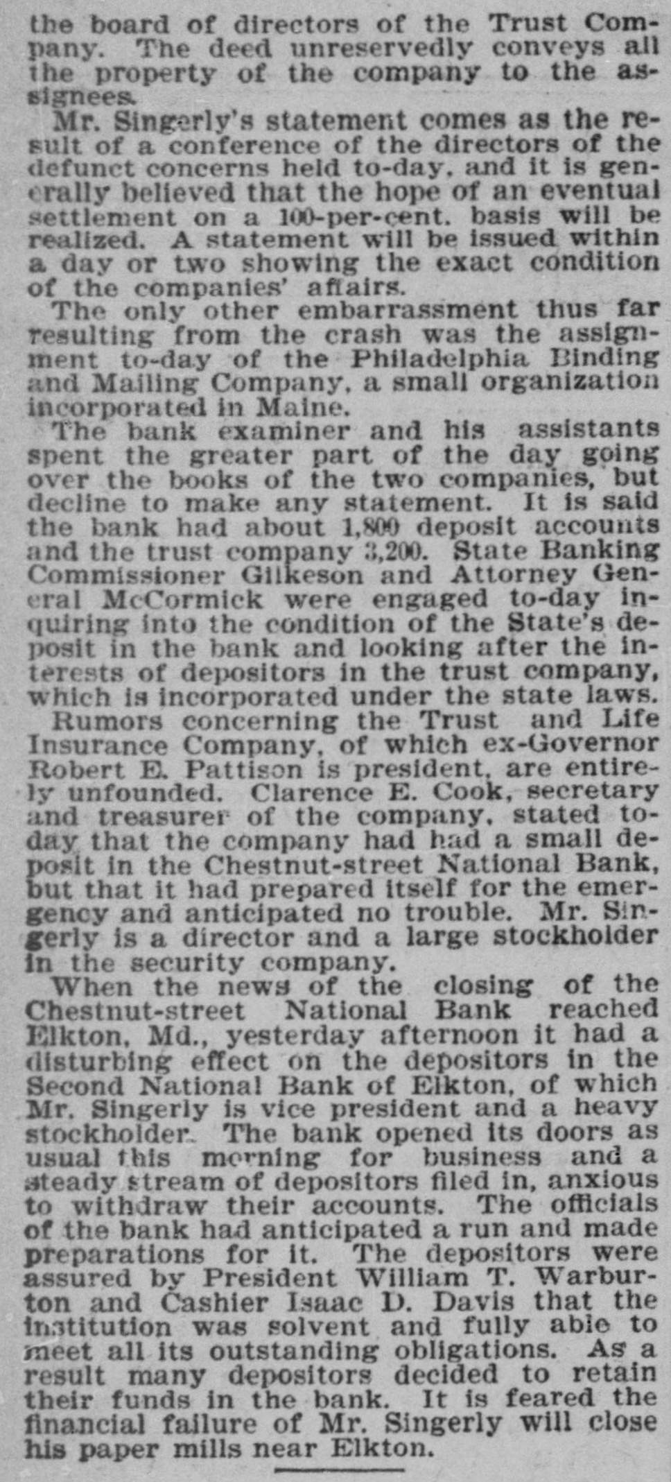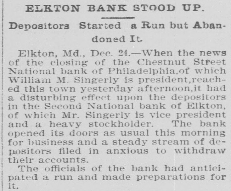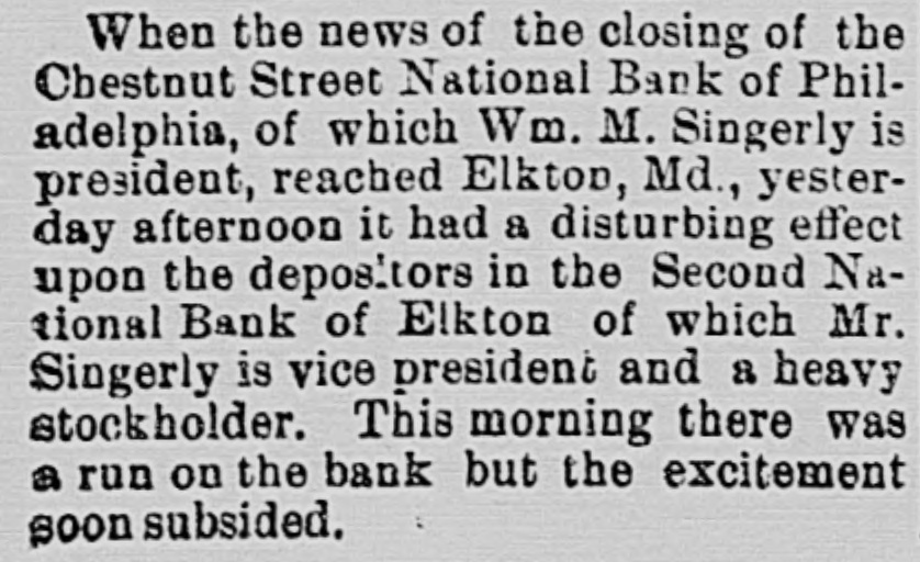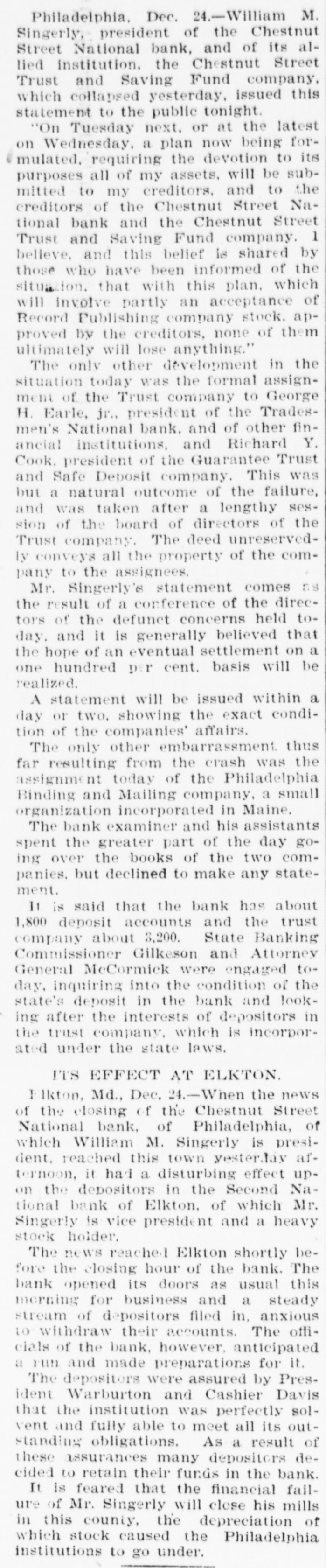 SOME DEPOSITORS IN SECOND NATIONAL BANK ALARMED WITHOUT CAUSE. The Elkton Bank is In No Wise Affected by the Philadelphia Failure, and the Fear of the Depositors was Quickly Allayed. The Bank is Strong and a Statement is Made By the Directors. Some excitement was occasioned in Elkton on Thursday afternoon about one o'clock by the telegraphic news that the Chestnut Street National Bank, of Philadelphia, of which Hon. William M. Singerly is President. had closed its doors and was in the hands of an United States Bank Examiner. From the fact that Mr. Singerly is also vicepresident of the Second National Bank of Elkton, some alarm was caused among depositors In the Elkton Bank. who feared that it might be involved in the Philadelphia failure. Accordingly something of a run was made on the Second National Bank of Elkton, which continued up to the closing of the bank's doors at three o'clock. Every demand was promptly met by the bank, and which allayed almost entirely the apprehensions of the people. Throughout Elkton that evening wherever the matter was discussed. after the statement of President William T. Warburton to the effect that the bank would meet every demand and was in nowise crippled. were heard expressions from leading men of Elkton that they had the greatest confidence 111 the bank all of which had such an effect that when the bank's doors opened on Friday morning, wh t promised to be a considerable number of depositors to withdraw their accounts, dwindled down to a very few, and several of those who had withdrawn on Thursday, were back to again make deposit. One deposit on Friday morning was 85,000, made by a prominent business man of Elkton. DIRECTORS STATEMENT. The Directors of the Second National Bank on Friday morning made this statement to the public:The Second National Bank of Elkton, is not materially affected by the closing of the Chestnut Street National Bank as that Bank at the time of its failure held but a small balance of the funds of this Bank, the reserve of this Bank being at that time with the Commercial and Farmers Bank of Baltimore. The Second National Bank of Elkton is fully prepared to meet all its liabilities. W. T. WARBURTON, JAS. S. HOPPER, J.J. ARCHER, I. D. DAVIS, Directors. On Friday morning the bank received a large sum of money from the Commercial and Farmers National Bank of Baltimore, its reserve agent. At noon yesterday the Second National Bank of Elkton has settled down to its normal condition. The run altogether amounted to not over $25,000. CHESTNUT STREET BANK FAILURE. At the closing of the Chhestnut Street National Bank on Thursday. the Chestnut Street Trust and Saving Fund Company, which was under practically the same management, also suspended, and that the joint liabilities would reach, if not exceed $ 83,000,000, seemed to increase the excitement. A report from Philadelphia yesterdaystate efforts are being made to straighten out the tangle, and last night it was announced that negotlations are under way, by which if they materialize, it is hoped to secure the banks debtedness, and also to save the dedepositors in the trust company. During the day President Singerly and the Directors of the bank sat in the big bank building on Chestnut street, below Eighth, in consultation over the turn affairs had taken. When he left late in the afternoon Mr. Singerly said: "There is no statement to be made at this time except that we are making ever. effort to secure the bank's indebtedness, so that the bank can go into voluntary liquidation and be saved from a receivership.' The cause assigned for the failure is the shrinkage in value of the bonds and notes of the Singerly Pulp and Paper Mills, located at Elkton, Md. This is the explanation given by Mr. Singerly and Comptroller of the Currency Eckels. Mr. Eckels has been in Philadelphia several times recently, trying to make arrangements by which the pulp and paper mills securities could be taken out of the assets of the bank and preferred stook of the Philadelphia Record company substituted, By this and certain other changes Mr. Eckels hoped to put the bank in first class condition. When the pulp and paper mills securities were taken by the bank they were regarded as first class. but since that time has fallen a to less than two cents, paper by pound everyone in price from and ten the cents securities have depreciated in proportion. On all sides were heard expressions of sympathy for Mr. Singesly, whose generous nature has made him beloved by many. Several prominent citizens and officials of numerous banks called upon him yesterday to offer assistance. Shortest Day of The Year