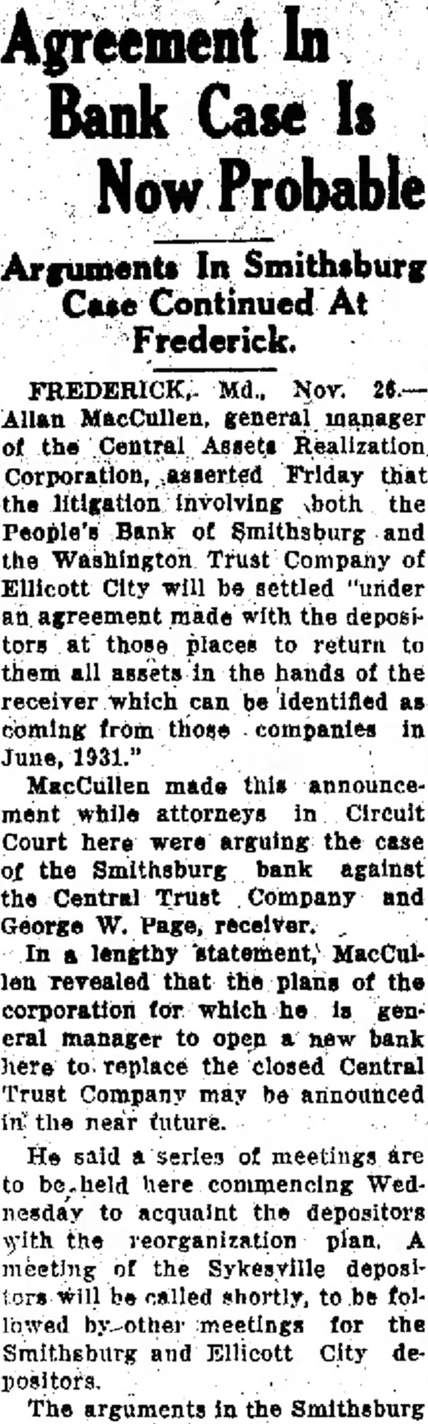 Agreement In Bank Case Is Now Probable Arguments In Smithsburg Case Continued At Frederick. FREDERICK, Md., Nov. Allan MacCullen, general manager of the Central Assets Realization Corporation, asserted Friday that the litigation involving both the People's Bank of Smithsburg and the Washington Trust Company of Ellicott City will be settled "under an agreement made with the depositors at those places to return to them all assets in the hands of the receiver which can be identified as coming from those companies in June, 1931." MacCullen made this announcement while attorneys in Circuit Court here were arguing the case of the Smithsburg bank against the Central Trust Company and George W. Page, receiver. In lengthy statement, MacCullen revealed that the plans of the corporation for which he is general manager to open new bank here replace the closed Central Trust Company may be announced in the near (uture. He said series of meetings are to here commencing Wednesday to acquaint the depositors with the reorganization plan. A meeting of the Sykesville depositors will be called shortly, to be followed by-other meetings for the Smithsburg and Ellicott City depositors. The arguments in the Smithsburg
