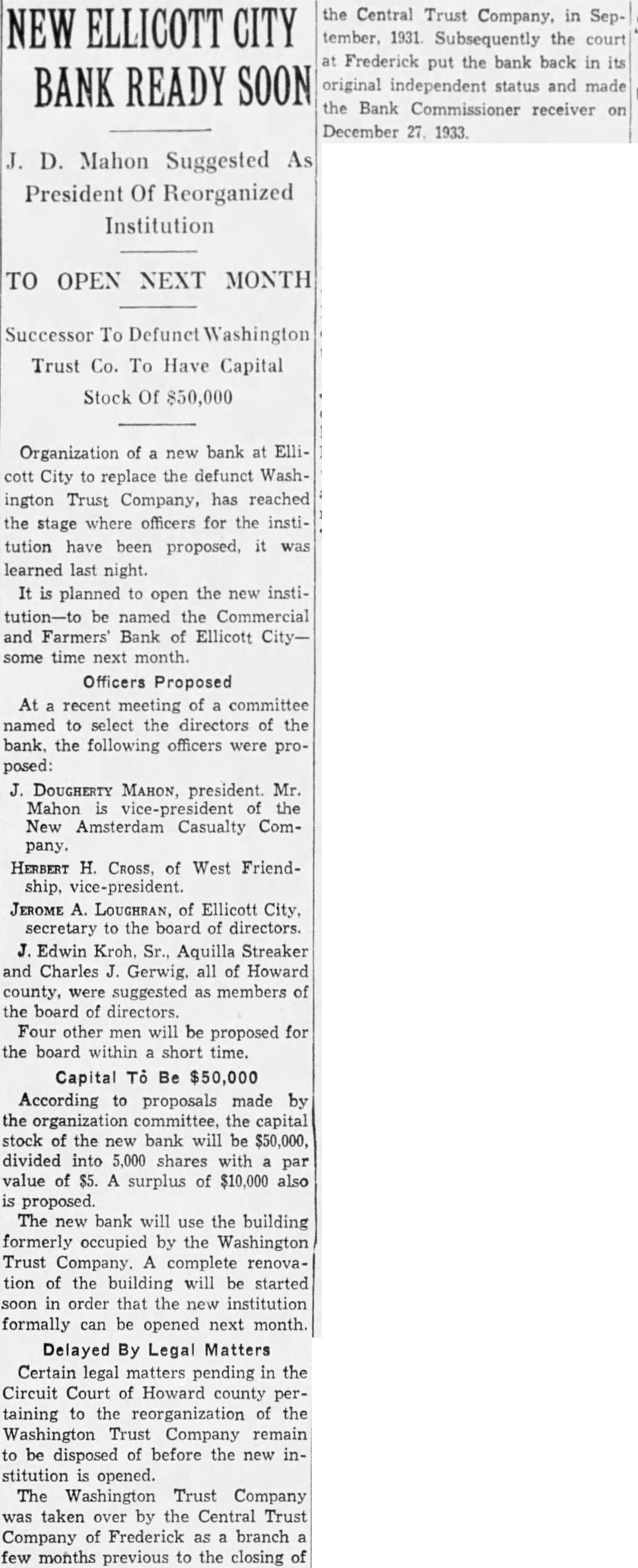 NEW ELLICOTT CITY BANK READY SOON J. D. Mahon Suggested As President Of Reorganized Institution TO OPEN NEXT MONTH Successor To Defunct Washington Trust Co. To Have Capital Stock Of $50,000 Organization of a new bank at Ellicott City to replace the defunct Washington Trust Company, has reached the stage where officers for the institution have been proposed, it was learned last night. It is planned to open the new institution-to be named the Commercial and Farmers' Bank of Ellicott Citysome time next month. Officers Proposed At recent meeting of committee named to select the directors of the bank. the following officers were proposed: J. DOUGHERTY MAHON, president. Mr. Mahon is vice-president of the New Amsterdam Casualty Company. HERBERT H. CROSS, of West Friendship, vice-president. JEROME A. LOUGHRAN, of Ellicott City, secretary to the board of directors. J. Edwin Kroh. Sr., Aquilla Streaker and Charles J. Gerwig, all of Howard county, were suggested as members of the board of directors. Four other men will be proposed for the board within short time. Capital To Be $50,000 According to proposals made by the organization committee, the capital stock of the new bank will be $50,000, divided into 5,000 shares with par value of $5. A surplus of $10,000 also is The new bank will use the building formerly occupied by the Washington Trust Company. A complete renovation of the building will be started soon in order that the new institution formally can be opened next month. Delayed By Legal Matters Certain legal matters pending in the Circuit Court of Howard county pertaining to the reorganization of the Washington Trust Company remain to be disposed of before the new institution opened. The Washington Trust Company was taken over by the Central Trust Company of Frederick as branch few months previous to the closing of the Central Trust Company. in September, 1931. Subsequently the court at Frederick put the bank back in its original independent status and made the Bank Commissioner receiver on