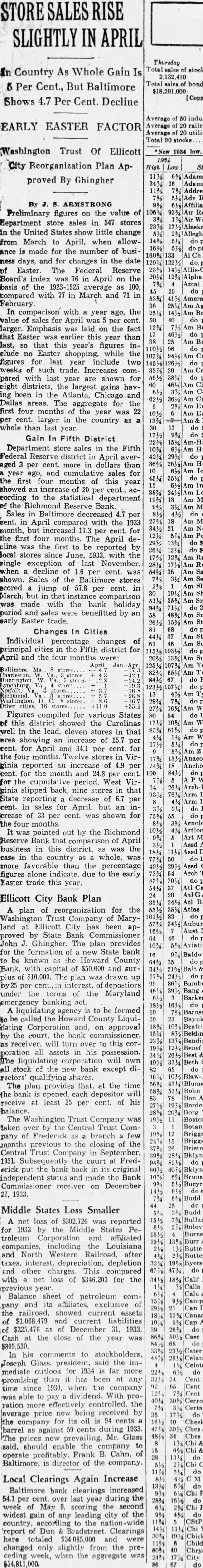 STORE SALES RISE SLIGHTLY IN APRIL In Country As Whole Gain Is 5 Per Cent., But Baltimore Shows 4.7 Per Cent. Decline EARLY EASTER FACTOR Washington Trust Of Ellicott City Reorganization Plan Approved By Ghingher By J. ARMSTRONG Preliminary figures on the value of Hepartment sales in 547 stores in the United States little change from March to April, when allowance is made for the of busiiness days, and for changes in the date of Easter. The Federal Reserve Board's index in April on the basis of the average 100, compared with 77 in March and 71 in In comparison with year ago, the value of sales for April per cent. larger. Emphasis was laid on the fact that Easter this year than last, so that this year's figures include Easter shopping, while the figures for last include two of such trade. Increases pared with last are shown for eight districts, largest gains having been in the Atlanta, Chicago and Dallas aggregate for the first four months of the year was 22 per cent. larger in the country as whole than last year. Gain In Fifth District Department store sales in the Fifth Federal district April averaged per cent. more in dollars than year ago, and cumulative sales for the first months of this year showed an increase of 20 per cent., according to the statistical department of the Reserve Bank. Sales in Baltimore decreased 4.7 per cent. in April compared with the 1933 month, but increased 17.3 cent for per the first The April dethe first to be reported by local stores June with the single exception of last when decline of 1.6 per cent. was shown. Sales of the stores scored jump of 57.8 per cent. in March but was made the bank holiday period and sales were benefitted by an early Easter trade. 68 do pf. Changes In Cities Individual changes of principal the Fifth district for do pf. April and the four Jan Tob. Huntington 28% do pf. 16 27% 16% Figures compiled for various States of this district showed the Carolinas well in the lead, eleven stores in that do pf. area showing an increase of 15.7 per cent. for April and 34.1 per cent. for the four months. Virginia reported an increase of 4.9 per 24% 18 cent. for the month and 24.8 per 100 for the period. West Virslipped back, in that Arm State reporting decrease of 6.7 per cent. in for April, but an increase of 33 per was shown for the Arnold four It was pointed out by the Richmond Reserve Bank that of April business in this district, as was the case the country whole, was 50 more than the percentage figures alone indicate, due to the early Easter trade this year Ellicott City Bank Plan plan of reorganization for the Trust Company of Maryland Ellicott City has been approved by State Bank John Ghingher. The provides for the formation of State bank to be known the Howard County Bank, capital of $50,000 and surplus $10,000. The plan was drawn up by25 per cent., interest, depostiors under the terms of the Maryland emergency banking act. liquidating agency is to be formed to be called the Howard County Liquidating Corporation and, on approval by court. the bank commissioner, as receiver. will turn to this corporation all assets in his possession. The corporation own all stock of the new bank except diThe provides that, at the time the opened. each will receive at least 25 per cent. of his balance The Washington Trust Company was taken Central Trust Company of Frederick as branch a few months the closing of the Central Trust Company in September, 1931. Subsequently the court at Frederick put the bank back in its original independent and made the Bank Commissioner receiver on December 1933. Middle States Loss Smaller A net loss of $302.726 was reported for 1933 the Middle States Petroleum Corporation and affiliated 19% companies, including the Louisiana and North Western Railroad, after Butterick taxes, interest, depreciation, depletion Byers and other charges. This compared 4734 with net of $346,203 for the previous year. Balance sheet of petroleum comits affiliates, exclusive of the showed assets Canad of $1,068,479 and current liabilities of $225,476 as of December 31. 1933. 39 26% Cash the close of the year was 86% $805,530. comments stockholders, Joseph Glass. said the im- Celotex mediate outlook for 1934 far 22% promising than it has been at any 3234 24 02 time 1930, when the company able to With proration more effectively controlled. the average price being received by the company for its oil is 94 cents 10 Checker (barrel against 59 cents during 1933 34 The prices now prevailing, Mr. Glass said, should enable the company to 15 operate profitably. Frank B. Cahn, of Baltimore, is director of the company Local Clearings Again Increase Baltimore bank clearings increased 54.1 per cent. over last year during the 28% week of May scoring the second widest gain of any leading city of the country. according to the nation-wide 11% report of Dun Bradstreet. Clearings here totaled $54,085,000 11% Childs changed slightly the pre60% coding when the aggregate was 24% 67