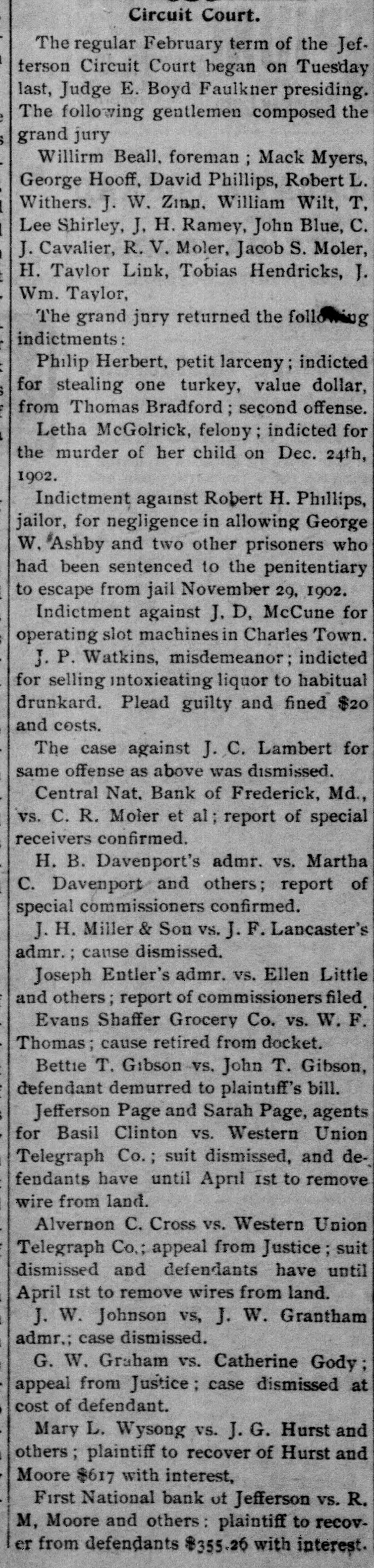 Circuit Court. The regular February term of the Jefterson Circuit Court began on Tuesday last, Judge E. Boyd Faulkner presiding. The following gentlemen composed the grand jury Willirm Beall, foreman ; Mack Myers, George Hooff, David Phillips, Robert L. Withers. J. W. Zinn, William Wilt, T, Lee Shirley, J. H. Ramey, John Blue, C. J. Cavalier, R. V. Moler, Jacob S. Moler, H. Taylor Link, Tobias Hendricks, J. Wm. Taylor, The grand jury returned the following indictments: Philip Herbert, petit larceny; indicted for stealing one turkey, value dollar, from Thomas Bradford second offense. Letha McGolrick, felony indicted for the murder of her child on Dec. 24th, 1902. Indictment against Robert H. Phillips, jailor, for negligence in allowing George W. Ashby and two other prisoners who had been sentenced to the penitentiary to escape from jail November 29, 1902. Indictment against J. D, McCune for operating slot machines in Charles Town. J. P. Watkins, misdemeanor; indicted for selling intoxieating liquor to habitual drunkard. Plead guilty and fined $20 and costs. The case against J. C. Lambert for same offense as above was dismissed. Central Nat. Bank of Frederick, Md., vs. C. R. Moler et al report of special receivers confirmed. H. B. Davenport's admr. vs. Martha C. Davenport and others; report of special commissioners confirmed. J. H. Miller & Son vs. J. F. Lancaster's admr. ; cause dismissed. Joseph Entler's admr. vs. Ellen Little and others; report of commissioners filed Evans Shaffer Grocery Co. vs. W.F. Thomas; cause retired from docket. Bettie T. Gibson vs. John T. Gibson, defendant demurred to plaintiff's bill. Jefferson Page and Sarah Page, agents for Basil Clinton vs. Western Union Telegraph Co. suit dismissed, and defendants have until April Ist to remove wire from land. Alvernon C. Cross vs. Western Union Telegraph Co.; appeal from Justice; suit dismissed and defendants have until April ist to remove wires from land. J. W. Johnson vs, J. W. Grantham admr,; case dismissed. G. W. Graham vs. Catherine Gody ; appeal from Justice case dismissed at cost of defendant. Mary L. Wysong vs. J. G. Hurst and others ; plaintiff to recover of Hurst and Moore $617 with interest, First National bank of Jefferson vs. R. M, Moore and others: plaintiff to recover from defendants $355.26 with interest.
