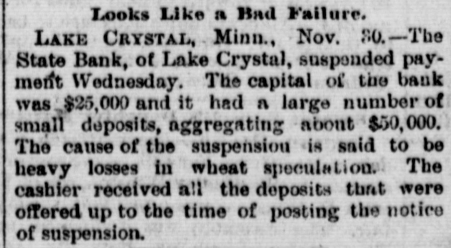 CONDENSED NEWS. Thomas Davis, a Cincinnati draughtsman, celebrated Thanksgiving by shooting himself through the head at his home. The State Bank of Lake Crystal, Minn., has suspended, swallowing the savings of many poor people. Deposits were received up to the time the notice was posted. A St. Louis special says the jute bagging trust is going to pieces. The sales have been far below the usual fall average. The sixteen factories leased and closed by the combine are soon to start up, which will cause a marked decline in prices. Kansas is being stirred from end to end in opposition to the Springer bill for the opening of Oklahoma to settlement, as it is feared all immigration will be attracted thereby to the Indian Territory. The body of Capt. Daniel Morrison, of Shelburne, N. S., was found in the wreck of his schooner, the M. & A. Morrison, of Provincetown, Mass. The rest of the crew were doubtless washed overboard and drowned. Mrs. Mary Dargenton died at Amesbury, Mass., from the effects of shot wounds inflicted Monday night by her husband, Jules Dargenton, who afterward committed suicide. The schooner David Faust, from Rondout, with cement, is ashore on Great Point Rip, Nantucket. A meeting of the executive committee of the National Association of Democratic clubs has been called for Dec. 15, at the Albermarle hotel, New York. During a Thanksgiving orgie in a Greenwich street tenement, in New York, a fight was started, and Mary Connell was thrown or fell from a fire escape and killed. Yale denies that a race has been arranged with the Cambridge (Eng.) university crew, to be rowed in England on April 15. Tramps have become so numerous and offensive about Olean, N. Y., that the local military company was called out end sent to break up their rendezvous. The tramps heard of the movement and fled. Wayman Sutton, of Lynchburg, Va., has cause for thanksgiving. He was to have been hanged Friday, but on Wednesday evening a mob tore down the jail and liberated him. The governor had refused to grant a petition for pardon. Sutton murdered a neighbor. Albert Walker's corpse is the latest result of thawing out dynamite. It thawed too quickly. Funeral at Sandusky, O. The striking switchmen at Indianapolis are making no progress in inducing other employes to join them, and their strike is a failure. Hon. James G. Blaine was in New York Thursday in attendance at the funeral of the wife of Gen. Sherman. The Lynn-Orlsfki broadsword combat, which was stopped by the police at New Haven some time ago, was finished at Berlin Thursday and won by Lynn. There were seven new cases of fever, but no death, at Jacksonville Thursday. Chief Arthur, of the Locomotive Brotherhood, has left New York for the west.
