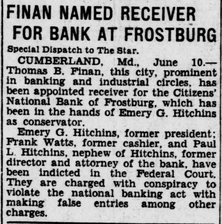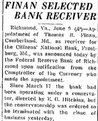 FINAN SELECTED BANK RECEIVER Va., pointment Thomas R. Finan, Md. as receiver for the Citizens' National Bank, Frost burg. Md., announced today by the Federal Reserve Bank of Rich. mond upon notification from the Comptroller of the Currency who made the appointment. Since March the bank been operating under directed by but the conservatorship was ordered terminated with the close business yesterday.
