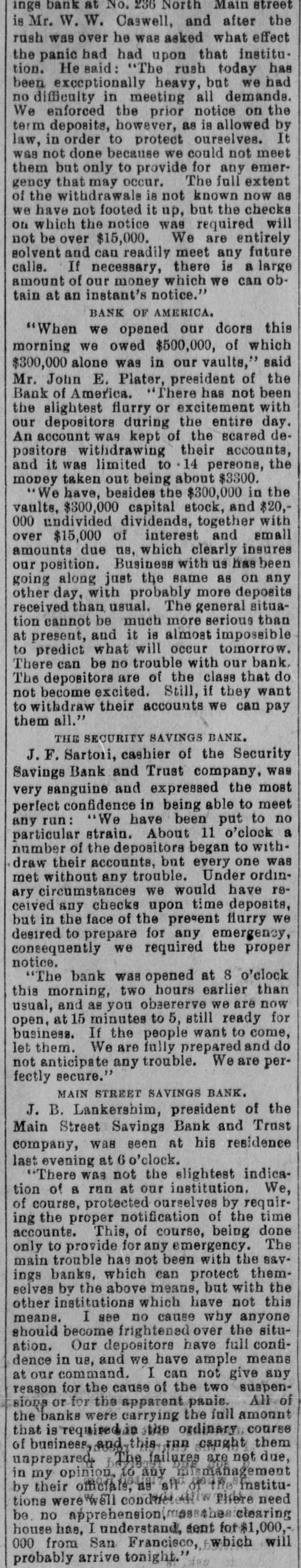 ings bank at No. 236 North Main street is Mr. W. W. Caswell, and after the rush was over he was asked what effect the panic had had upon that institution. He said : "The rush today has been exceptionally heavy, but we had no difficulty in meeting all demands. We enforced the prior notice on the term deposits, however, as is allowed by It law, in order to protect ourselves. was not done because we could not meet them but only to provide for any emergency that may occur. The full extent of the withdrawals is not known now as we have not footed it up, but the checks on which the notice was required will not be over $15,000. We are entirely solvent and can readily meet any future calls. If necessary, there is a large amount of our money which we can obtrin at an instant's notice." BANK OF AMERICA. "When we opened our doors this morning we owed $500,000, of which $300,000 alone was in our vaults," said Mr. John E. Plater, president of the Bank of America. "There has not been the elightest flurry or excitement with our depositors during the entire day. An account was kept of the scared depositors withdrawing their accounts, and it was limited to 14 persons, the money taken out being about $3300. "We have, besides the $300,000 in the vaults, $300,000 capital stock, and $20,000 undivided dividends, together with over $15,000 of interest and email amounts due us, which clearly insures our position. Business with us has been going along just the same as on any other day, with probably more deposits received than usual. The general situation cannot be much more serious than at present, and it is almost impossible to predict what will occur tomorrow. There can be no trouble with our bank. The depositore are of the class that do not become excited. Still, if they want to withdraw their accounts we can pay them all." THE SECURITY SAVINGS BANK. J.F.Sartori, cashier of the Security Savings Bank and Trust company, was very sanguine and expressed the most confidence in meet "We have no perfect any run: being been 11 able put o'clock to to strain. About a of the depositors number particular began to one withdraw their accounts, but every was met without any trouble. Under ordinary circumstances we would have received any checks upon time deposits, but in the face of the precent flurry we desired to prepare for any emergency, consequently we required the proper notice. "The bank was opened at 8 o'clock this morning, two hours earlier than usual, and as you obaererve we are now open, at 15 minutes to 5, still ready for business. If the people want to come, let them. We are fully prepared and do not anticipate any trouble. We are perfectly secure." MAIN STREET SAVINGS BANK. J. B. Lankershim, president of the Main Street Savings Bank and Trust company, was seen at his residence last evening at 6 o'clock. "There was not the slightest indication of a run at our institution. We, of course, protected ourselves by requiring the proper notification of the time accounts. This, of course, being done only to provide for any emergency. The main trouble has not been with the S&Vings banks, which can protect themselves by the above means, but with the other institutions which have not this means. I see no cause why anyone should become frightened over the situation. Our depositors have full contidence in us, and we have ample means at our command. I can not give any reason for the cause of the two suspensions or for the apparent panie. All . the banks were carrying the full amount that is required.in tise ordinary course of business, and this ran caught them unprepared The failures are not due, in to any officials, as all by my their opinion. pasmanagement institutions wereWell conduct aliv There need be. no apprehension(mashesictearing house has, I understand, sent for $1,000,000 from San Francisco, which will probably arrive tonight.'