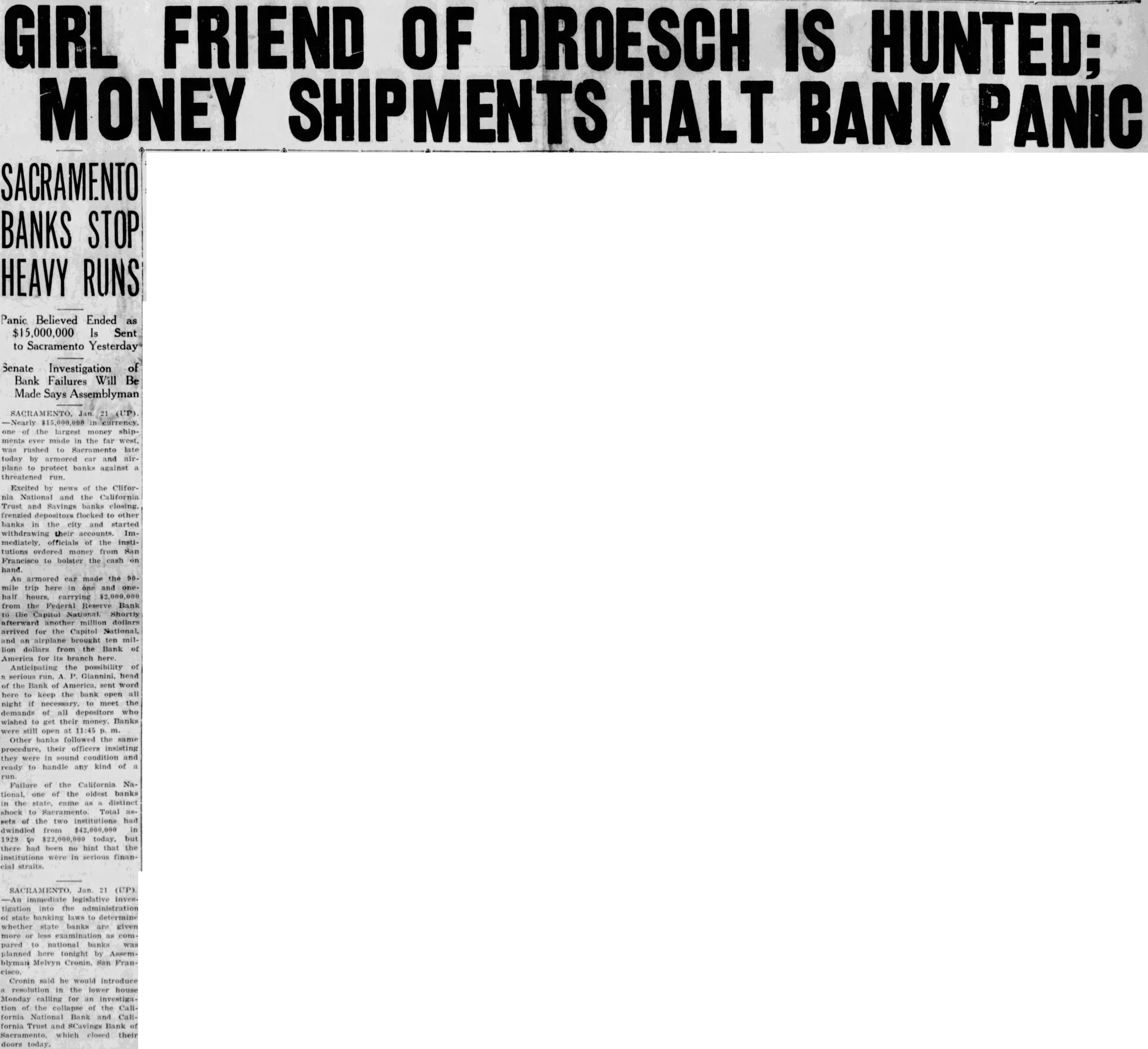 Nearly fifteen dollars of the largest monmade the rushed to SacraFar West, was late day by armored mento banks airplane against the CaliforExcited news California Trust and Bank closing, frenzied the and other started withdrawing counts Immediately, officials at the from inbolster the "cash to on hand armored car made the ninetrip one million dollars Reserve Bank the Federal National Shortly the Capitol another arrived terward, the Capitol National, for $10,000,000 Bank brought of America for Glannini Sends Funds possibility of serious the Bank keep the banks here the mands Other banks their money follow the planned their officers insisting cedure they sound ready to handle any kind of