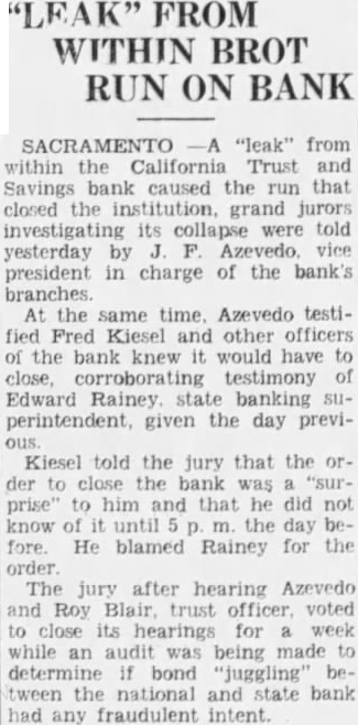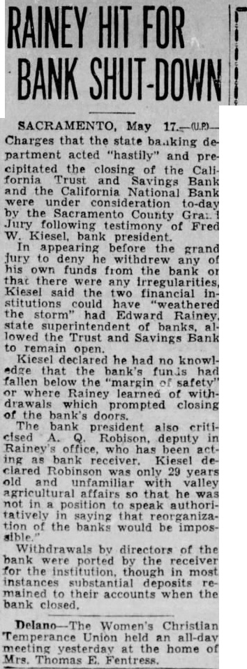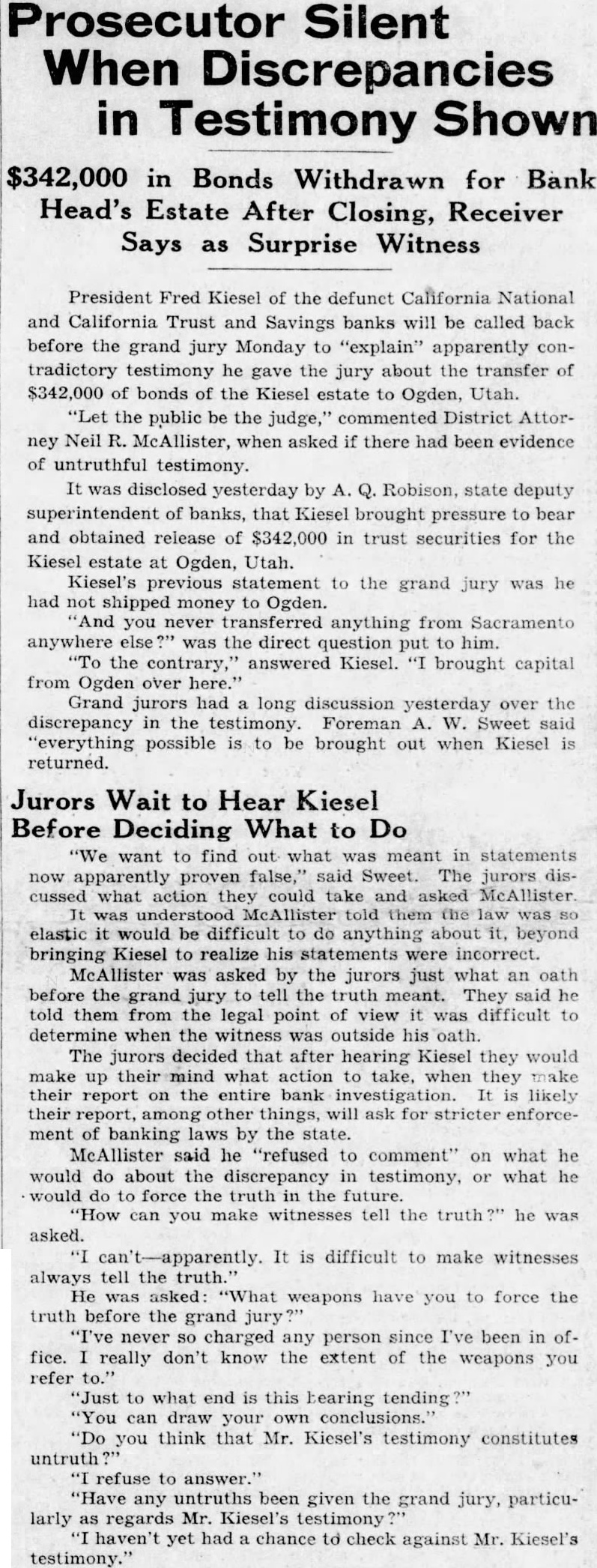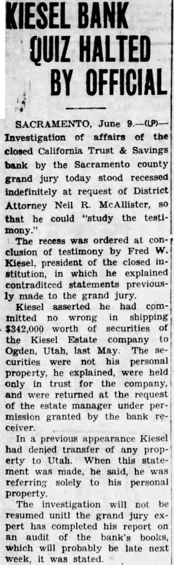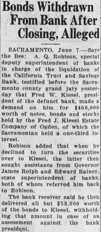 June the Bee: Robison, special deputy superintendent of banks charge of the liquidation of the California Trust and Savings Bank, testified before the Sacramento county grand jury yesterday that Fred W. Kiesel, president the defunct bank, made demand on him for worth of notes, bonds and stocks held by the Fred Kiesel Estate Company of Ogden, of which the Sacramentan held one-third interest. Robison added that when he declined to turn the securities over to Kiesel, the latter then sought assistance from Governor James Rolph and Edward Rainey, state superintendent of banks, both of whom referred him back to Robison. The bank receiver said he then delivered all but worth of the bonds to Kiesel, withholdthat amount in case of an assessment against the bank president.