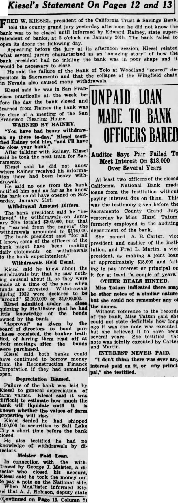 W. KIESEL, president of the California Trust & Savings Bank. told the county grand jury yesterday afternoon he did not know the bank to closed until informed by Edward Rainey, state superwas of o'clock on January 20th. The bank failed to its doors the day open its afternoon Kiesel related Appearing before the jury an story' of how the several jurors it bank president had no inkling the bank was in poor shape and would Bank of Yolo at Woodland "scared" deHe said the failure of the that the collapse of the Wingfield chain Sacramento and positors in Nevada also caused many withdrawals. in San FranKiesel said he was all the week becisco practically UNPAID LOAN fore the day the bank closed and learned from Rainey the bank meeting of the San close MADE TO BANK Francisco Clearing House WARNED BY RAINEY. "You have heavy withdrawOFFICERS BARED to-day," Kiesel testithere "and I'll have Rainey to close your After talking with Rainey. Kiesel Auditor Says Pair Failed To took next train for SacMeet Interest On $18,000 ramento. said he did not know Over Several Years where Rainev his informabeen heavy withtion there had At least two officers the closed drawals. said from the bank California National Bank made He no one and knew notified him as loans from the Institution without opened on Satthe bank interest due on them. This 21st. paying January Withdrawal Amount Differs. was the testimony given before the he Sacramento County Grand Jury The president said Janulieved' yesterday by Miss Hazel Tatum, 20th totaled but that ary formerly employed in the auditing "learned from the papers" department the bank. bank president "for named B. vice The She of officers the know, some the president and cashier of the instibeen making bank might tution. and Fred Martin. vice on withdrawals bank president, as making joint loan Withdrawals Held Usual. of $18,000 and fallKiesel said he knew about the ing to pay interest or principal on withdrawals that he saw nothfor at least couple of years.' ing unusual they were OTHER DEALS HINTED. made time of the year when Miss Tatum indicated there may funds are during 1932 were declared be other notes of similar nature, "around" $3,000,000 or $4,000,000. but she could not remember any of Kiesel admitted under close names. quizzing by McAllister that he Without reference to the records the bonds the bank, Miss Tatum owned by the bank. could not state definitely how long given was the note board directors bond she believed to have chases consisted, the banker testiseveral years. She testified the them read off was jointly executed by Carter their meetings after the bonds and Martin INTEREST NEVER PAID. Kiesel said both banks could continued to money don't think there ever any the Finance interest paid on it, or any princiCorporation if they had remained pal," she testified. open.