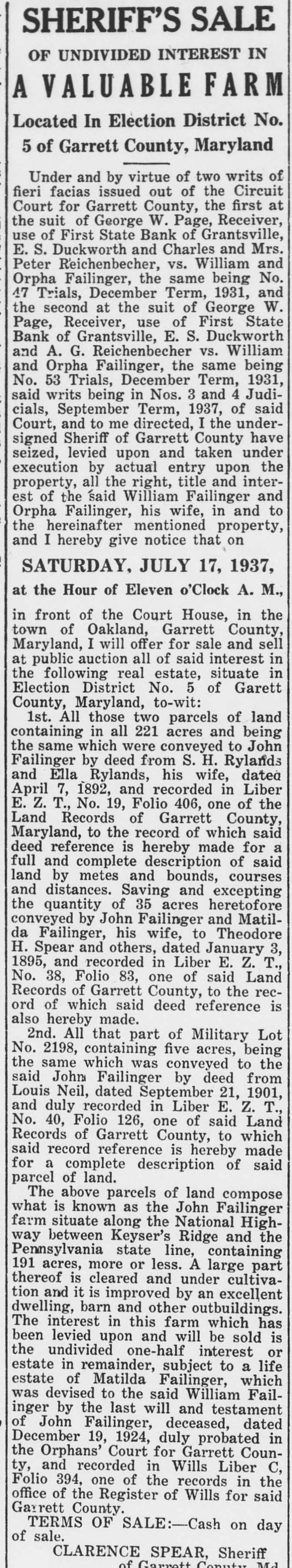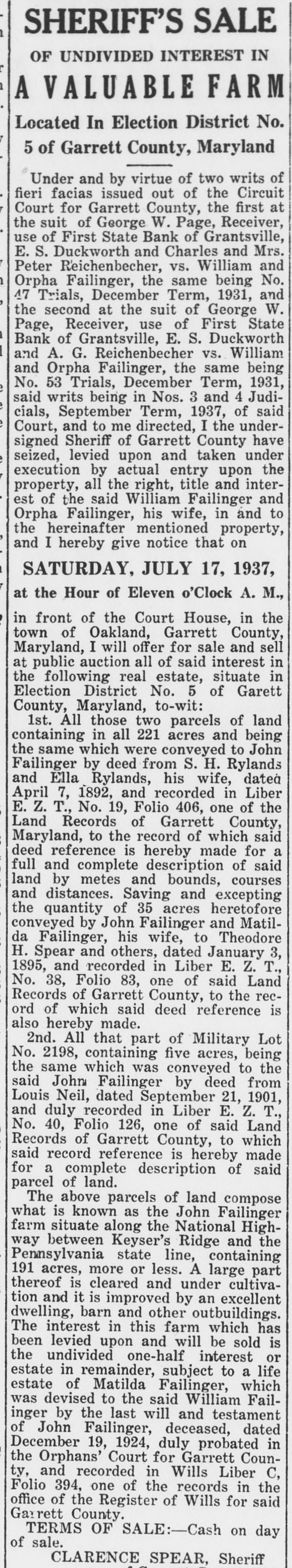 SHERIFF'S SALE OF UNDIVIDED INTEREST IN A VALUABLE FARM Located In Election District No. 5 of Garrett County, Maryland Under and by virtue of two writs of fieri facias issued out of the Circuit Court for Garrett County, the first at the suit of George W. Page, Receiver, use of First State Bank of Grantsville, E. S. Duckworth and Charles and Mrs. Peter Reichenbecher, vs. William and Orpha Failinger, the same being No. 47 Trials, December Term, 1931, and the second at the suit of George W. Page, Receiver, use of First State Bank of Grantsville, E. S. Duckworth and A. G. Reichenbecher vs. William and Orpha Failinger, the same being No. 53 Trials, December Term, 1931, said writs being in Nos. 3 and 4 Judicials, September Term, 1937, of said Court, and to me directed, I the undersigned Sheriff of Garrett County have seized, levied upon and taken under execution by actual entry upon the property, all the right, title and interest of the said William Failinger and Orpha Failinger, his wife, in and to the hereinafter mentioned property, and I hereby give notice that on SATURDAY, JULY 17, 1937, at the Hour of Eleven o'Clock A. M., in front of the Court House, in the town of Oakland, Garrett County, Maryland, I will offer for sale and sell at public auction all of said interest in the following real estate, situate in Election District No. 5 of Garett County, Maryland, to-wit: 1st. All those two parcels of land containing in all 221 acres and being the same which were conveyed to John Failinger by deed from S. H. Rylands and Ella Rylands, his wife, dated April 7, 1892, and recorded in Liber E. Z. T., No. 19, Folio 406, one of the Land Records of Garrett County, Maryland, to the record of which said deed reference is hereby made for a full and complete description of said land by metes and bounds, courses and distances. Saving and excepting the quantity of 35 acres heretofore conveyed by John Failinger and Matilda Failinger, his wife, to Theodore H. Spear and others, dated January 3, 1895, and recorded in Liber E. Z. T., No. 38, Folio 83, one of said Land Records of Garrett County, to the record of which said deed reference is also hereby made. 2nd. All that part of Military Lot No. 2198, containing five acres, being the same which was conveyed to the said John Failinger by deed from Louis Neil, dated September 21, 1901, and duly recorded in Liber E. Z. T., No. 40, Folio 126, one of said Land Records of Garrett County, to which said record reference is hereby made for a complete description of said parcel of land. The above parcels of land compose what is known as the John Failinger farm situate along the National Highway between Keyser's Ridge and the Pennsylvania state line, containing 191 acres, more or less. A large part thereof is cleared and under cultivation and it is improved by an excellent dwelling, barn and other outbuildings. The interest in this farm which has been levied upon and will be sold is the undivided one-half interest or estate in remainder, subject to a life estate of Matilda Failinger, which was devised to the said William Failinger by the last will and testament of John Failinger, deceased, dated December 19, 1924, duly probated in the Orphans' Court for Garrett County, and recorded in Wills Liber C, Folio 394, one of the records in the office of the Register of Wills for said Garrett County. TERMS OF SALE:-Cash on day of sale. CLARENCE SPEAR, Sheriff