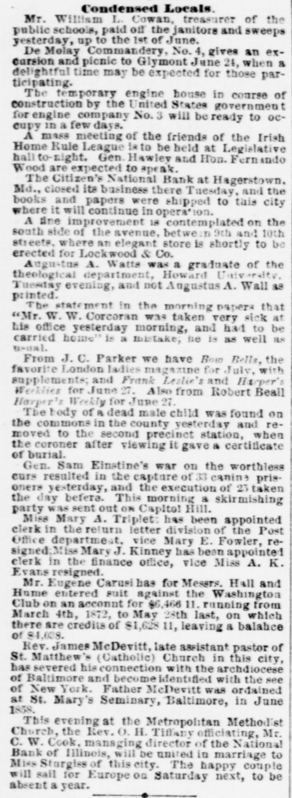 Condensed Locals. Mr. William L. Cowan, treasurer of the public schools, paid off the janitors and sweeps yesterday, up to the 1st of June. De Molay Commandery, No. 4, gives an excursion and picnic to Glymont June 24, when a delightful time may be expected for those participating. The temporary engine house in course of construction by the United States government t for engine company No. 3 will be ready to occupy in a few days. A mass meeting of the friends of the Irish Home Rule League is to be held at Legislative hall to-night. Gen. Hawley and Hon. Fernando Wood are expected to speak. The Citizen's National Bank at Hagerstown, Md., closed its business there Tuesday, and the books and papers were shipped to this city where it will continue in opera' 10n. A tine improvement 18 contemplated on the south side of the avenue, betwe 9th and 10th streets, where an elegant store is shortly to be erected for Lockwood & Co. Augustus A. Watts was a graduate of the theological department, Howard University, Tuesday evening, and not Augustus A. Wall as printed. The statement in the morning papers that "Mr. W. W. Corcoran was taken very sick at his office yesterday morning, and had to be carried home" is a mistake; he is as well as usual. From J. C. Parker we have Bow Bells, the favorite London ladies magazine for July, with supplements; and Frank Leslie's and Harper's Weeklies for June 27. Also from Robert Beall Harper's Weekly for June 27. The body of 8 dead male child was found on the commons in the county yesterday and removed to the second precinct station, when the coroner after viewing it gave & certificate of burial. Gen. Sam Einstine's war on the worthless curs resulted in the capture of 33 canine prisoners yesterday, and the execution of 25 taken the day befere. This morning a skirmishing party was sent out OR Capitol Hill. Miss Mary A. Triplet: has been appointed clerk in the return letter division of the Post Office department, vice Mary E. Fowler, resigned;Miss Mary J. Kinney has been appointed clerk in the finance office, vice Miss A. K. Evans resigned. Mr. Eugene Carusi has for Messrs. Hall and Hume entered suit against the Washington Club on an acconnt for $6,466 11. running from March 4th, 1872, to May 28th last, on which there are credits of $1,628 11, leaving a balance of $4,038. Rev. James McDevitt, late assistant pastor of St. Matthew's (Catholic) Church in this city, has severed his connection with the archdiocese of Baltimore and become identified with the see of New York. Father McDevitt was ordained at St. Mary's Seminary, Baltimore, in June 1858. This evening at the Metropolitan Methodist Church, the Rev. 0. H. Tiffany officiating, Mr. C. W. Cook, managing director of the National Bank of Illinois, will be united in marriage to Miss Storgies of this city. The happy couple will sail for Europe on Saturday next, to be absent a year.
