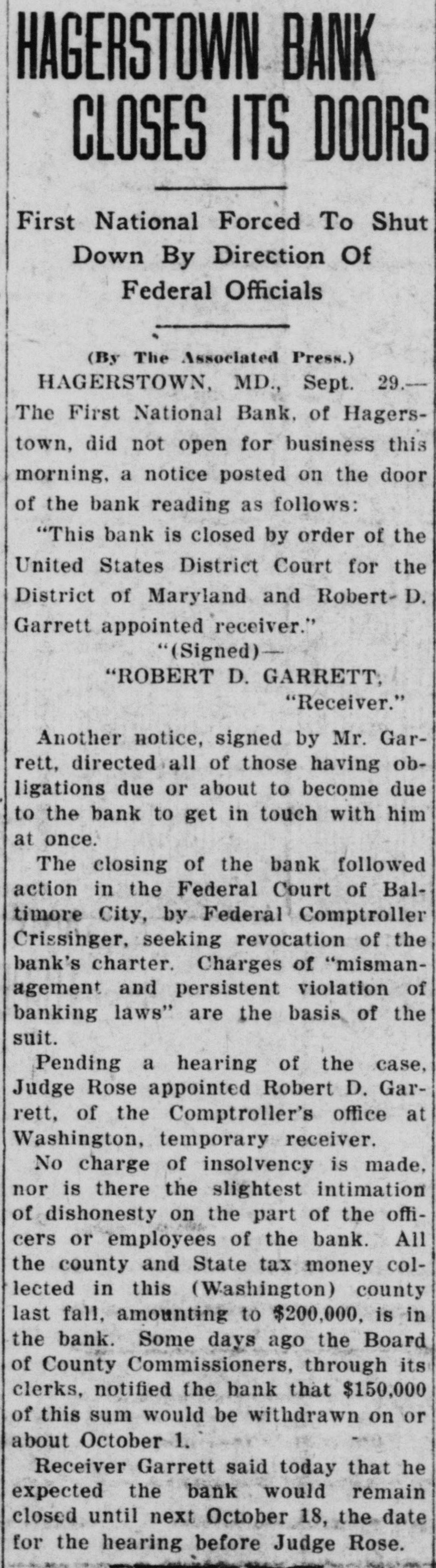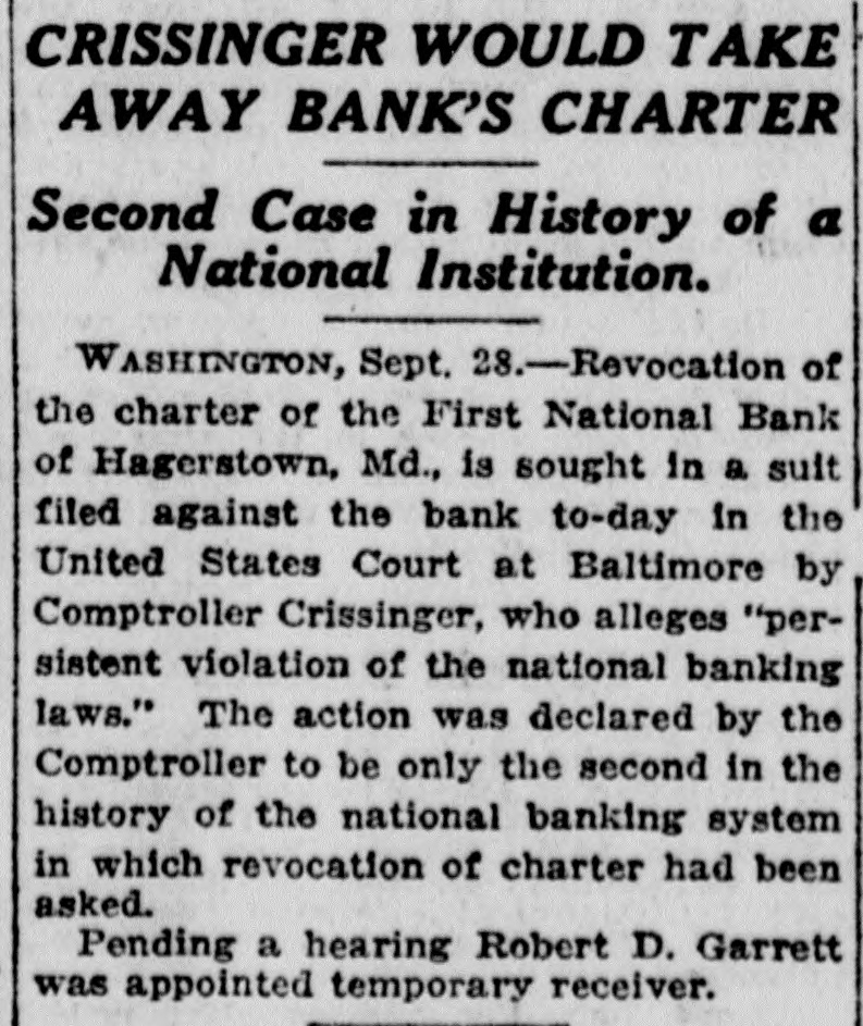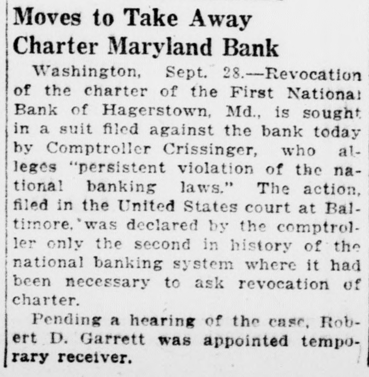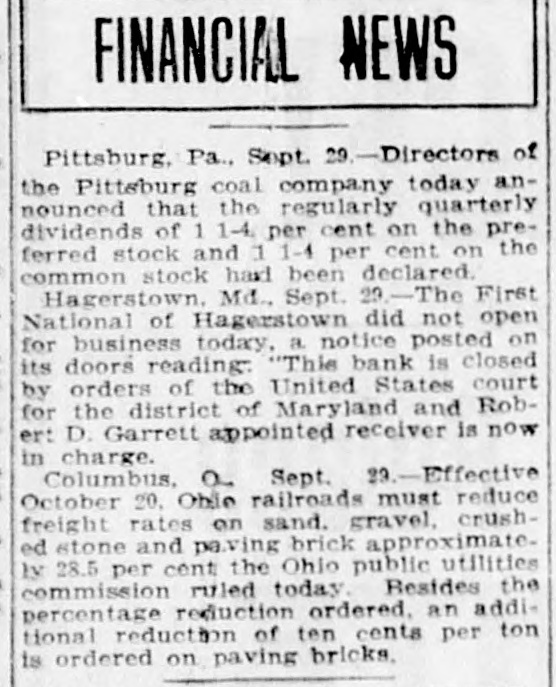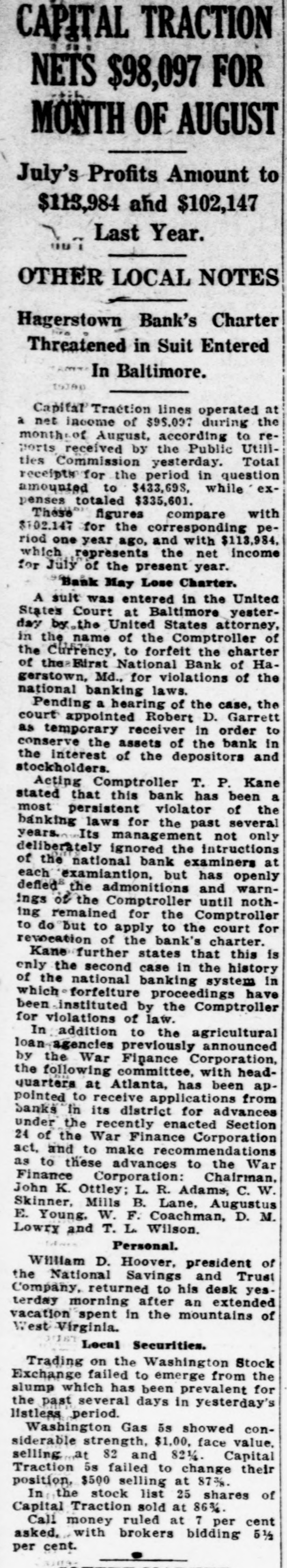 CAPITAL TRACTION NETS $98,097 FOR MONTH OF AUGUST July's Profits Amount to $113,984 and $102,147 Last Year. OU L OTHER LOCAL NOTES Hagerstown Bank's Charter Threatened in Suit Entered In Baltimore. Capital Traction lines operated at a net income of $95,007 during the month.of August, according to rereceived by the Public Utillties Commission for the period ports receipts yesterday. in question Total amounted to $433,698, while expenses totaled $335,601. These figures compare with $102.147 for the corresponding period one year ago, and with $113,984, which represents the net income for July of the present year. Bank May Lose Charter. A suit was entered in the United States Court at Baltimore yesterday by the United States attorney, in the name of the Comptroller of the Currency, to forfeit the charter of the First National Bank of Hagerstown, Md., for violations of the national banking laws. Pending a hearing of the case, the court appointed Robert D. Garrett as temporary receiver in order to conserve the assets of the bank in the interest of the depositors and stockholders. Acting Comptroller T. P. Kane stated that this bank has been a most persistent violator of the banking laws for the past several years. Its management not only deliberately ignored the intructions of the national bank examiners at each examiantion, but has openly defied the admonitions and warnings of the Comptroller until nothing remained for the Comptroller to to to for revocation the is Kane do but further of apply states bank's the that charter. court this only the second case in the history of the national banking system in which forfeiture proceedings have been instituted by the Comptroller for violations of law. In addition to the agricultural loan agencies previously announced by the War Finance Corporation, the following committee, with headquarters at Atlanta, has been appointed to receive applications from Sanks in its district for advances under the recently enacted Section 24 of the War Finance Corporation act, and to make recommendations as to these advances to the War Finance Corporation: Chairman. John K. Ottley; L. R. Adams, C. W. Skinner, Mills B. Lane, Augustus E. Young. W. F. Coachman, D. M. Lowry and T. L. Wilson. Personal. William D. Hoover, president of the National Savings and Trust Company, returned to his desk yesterday morning after an extended vacation spent in the mountains of West Virginia. Local Securities. Trading on the Washington Stock Exchange failed to emerge from the slump which has been prevalent for the past several days in yesterday's listless period. Washington Gas 5s showed considerable strength, $1.00. face value. selling at 82 and 821/4. Capital Traction 5s failed to change their position, $500 selling at 87% In the stock list 25 shares of Capital Traction sold at 86% Call money ruled at 7 per cent asked, with brokers bidding 5 1/2 per cent. .
