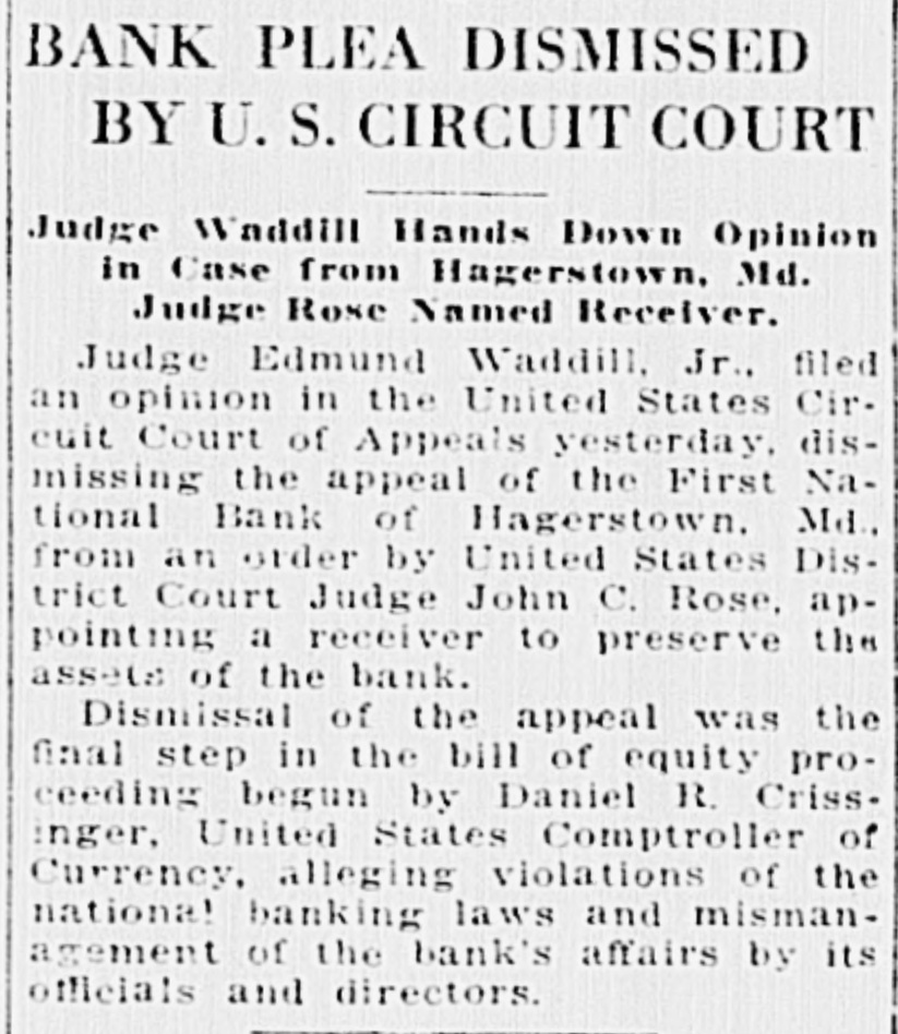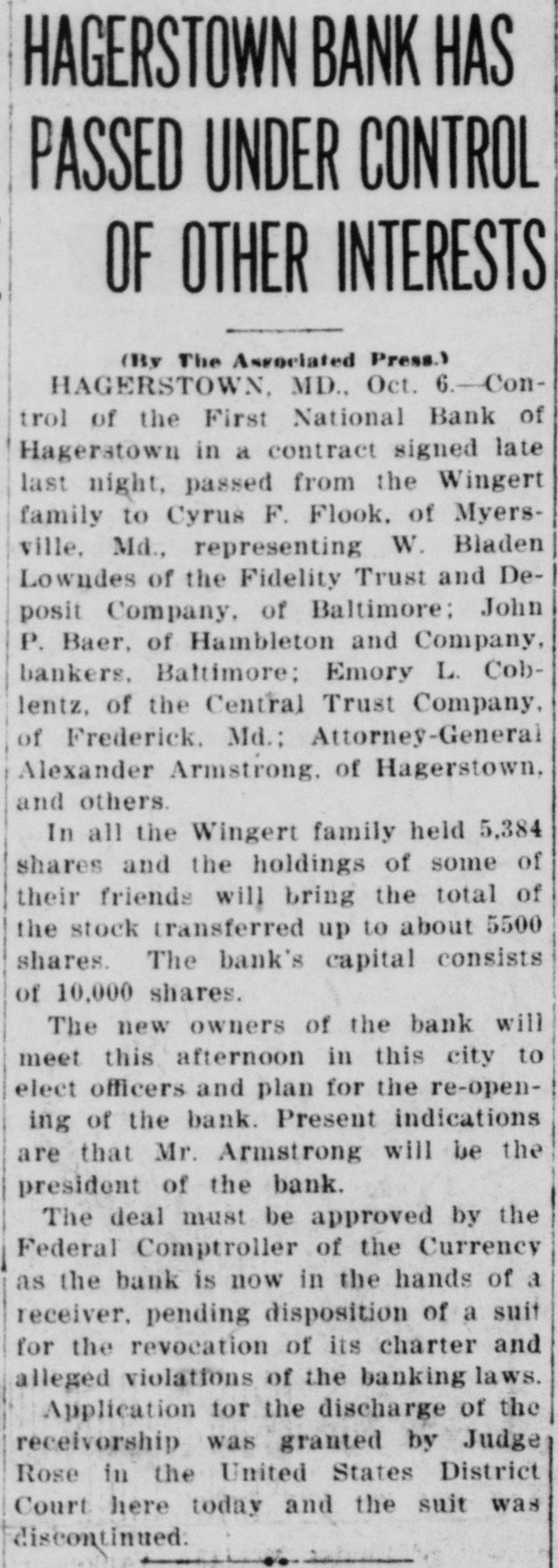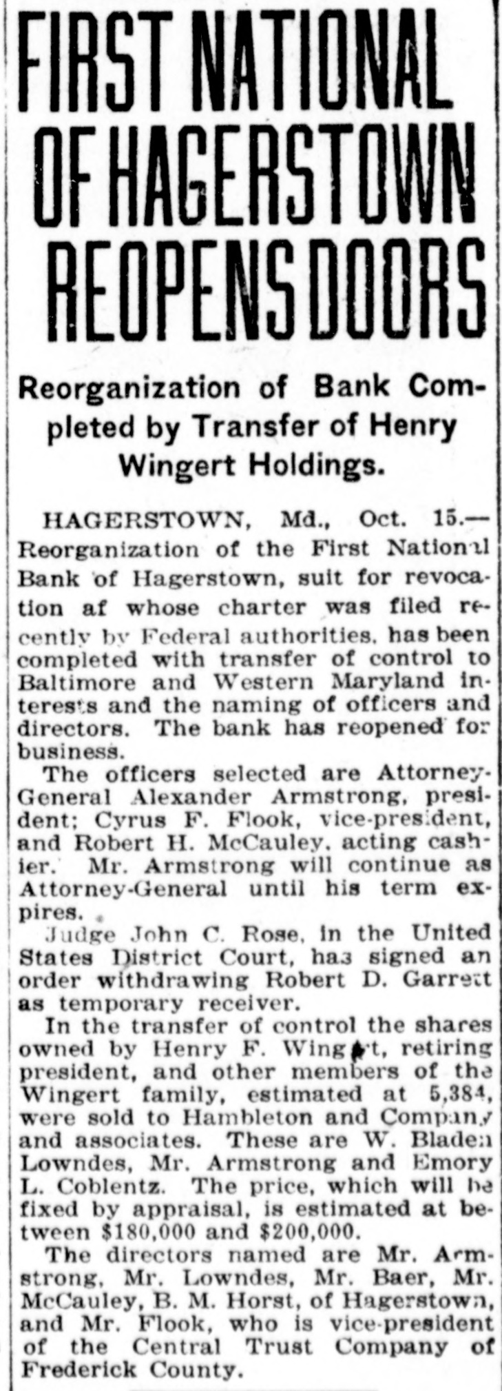 CAPITAL TRACTION NETS $98,097 FOR MONTH OF AUGUST July's Profits Amount to $113,984 and $102,147 Last Year. OU L OTHER LOCAL NOTES Hagerstown Bank's Charter Threatened in Suit Entered In Baltimore. Capital Traction lines operated at a net income of $95,007 during the month.of August, according to rereceived by the Public Utillties Commission for the period ports receipts yesterday. in question Total amounted to $433,698, while expenses totaled $335,601. These figures compare with $102.147 for the corresponding period one year ago, and with $113,984, which represents the net income for July of the present year. Bank May Lose Charter. A suit was entered in the United States Court at Baltimore yesterday by the United States attorney, in the name of the Comptroller of the Currency, to forfeit the charter of the First National Bank of Hagerstown, Md., for violations of the national banking laws. Pending a hearing of the case, the court appointed Robert D. Garrett as temporary receiver in order to conserve the assets of the bank in the interest of the depositors and stockholders. Acting Comptroller T. P. Kane stated that this bank has been a most persistent violator of the banking laws for the past several years. Its management not only deliberately ignored the intructions of the national bank examiners at each examiantion, but has openly defied the admonitions and warnings of the Comptroller until nothing remained for the Comptroller to to to for revocation the is Kane do but further of apply states bank's the that charter. court this only the second case in the history of the national banking system in which forfeiture proceedings have been instituted by the Comptroller for violations of law. In addition to the agricultural loan agencies previously announced by the War Finance Corporation, the following committee, with headquarters at Atlanta, has been appointed to receive applications from Sanks in its district for advances under the recently enacted Section 24 of the War Finance Corporation act, and to make recommendations as to these advances to the War Finance Corporation: Chairman. John K. Ottley; L. R. Adams, C. W. Skinner, Mills B. Lane, Augustus E. Young. W. F. Coachman, D. M. Lowry and T. L. Wilson. Personal. William D. Hoover, president of the National Savings and Trust Company, returned to his desk yesterday morning after an extended vacation spent in the mountains of West Virginia. Local Securities. Trading on the Washington Stock Exchange failed to emerge from the slump which has been prevalent for the past several days in yesterday's listless period. Washington Gas 5s showed considerable strength, $1.00. face value. selling at 82 and 821/4. Capital Traction 5s failed to change their position, $500 selling at 87% In the stock list 25 shares of Capital Traction sold at 86% Call money ruled at 7 per cent asked, with brokers bidding 5 1/2 per cent. .