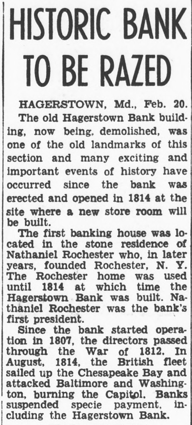 HISTORIC BANK TO BE RAZED HAGERSTOWN, Md., Feb. 20. The old Hagerstown Bank building, now being, demolished, was one of the old landmarks of this section and many exciting and important events of history have occurred since the bank was erected and opened in 1814 at the site where a new store room will be built. The first banking house was located in the stone residence of Nathaniel Rochester who, in later years, founded Rochester, N. Y. The Rochester home was used until 1814 at which time the Hagerstown Bank was built. Nathaniel Rochester was the bank's first president. Since the bank started operation in 1807, the directors passed through the War of 1812. In August, 1814, the British fleet sailed up the Chesapeake Bay and attacked Baltimore and Washington, burning the Capitol. Banks suspended specie payment, including the Hagerstown Bank.
