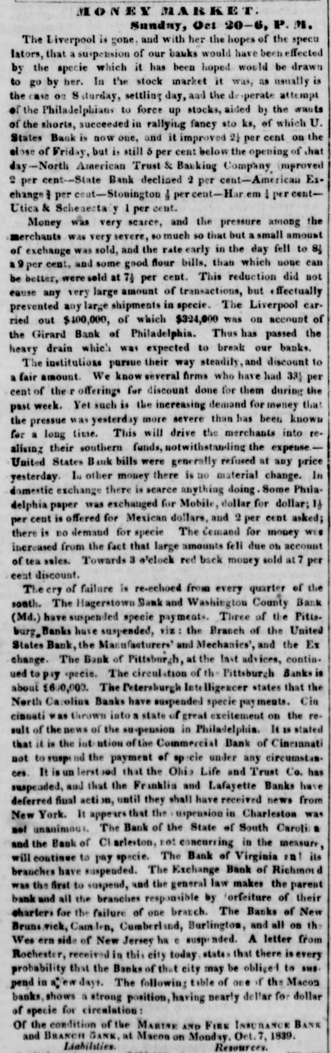 MONEY MARKET. Sunday, Oct 20-6, P. 175. The Liverpool is gone, and with her the hopes of the specu lators, that a suspension of our banks would have been effected by the specie which it has been hoped would be drawn to go by her. In the stock market it was, as usually is the case on Saturday, settling day, and the de operate attempt of the Philadelphians to force up stocks, aided by the wants of the shorts, succeeded in rallying fancy sto ks, of which U. States Bank is now one, and it improved 21 per cent on the close of Friday, but is still 5 per cent below the opening of that day-North American Trust & Banking Company improved 2 per cent--State Bank declined 2 per cent-American Exchange per cout-Stonington & percent-Har.em per centUtica & Schenectaly 1 per cent. Money was very scarce, and the pressure among the merchants was very severe, so much so that but a small amount of exchange was sold, and the rate early in the day fell to 8 per cent. and some good flour bills, than which none can be better, ere sold at 74 per cent. This reduction did not cause any very large amount of transactions, but effectually prevented any large shipments in specie. The Liverpool car. ried out $100,000, of which $324,000 was on account of the Girard Bank of Philadelphia. Thus has passed the heavy drain which was expected to break our banks. The institutions pursue their way steadily, and discount to a fair amount. We know several firms who have had 33 per cent of the r offering for discount done for them during the past week. Yet such is the increasing demand for money that the pressue was yesterday more severe than has been known for a long time. This will drive the merchants into realising their southern funds, notwithstanding the expenseUnited States Bank bills were generally refused at any price yesterday. Iu other money there is ao material change. In domestic exchange there is scarce anything doing. Some Phila. delphia paper was exchanged for Mobile, dollar for dollar; if per cent is offered for Mexican dollars, and 2 per cent asked; there is no demand for specie The demand for money WIS increased from the fact that large amounts feli due on account of tea sales. Towards 3 o'clock red back money sold at 7 per cent discount. The cry of failure is re-echoed from every quarter of the soath. The Hagerstown Bank and Washington County Bank (Md.) have suspended specie payments. Three of the Pitts. burg.Banks have suspended, viz : the Branch of the United States Bank, the Manufacturers' and Mechanics', and the Ex change. The Bank of Pittsburgh, at the last advices, continued pay specie. The circulation of the Pittsburgh Banks is about $600,000. The Petersburgh Intelligencer states that the North Carolina Banks have suspended specie payments. Cin cinnati was thrown into a state of great excitement on the result of the news of the su-pension in Philadelphia. It is stated that it is the intention of the Commercial Bank of Cincinnati not to susp nd the payment of specie under any circumstances. It is un lerstood that the Ohio Life and Trust Co. has suspended, and that the Franklin and Lafayette Banks have deferred fiual action, until they shall have received news from New York. It appears that the uspension in Charleston was not unanimous. The Bank of the State of South Caroli a and the Bank of Charleston, not concurring in the measure, will continue to pay specie. The Bank of Virginia an its branches have suspended. The Exchange Bank of Richmond was the first to suspend, and the general law makes the parent bank and all the branches responsible by orfeiture of their charters for the failure of one bratch. The Banks of New Bruns.vick, Camilan, Cumberland, Burlington, and all on the Wes ern side of New Jersey ha e suspended. A letter from Rochester, received in this city today states that there is every probability that the Banks of that city may be oblige to SHS. pend in The following table of one of the Macon banks, shows a strong position, having nearly dellar for dollar of specie for circulation: or the condition of the MARINE AND FIRE INSURANCE BANK and BRANCH BANK, at Macon on Monday. Oct. 7, 1839. Liabilities. Resources.