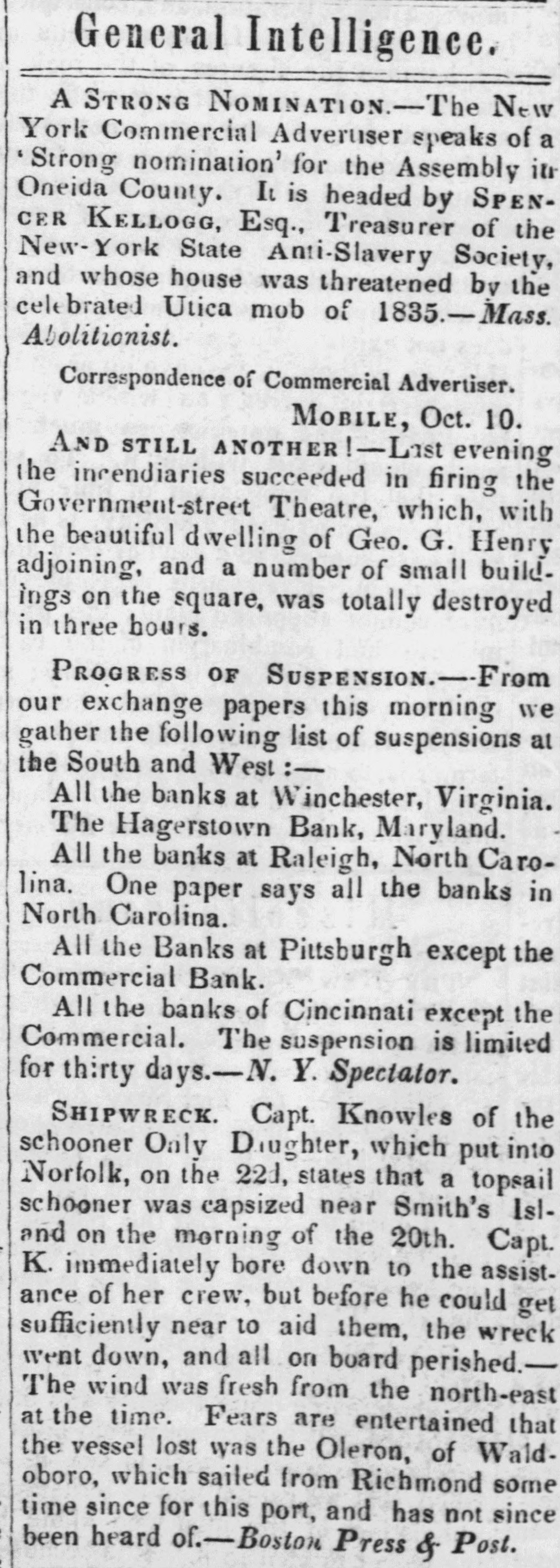 General Intelligence. A STRONG NOMINATION.-The New York Commercial Adveruser speaks of a Strong nomination' for the Assembly in Oneida County. It is headed by SPENCER KELLOGG, Esq., Treasurer of the New-York State Anti-Slavery Society, and whose house was threatened by the cele brated Utica mob of 1835.-Mass. Abolitionist. Correspondence of Commercial Advertiser. MOBILE, Oct. 10. AND STILL ANOTHER 1 Last evening the incendiaries succeeded in firing the Government-street Theatre, which, with the beautiful dwelling of Geo. G. Henry adjoining, and a number of small build. ings on the square, was totally destroyed in three hours. PROGRESS OF SUSPENSION.-From our exchange papers this morning we gather the following list of suspensions at the South and West:All the banks at Winchester, Virginia. The Hagerstown Bank, Maryland. All the banks at Raleigh, North Carolina. One paper says all the banks in North Carolina. All the Banks at Pittsburgh except the Commercial Bank. All the banks of Cincinnati except the Commercial. The suspension is limited for thirty days.-N. Y. Specialor. SHIPWRECK. Capt. Knowles of the schooner Only Daughter, which put into Norfolk, on the 221, states that a topsail schooner was capsized near Smith's Island on the morning of the 20th. Capt. K. immediately bore down to the assistance of her crew, but before he could get sufficiently near to aid them, the wreck went down, and all on board perished.The wind was fresh from the north-east at the time. Fears are entertained that the vessel lost was the Oleron, of Waldoboro, which sailed from Richmond some time since for this port, and has not since been heard of.-Boston Press & Post.