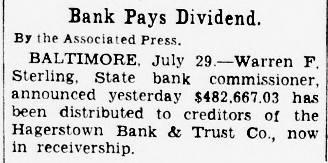 Bank Pays Dividend. By the Associated Press. BALTIMORE. July 29.-Warren F. Sterling, State bank commissioner, announced yesterday $482,667.03 has been distributed to creditors of the Hagerstown Bank & Trust Co., now in receivership.