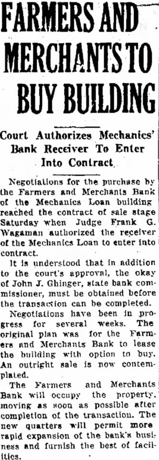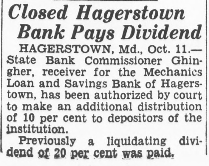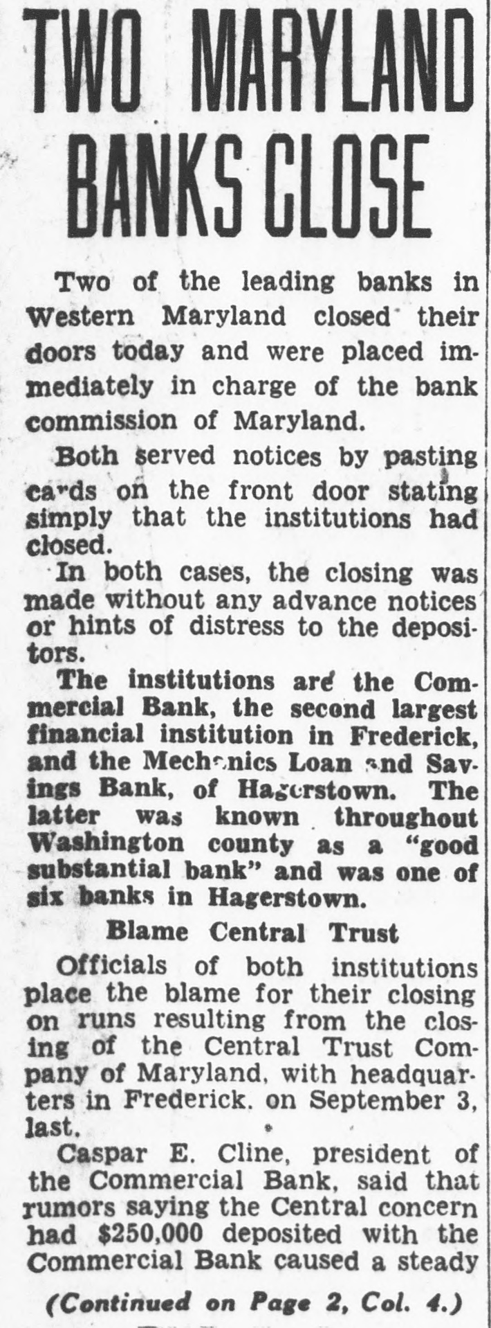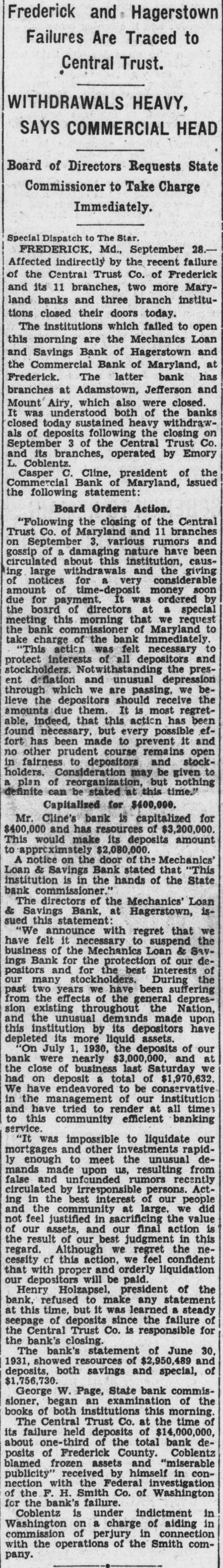 Frederick and Hagerstown Failures Are Traced to Central Trust. WITHDRAWALS HEAVY, SAYS COMMERCIAL HEAD Board of Directors Requests State Commissioner to Take Charge Immediately. Special Dispatch to The Star. FREDERICK, Md., September 28.Affected indirectly by the recent failure of the Central Trust Co. of Frederick and its 11 branches, two more Maryland banks and three branch institutions closed their doors today. The institutions which failed to open this morning are the Mechanics Loan and Savings Bank of Hagerstown and the Commercial Bank of Maryland, at Frederick. The latter bank has branches at Adamstown, Jefferson and Mount® Airy, which also were closed. It was understood both of the banks closed today sustained heavy withdrawals of deposits following the closing on September 3 of the Central Trust Co. and its branches, operated by Emory L. Coblentz. Casper C. Cline, president of the Commercial Bank of Maryland, issued the following statement: Board Orders Action. "Foliowing the closing of the Central Trust Co. of Maryland and 11 branches on September 3. various rumors and gossip of a damaging nature have been circulated about this institution, causing large withdrawals and the giving of notices for a very considerable amount of time-deposit money soon due for payment. It was ordered by the board of directors at a special meeting this morning that we request the bank commissioner of Maryland to take charge of the bank immediately. "This action was felt necessary to protect interests of all depositors and stockholders. Notwithstanding the present deflation and unusual depression through which we are passing, we believe the depositors should receive the amounts due them. It is most regretable, indeed, that this action has been found necessary, but every possible effort has been made to prevent it and no other prudent course remains open in fairness to depositors and stockholders. Consideration may be given to a plan of reorganization, but nothing definite can be stated at this time." Capitalized for $400,000. Mr. Cline's bank is capitalized for $400,000 and has resources of $3,200,000. This would make its deposits amount to approximately $2,080,000. A notice on the door of the Mechanics' Loan & Savings Bank stated that "This institution is in the hands of the State bank commissioner." The directors of the Mechanics' Loan & Savings Bank, at Hagerstown, issued this statement: "We announce with regret that we have felt it necessary to suspend the business of the Mechanics Loan & Savings Bank for the protection of our depositors and for the best interests of our many stockholders. During the past two years we have been suffering from the effects of the general depression existing throughout the Nation, and the unusual demands made upon this institution by its depositors have depleted its more liquid assets. "On July 1, 1930, the deposits of our bank were nearly $3,000,000, and at the close of business last Saturday we had on deposit a total of $1,970,632. We have endeavored to be conservative in the management of our institution and have tried to render at all time to this community efficient banking service. "It was impossible to liquidate our mortgages and other investments rapidly enough to meet the unusual demands made upon us, resulting from false and unfounded rumors recently circulated by irresponsible persons. Acting in the best interest of our people and the community at large. we did not feel justified in sacrificing the value of our assets, and our final action is the result of our best judgment in this regard. Although we regret the necessity of this action, we feel confident that with proper and orderly liquidation our depositors will be paid. Henry Holzapsel, president of the bank, refused to make any statement at this time, but it was learned a steady seepage of deposits since the failure of the Central Trust Co. is responsible for the bank's closing. The bank's statement of June 30, 1931, showed resources of $2,950,489 and deposits, both savings and special, of $1,756,730. George W. Page, State bank commissioner, began an examination of the books of both institutions this morning. The Central Trust Co. at the time of its failure held deposits of $14,000,000, about one-third of the total bank deposits of Frederick County. Coblentz blamed frozen assets and "miserable publicity" received by himself in connection with the Federal investigation of the F. H. Smith Co. of Washington for the bank's failure. Coblentz is under indictment in Washington on a charge of aiding in commission of perjury in connection with the operations of the Smith company.
