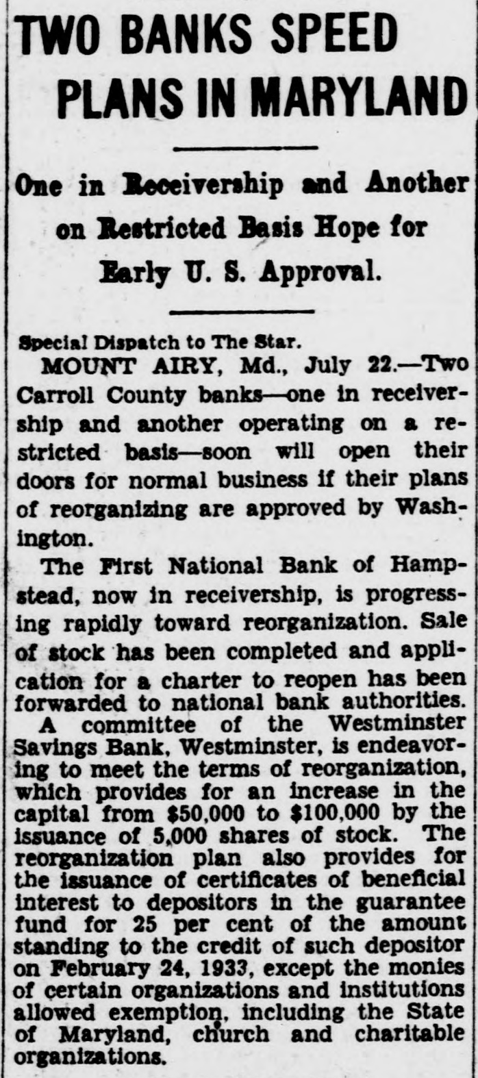 TWO BANKS SPEED PLANS IN MARYLAND One in Receivership and Another on Restricted Basis Hope for Early U. S. Approval. Special Dispatch to The Star. MOUNT AIRY, Md., July 22.-Two Carroll County banks-one in receivership and another operating on a restricted basis-soon will open their doors for normal business if their plans of reorganizing are approved by Washington. The First National Bank of Hampstead, now in receivership, is progressing rapidly toward reorganization. Sale of stock has been completed and application for a charter to reopen has been forwarded to national bank authorities. A committee of the Westminster Savings Bank, Westminster, is endeavoring to meet the terms of reorganization, which provides for an increase in the capital from $50,000 to $100,000 by the issuance of 5,000 shares of stock. The reorganization plan also provides for the issuance of certificates of beneficial interest to depositors in the guarantee fund for 25 per cent of the amount standing to the credit of such depositor on February 24, 1933, except the monies of certain organizations and institutions allowed exemption, including the State of Maryland, church and charitable organizations.