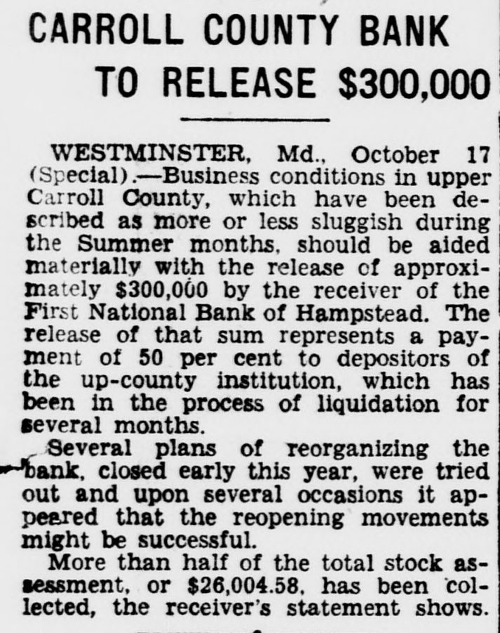 CARROLL COUNTY BANK TO RELEASE $300,000 WESTMINSTER, Md., October 17 (Special) - -Business conditions in upper Carroll County, which have been described as more or less sluggish during the Summer months. should be aided materially with the release of approximately $300,000 by the receiver of the First National Bank of Hampstead. The release of that sum represents a payment of 50 per cent to depositors of the up-county institution, which has been in the process of liquidation for several months. Several plans of reorganizing the bank, closed early this year, were tried out and upon several occasions it appeared that the reopening movements might be successful. More than half of the total stock assessment, or $26,004.58, has been collected, the receiver's statement shows.