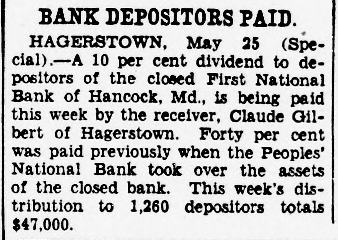 BANK DEPOSITORS PAID. HAGERSTOWN, May 25 (Special).-A 10 per cent dividend to depositors of the closed First National Bank of Hancock, Md., is being paid this week by the receiver, Claude Gilbert of Hagerstown. Forty per cent was paid previously when the Peoples' National Bank took over the assets of the closed bank. This week's distribution to 1,260 depositors totals $47,000.