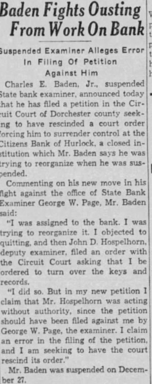 Baden Fights Ousting Suspended Examiner Alleges Error In Filing Of Petition Against Charles Baden. Jr., suspended State bank today that has filed petition in the cuit Court of Dorchester county seekto have rescinded court order forcing the Citizens Bank of Hurlock. closed stitution which Mr. Baden says he trying when he was pended. Commenting his new against the of State Bank George W. Page, Mr. Baden assigned to the trying reorganize objected deputy filed order the Circuit Court asking that ordered turn the keys and records. But petition that Mr. Hospelhorn was acting without authority, the petition should have filed against George Page, error the filing the petition, seeking to have the its Mr. Baden was suspended on Decem-