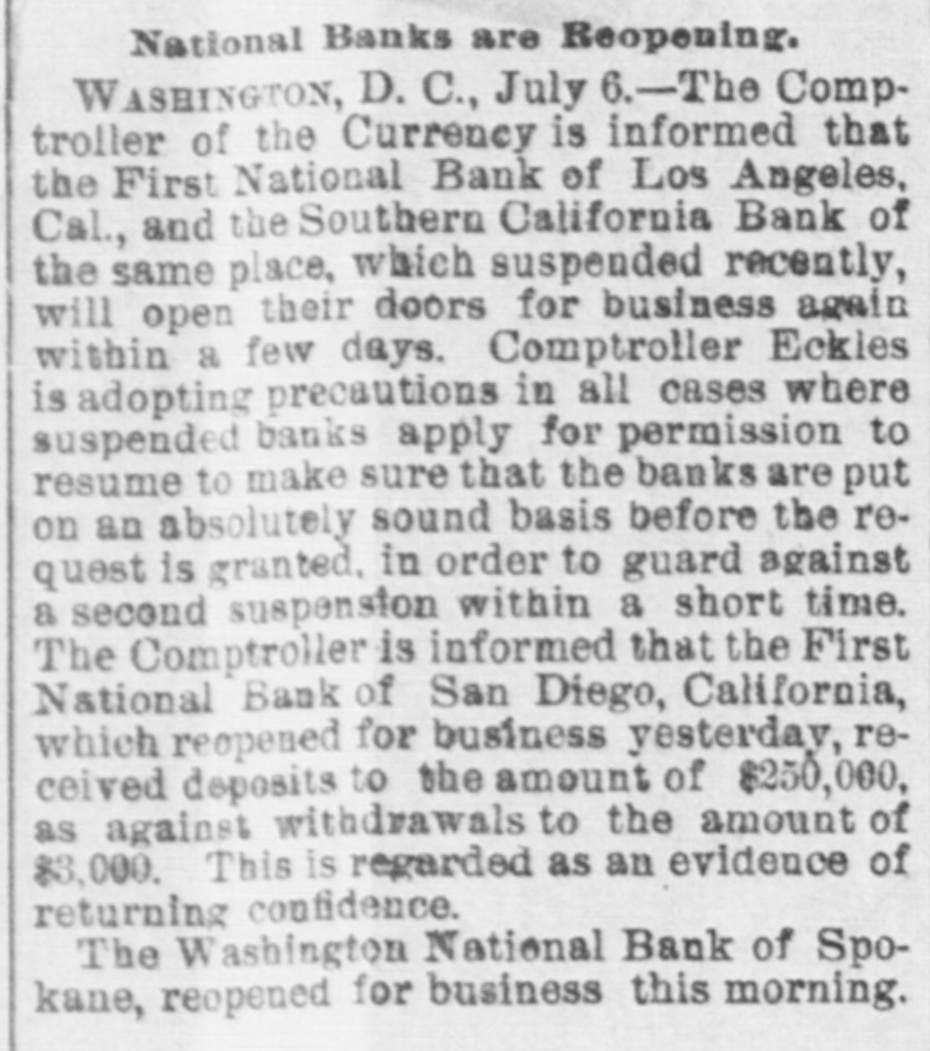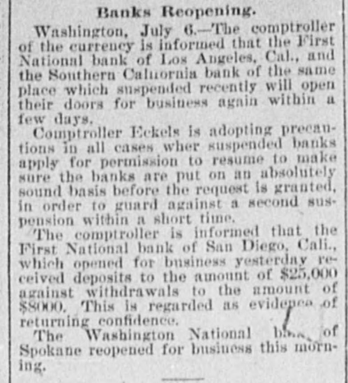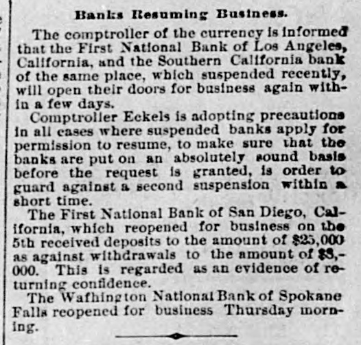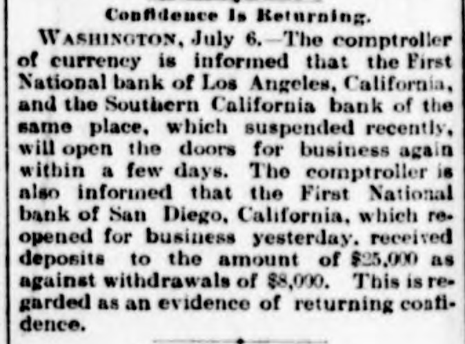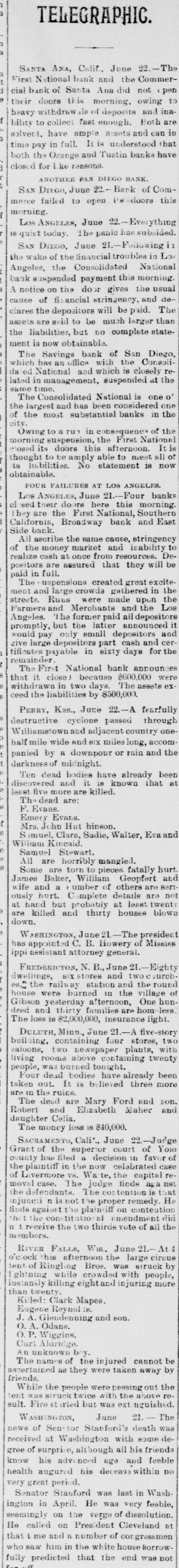 ELEGRAPHIC. SANTA ANA, Calif., June 22.-The National bank and the CommerFirst bank of Santa Ana did not pen to cial doors this morning. owing f heavy their withdraw sle of deposits Both and ina- are bility to collect fast enough. in solvent. have ample assets and can that in full. It is understood time both pay the Orange and Tustin banks have i closed for like reasons. ANOTHER PAN DIEGO BANK. DIEGO, June 22.- Bank of Com- this merce SAN failed to open its doors i morning Los ANGELES, June Everything IS quiet today. The panic has subsided. in SAN Diego, June ,--Following Los wake of the financial troubles National in the Angeles, the Consolidated morning. bank suspended payment this usual notice on the door gives the deA of financial stringency, and clares cause the depositors will be paid. than The assets are said to be much larger the liabilities, but DO complete statement is now obtainable Savings bank of San Consoli Diego, The office with the which National has an and which is closely at the related dated in management, suspended time. same The Consolidated National is one one o' and has been considered in the the of the largest most substantial banks city. to run in consequence National of the Owing suspension, the First It is morning closed its doors this afternoon. all of amply able to meet thought is liabilities. No statement is now obtainable. FOUR FAILURES AT LOS ANGELES. Los ANGELES, June 21 Four banks doors here this morning. el eed their the First National, Southern East California, They are Broadway back and Side bank. ascribe the same cause, stringency to All the money market and licability De of cash at once from resources. will be positors realize are assured that they paid in full. suspensions created great excite- the The and large crowda gathered in the ment Ruus were made upon streets. Farmers and Merchants and the Los he former paid all depositors Angeles. but the latter announced and promptly, only email depositors and cerwould pay depositor part cash the tificates give large payable in sixty days for remainder The First National bank announces were it close because $600,000 assets exthat in two days. The ceed withdraw the liabilities by $500,000. PERRY, Kas., June 22.- A fearfully destructive cyclone passed through Williamstown and adjacent country onehalf mile wide and six miles long, accom the panied by a downpour or rain and t darkness of midnight. dead bodies have already been at discovered Ten and it is known that least five more are killed. The dead are: F. Evans. Emery Evans. if John Hut hinson. Simuel, Mrs. Clara, Sadie, Walter, Eva and William Kincaid. Samuel Stewart. s are horribly mangled. All are torn to pieces. fatally hurt Some Baker, William Geopfert seri- and James umber of others are wife and hurt. Complete details are twenty not ously hand but probably at least blowe at are killed and thirty houses down. WASHINGTON, June 21 The president Missies has appointed C. B. Howery of ippi assistant attorney general. FREDERICTON, N. B., June 21. Eighty urebsix stores and two dwellings, the railway station and the village round of es were burned in the Gibson house yesterday families afternoon, are hom One less hundred The loss and 18 thirty $2,000,000, insurance light. DULUTH, Minn., June 21 stores, A five-story two containing four with building, newspaper plants, saloons, two containing twenty living rooms above was arned tonight. people, dead bodies have already been taken Four out. It is believed three more are in the ruice. are Mary Ford and son. Robert The dead and Elizabeth Maher and daughter Celia. The money loss is $40,000. SACRAMENTO, Calif., June 22 -Judge the superior court of Yoio county Grant of has filed decision III favor ted case plaintiff in the now the Livermore vs. Wa te, the capital of The judge tieds aga moval case. tention is that the defendants The cos n is not the proper remedy. finds injuncti agaiest con-titational the plainsiff emendment on conteation the the receive the the two thirds vote of all members. RIVER FALLS, W18. June 21.-At *clock this afternoon the large circus tentof Ringling while crowded Broe. was with struck people, than twenty. instantly `ghtning killing eightand injuring more Killed: Clark Mapes. Eugese Reynolds J.A. leudenning and SOD. O.A. Odans. O.P. Wiggins. Curt Aldridge. unknown boy. An names of the injured cannot ascertained The as they were taken away friends. While the people were passing above out the was struck twice with the 21 Jane sult. tent Fire et arted but was ext nguished. The WASHINGTON, of Senstor Stanford's death was dereceived news at Washington with some gree of surprise, alt though all his friends feeble his advenced age and health know augured his decease within no very great period. Senator Stauford was last in Washington in April. He was very feable, seemingly on the verge of dissolution. called on President Cleveland at that He t me and a number of con gressmen who saw him in the wh ite house Borrowfully predicted that the end was not