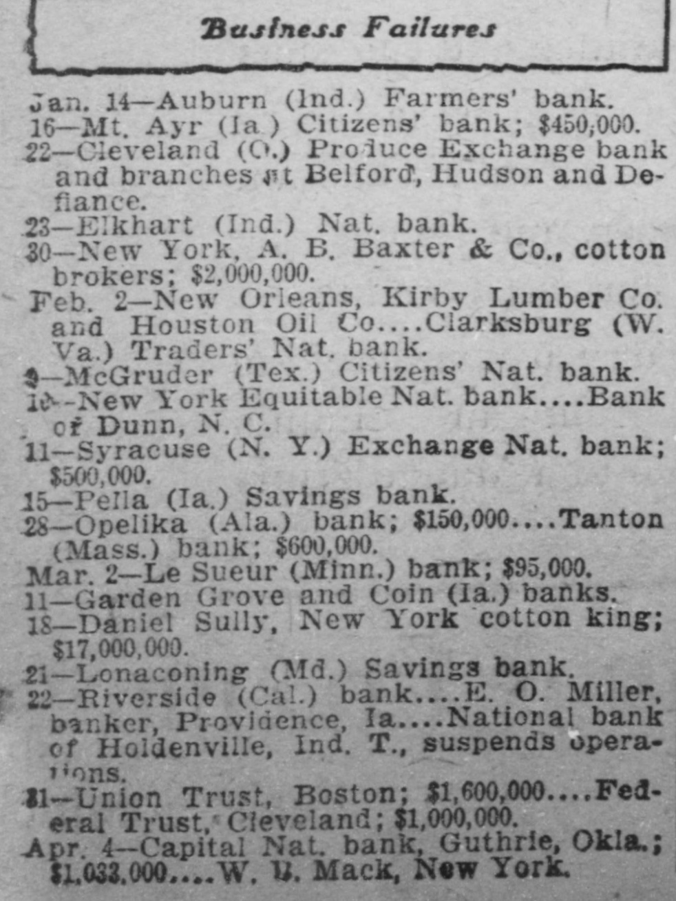 Business Failures Jan. 14-Auburn (Ind.) Farmers' bank. 16-Mt. Ayr (la.) Citizens' bank; $450,000. 22-Cleveland (0.) Produce Exchange bank and branches at Belford, Hudson and Defiance. 23-Elkhart (Ind.) Nat. bank. 30-New York, A. B. Baxter & Co., cotton brokers; $2,000,000. Feb. 2-New Orleans, Kirby Lumber Co. and Houston Oil Co. Clarksburg (W. Va.) Traders' Nat. bank. 9-McGruder (Tex.) Citizens' Nat. bank. 10-New York Equitable Nat. bank Bank of Dunn, N. C. 11-Syracuse (N. Y.) Exchange Nat. bank; $500,000. 15-Peila (Ia.) Savings bank. 28-Opelika (Ala.) bank; $150,000 Tanton (Mass.) bank; $600,000. Mar. 2-Le Sueur (Minn.) bank; $95,000. 11-Garden Grove and Coin (Ia.) banks. 18-Daniel Sully, New York cotton king; $17,000,000. 21-Lonaconing (Md.) Savings bank. 22-Riverside (Cal.) bank....E. O. Miller, National bank banker, Providence, Ia of Holdenville, Ind. T., suspends operaHons. 81-Union Trust, Boston; $1,600,000....Federal Trust, Cleveland; $1,000,000. Apr +Capital Nat. bank, Guthrie, Okla.; $1,033.000 W. B. Mack, New York.