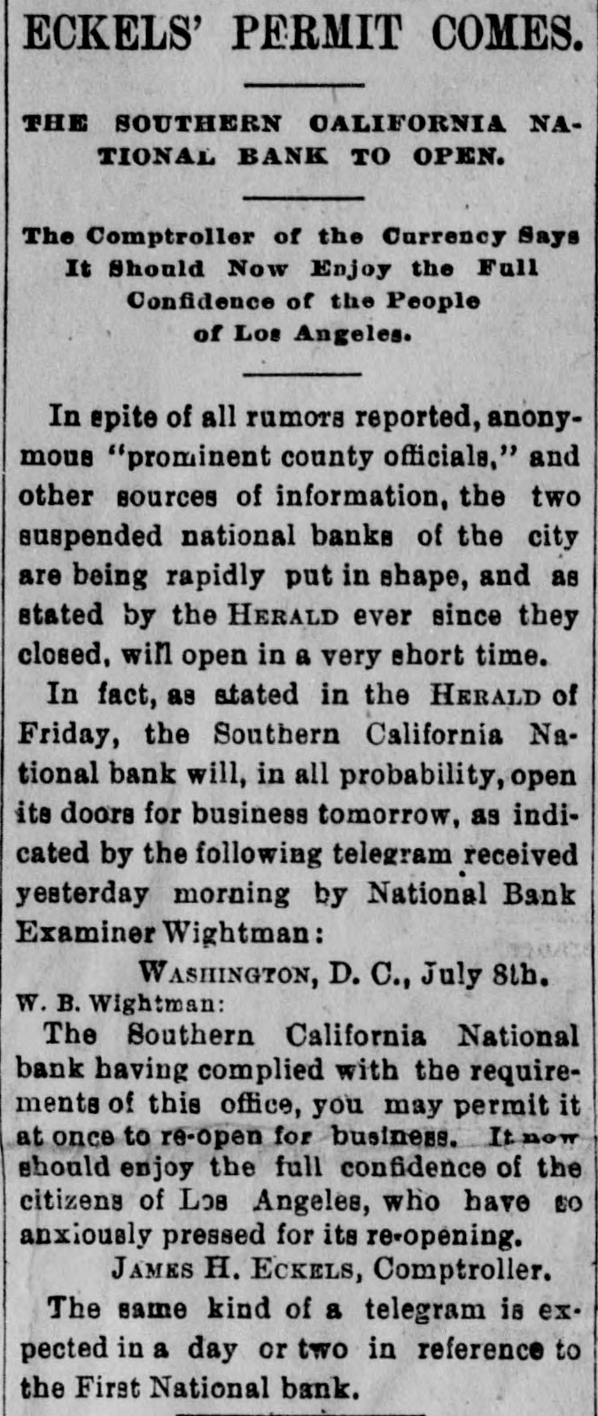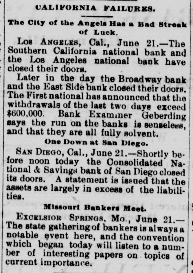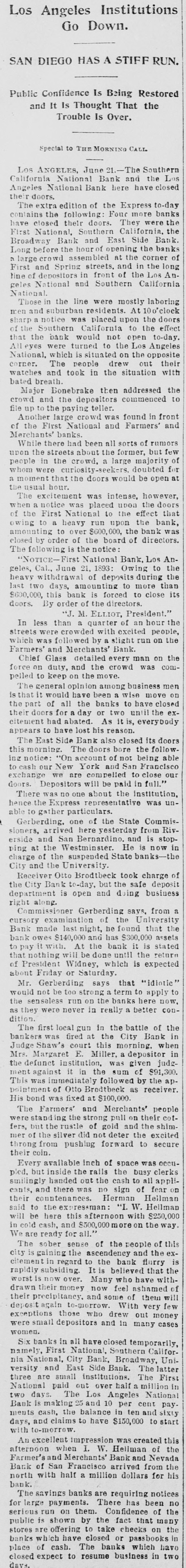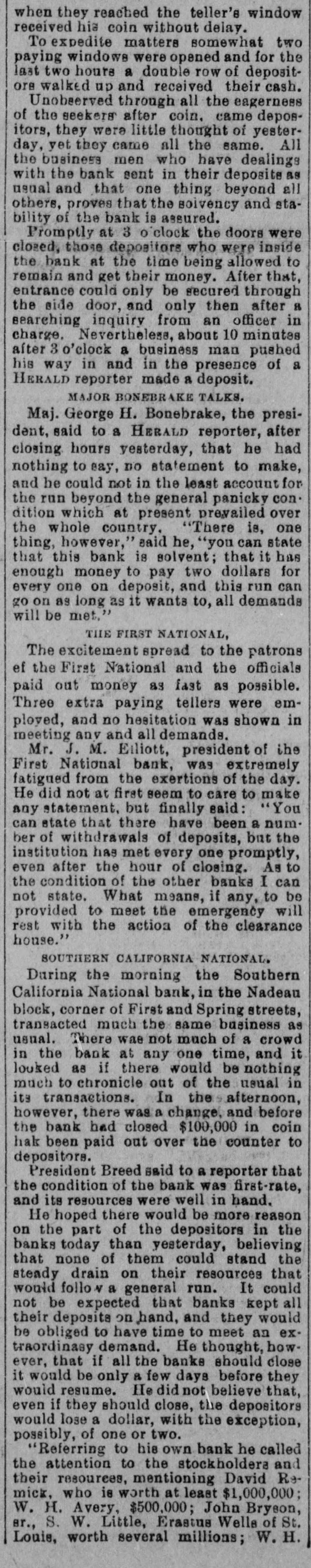 when they reached the teller's window received hia coin without delay. To expedite matters somewhat two paying windows were opened and for the last two hours a double row of depositore walked up and received their cash. Unobeerved through all the eagerness of the seekers after coin. came depositors, they were little thought of yesterday, yet they came all the same. All the business men who have dealings with the bank sent in their deposite as usual and that one thing beyond all others, proves that the solvency and stability of the bank is assured. Promptly at 3 o clock the doors were closed, those depositors who were inside the bank at the time being allowed to remain and get their money. After that, entrance could only be secured through the side door, and only then after H searching inquiry from an officer in charge. Nevertheless, about 10 minutes after 3 o'clock a business man pushed a his way in and in the presence of HERALD reporter made a deposit. MAJOR BONEBRAKE TALKS. Maj. George H. Bonebrake, the president, said to a HERALD reporter, after closing hours yesterday, that he had nothing to say, DO statement to make, and he could not in the least account for the run beyond the general panicky con. dition which at present prevailed over the whole country. "There is, one thing, however," said he, "you can state that this bank is solvent; that it has enough money to pay two dollars for every one on deposit, and this run can go on as long as it wants to, all demands will be met." THE FIRST NATIONAL, The excitement spread to the patrons ef the First National and the officials paid out money as fast as possible. Three extra paying tellers were employed, and no hesitation was shown in meeting any and all demands. Mr. J. M. Eiliott, president of the First National bank, was extremely fatigued from the exertions of the day. He did not at first seem to care to make any statement, but finally said: "You can state that there have been a number of withdrawals of deposits, but the institution has met every one promptly, even after the hour of closing. As to the condition of the other banks I can not state. What means, if any, to be provided to meet the emergency will rest with the action of the clearance house." SOUTHERN CALIFORNIA NATIONAL. During the morning the Southern California National bank, in the Nadeau block, corner of First and Spring streets, transacted much the same business as usual. There was not much of a crowd in the bank at any one time, and it louied as if there would be nothing much to chronicle out of the usual in its transactions. In the afternoon, however, there was a change, and before the bank had closed $100,000 in coin hak been paid out over the counter to depositors. President Breed said to a reporter that the condition of the bank was first-rate, and its resources were weil in hand. He hoped there would be more reason on the part of the depositors in the banks today than yesterday, believing that none of them could stand the steady drain on their resources that would follow a general run. It could not be expected that banks kept all their deposits on hand, and they would be obliged to have time to meet an extraordinasy demand. He thought, however, that if all the banks should close it would be only a few days before they would resume. He did not believe that, even if they should close, the depositors would lose a dollar, with the exception, possibly, of one or two. "Referring to his own bank he called the attention to the stockholdera and their resources, mentioning David Remick, who is worth at least $1,000,000; W. H. Avery, $500,000; John Bryeon, ar., S. W. Little, Erastus Wells of St. Louis, worth several millions; W. H.