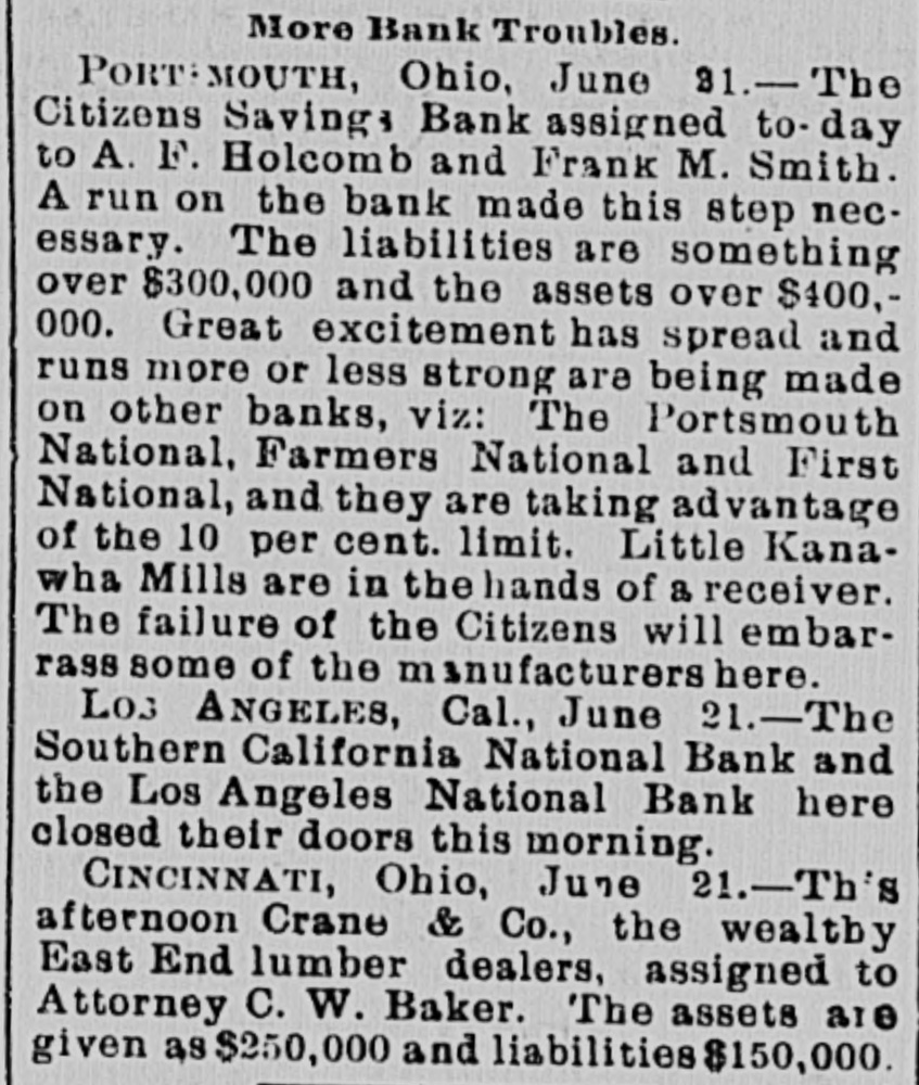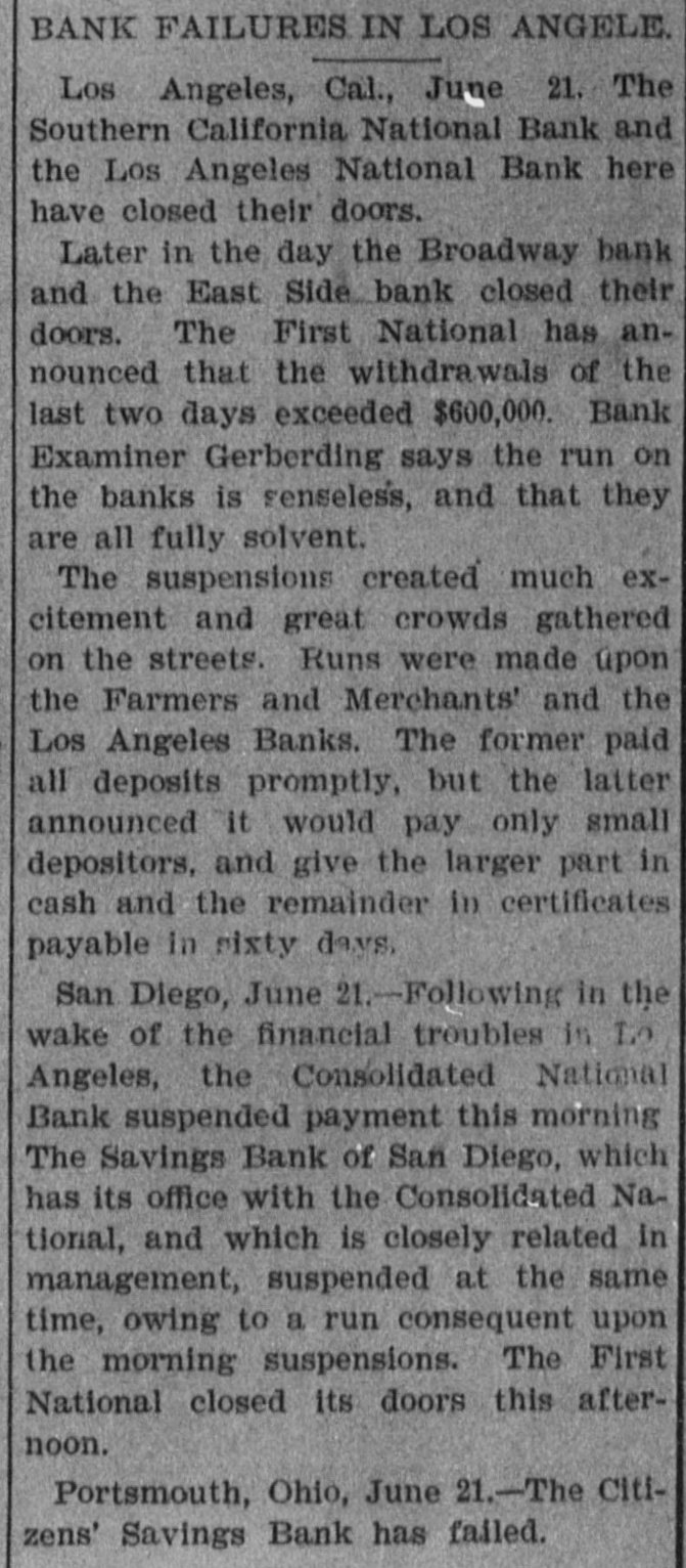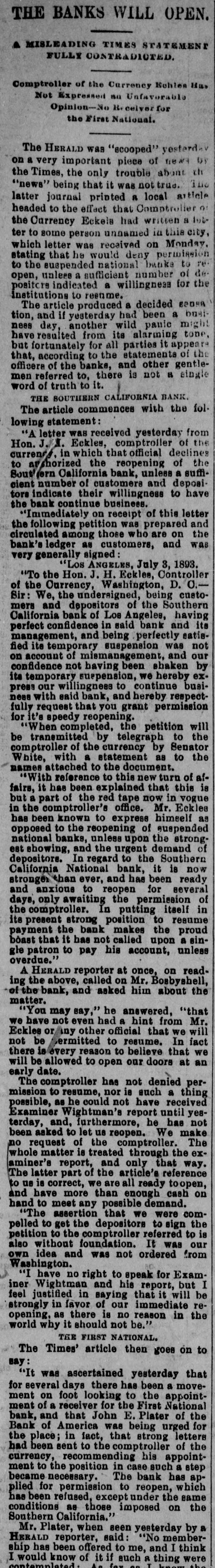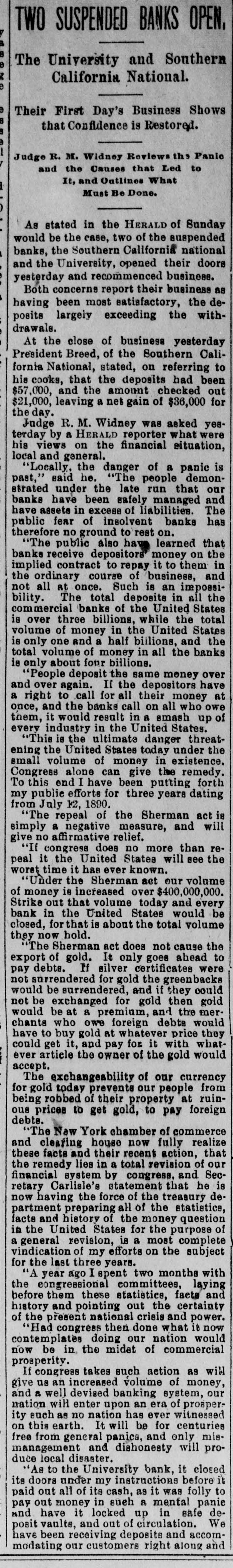 when they reached the teller's window received hia coin without delay. To expedite matters somewhat two paying windows were opened and for the last two hours a double row of depositore walked up and received their cash. Unobeerved through all the eagerness of the seekers after coin. came depositors, they were little thought of yesterday, yet they came all the same. All the business men who have dealings with the bank sent in their deposite as usual and that one thing beyond all others, proves that the solvency and stability of the bank is assured. Promptly at 3 o clock the doors were closed, those depositors who were inside the bank at the time being allowed to remain and get their money. After that, entrance could only be secured through the side door, and only then after H searching inquiry from an officer in charge. Nevertheless, about 10 minutes after 3 o'clock a business man pushed a his way in and in the presence of HERALD reporter made a deposit. MAJOR BONEBRAKE TALKS. Maj. George H. Bonebrake, the president, said to a HERALD reporter, after closing hours yesterday, that he had nothing to say, DO statement to make, and he could not in the least account for the run beyond the general panicky con. dition which at present prevailed over the whole country. "There is, one thing, however," said he, "you can state that this bank is solvent; that it has enough money to pay two dollars for every one on deposit, and this run can go on as long as it wants to, all demands will be met." THE FIRST NATIONAL, The excitement spread to the patrons ef the First National and the officials paid out money as fast as possible. Three extra paying tellers were employed, and no hesitation was shown in meeting any and all demands. Mr. J. M. Eiliott, president of the First National bank, was extremely fatigued from the exertions of the day. He did not at first seem to care to make any statement, but finally said: "You can state that there have been a number of withdrawals of deposits, but the institution has met every one promptly, even after the hour of closing. As to the condition of the other banks I can not state. What means, if any, to be provided to meet the emergency will rest with the action of the clearance house." SOUTHERN CALIFORNIA NATIONAL. During the morning the Southern California National bank, in the Nadeau block, corner of First and Spring streets, transacted much the same business as usual. There was not much of a crowd in the bank at any one time, and it louied as if there would be nothing much to chronicle out of the usual in its transactions. In the afternoon, however, there was a change, and before the bank had closed $100,000 in coin hak been paid out over the counter to depositors. President Breed said to a reporter that the condition of the bank was first-rate, and its resources were weil in hand. He hoped there would be more reason on the part of the depositors in the banks today than yesterday, believing that none of them could stand the steady drain on their resources that would follow a general run. It could not be expected that banks kept all their deposits on hand, and they would be obliged to have time to meet an extraordinasy demand. He thought, however, that if all the banks should close it would be only a few days before they would resume. He did not believe that, even if they should close, the depositors would lose a dollar, with the exception, possibly, of one or two. "Referring to his own bank he called the attention to the stockholdera and their resources, mentioning David Remick, who is worth at least $1,000,000; W. H. Avery, $500,000; John Bryeon, ar., S. W. Little, Erastus Wells of St. Louis, worth several millions; W. H.