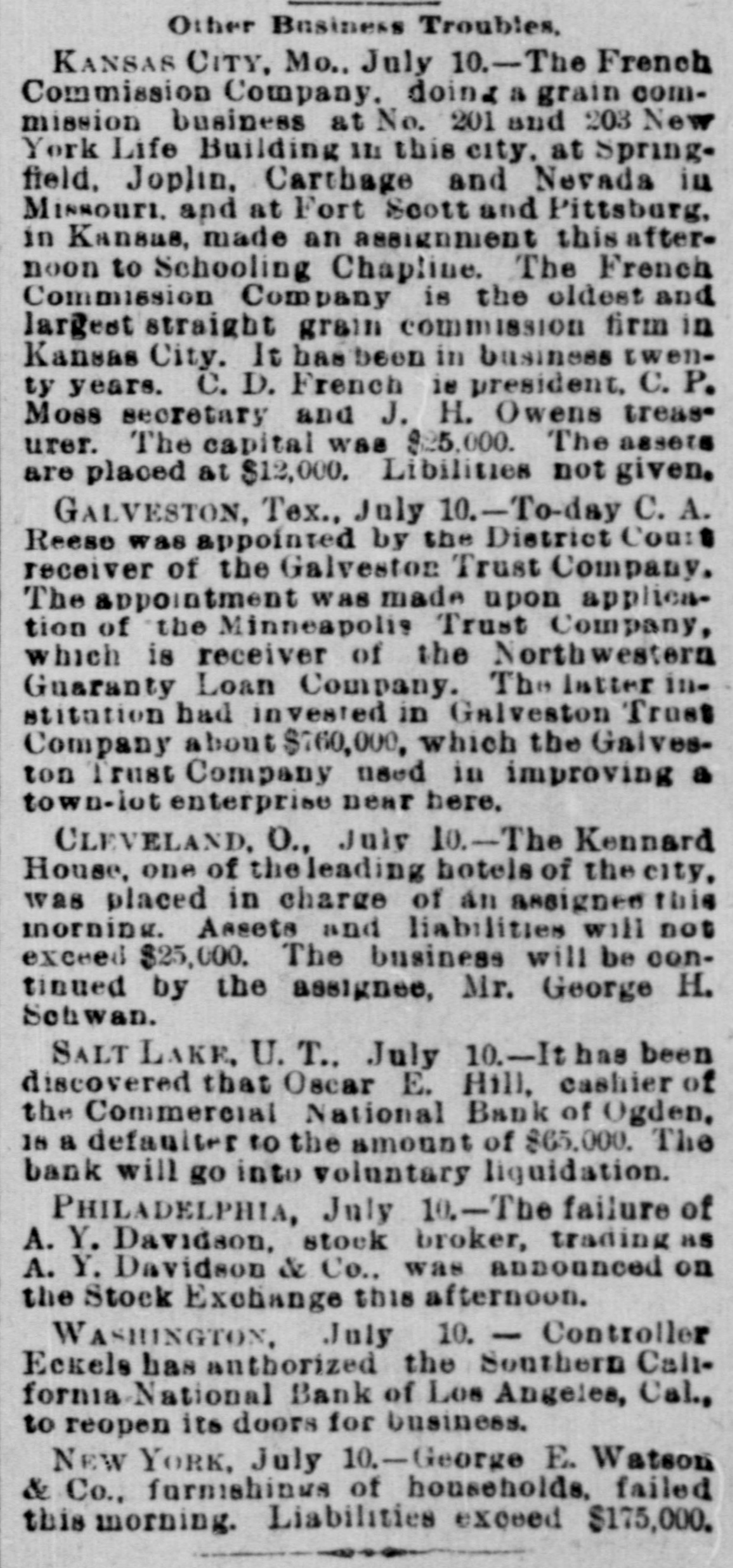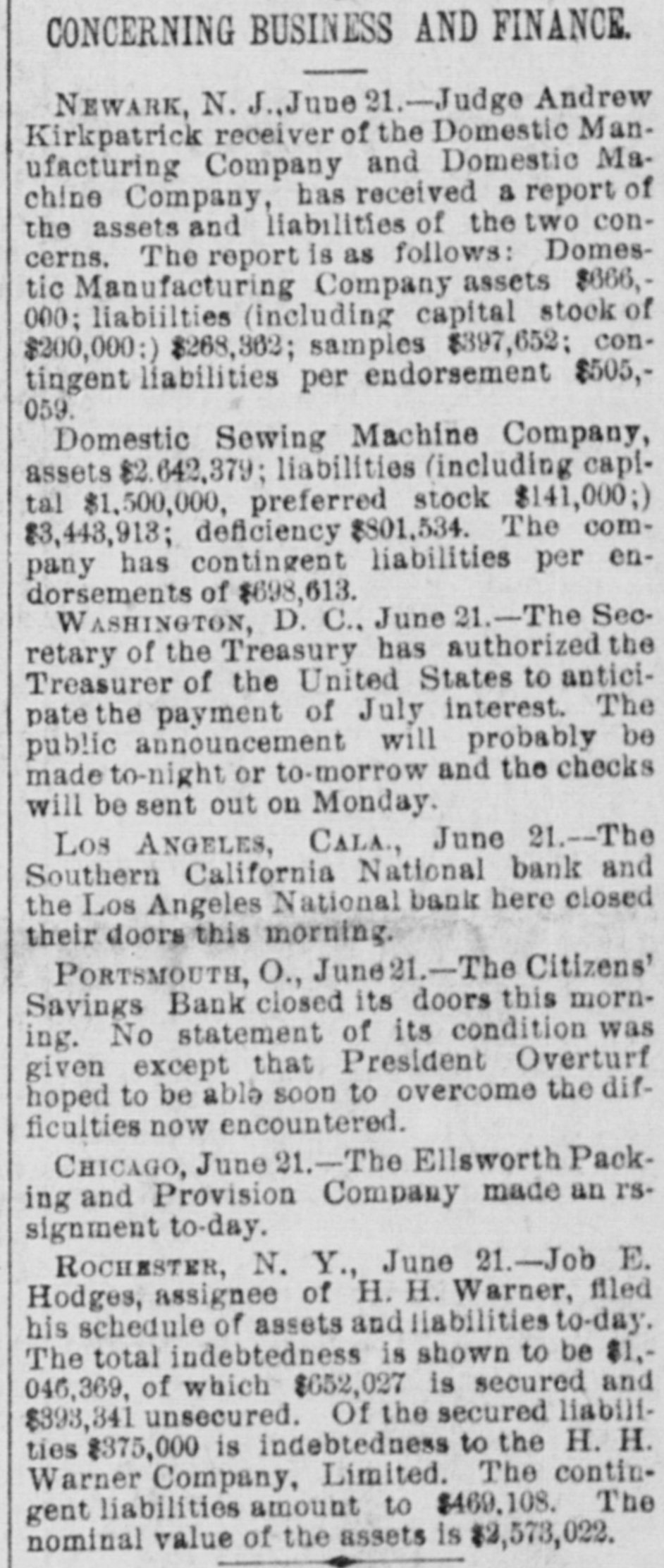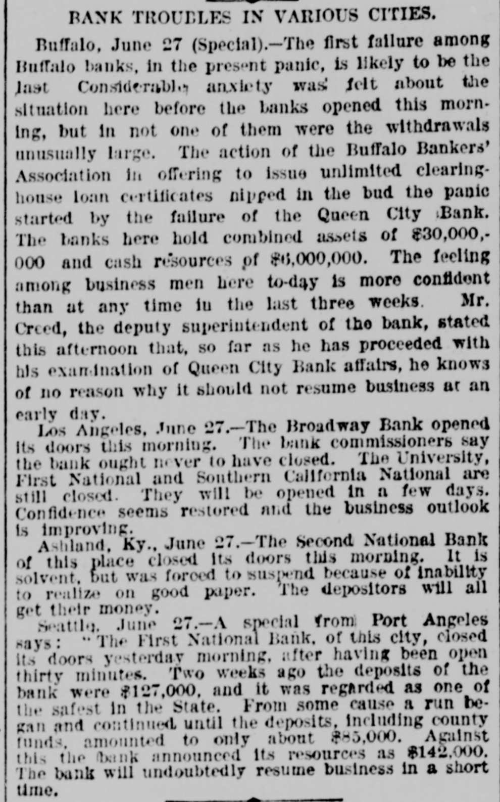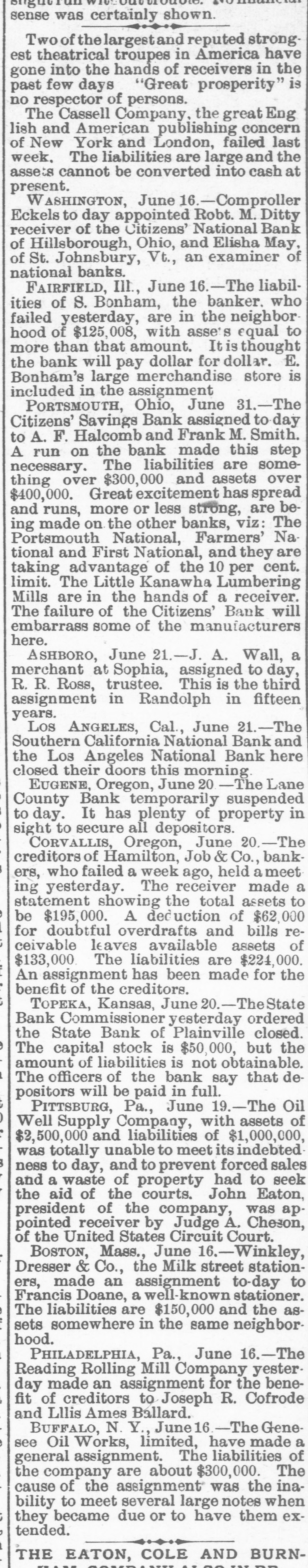 when they reached the teller's window received hia coin without delay. To expedite matters somewhat two paying windows were opened and for the last two hours a double row of depositore walked up and received their cash. Unobeerved through all the eagerness of the seekers after coin. came depositors, they were little thought of yesterday, yet they came all the same. All the business men who have dealings with the bank sent in their deposite as usual and that one thing beyond all others, proves that the solvency and stability of the bank is assured. Promptly at 3 o clock the doors were closed, those depositors who were inside the bank at the time being allowed to remain and get their money. After that, entrance could only be secured through the side door, and only then after H searching inquiry from an officer in charge. Nevertheless, about 10 minutes after 3 o'clock a business man pushed a his way in and in the presence of HERALD reporter made a deposit. MAJOR BONEBRAKE TALKS. Maj. George H. Bonebrake, the president, said to a HERALD reporter, after closing hours yesterday, that he had nothing to say, DO statement to make, and he could not in the least account for the run beyond the general panicky con. dition which at present prevailed over the whole country. "There is, one thing, however," said he, "you can state that this bank is solvent; that it has enough money to pay two dollars for every one on deposit, and this run can go on as long as it wants to, all demands will be met." THE FIRST NATIONAL, The excitement spread to the patrons ef the First National and the officials paid out money as fast as possible. Three extra paying tellers were employed, and no hesitation was shown in meeting any and all demands. Mr. J. M. Eiliott, president of the First National bank, was extremely fatigued from the exertions of the day. He did not at first seem to care to make any statement, but finally said: "You can state that there have been a number of withdrawals of deposits, but the institution has met every one promptly, even after the hour of closing. As to the condition of the other banks I can not state. What means, if any, to be provided to meet the emergency will rest with the action of the clearance house." SOUTHERN CALIFORNIA NATIONAL. During the morning the Southern California National bank, in the Nadeau block, corner of First and Spring streets, transacted much the same business as usual. There was not much of a crowd in the bank at any one time, and it louied as if there would be nothing much to chronicle out of the usual in its transactions. In the afternoon, however, there was a change, and before the bank had closed $100,000 in coin hak been paid out over the counter to depositors. President Breed said to a reporter that the condition of the bank was first-rate, and its resources were weil in hand. He hoped there would be more reason on the part of the depositors in the banks today than yesterday, believing that none of them could stand the steady drain on their resources that would follow a general run. It could not be expected that banks kept all their deposits on hand, and they would be obliged to have time to meet an extraordinasy demand. He thought, however, that if all the banks should close it would be only a few days before they would resume. He did not believe that, even if they should close, the depositors would lose a dollar, with the exception, possibly, of one or two. "Referring to his own bank he called the attention to the stockholdera and their resources, mentioning David Remick, who is worth at least $1,000,000; W. H. Avery, $500,000; John Bryeon, ar., S. W. Little, Erastus Wells of St. Louis, worth several millions; W. H.