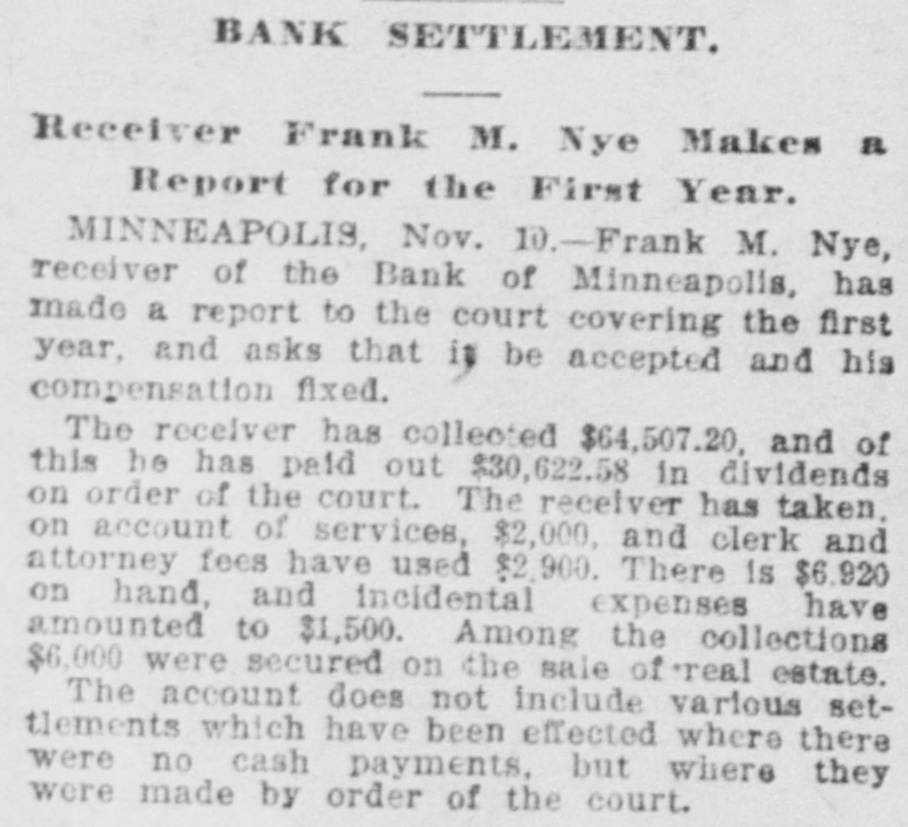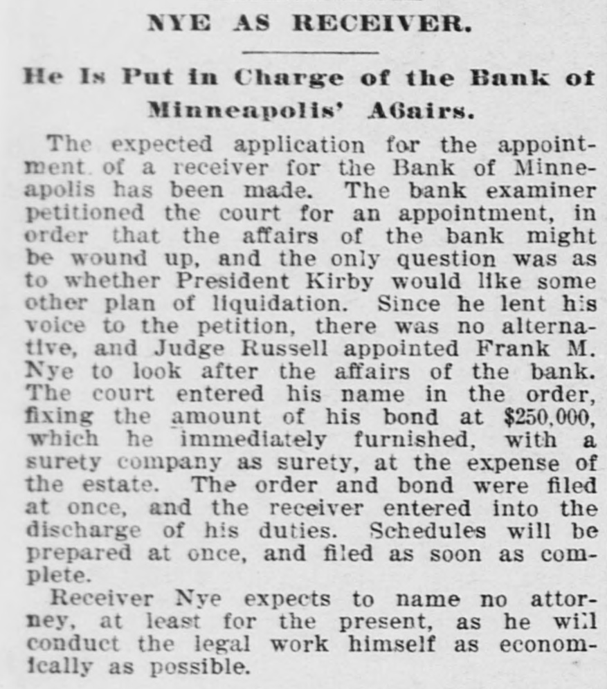 HOT AFTER KIRBY. Sensational Times in the Bank of Minneapolis Case. The Bank of Minneapolis case came up before Judge Russell yesterday, and brought out some sensational disclosures. Mr. Nye, the receiver, opened the case. Robert Christianson and H. D. Stocker Sr., were the attorneys, and they entered a very vigorous protest on the ground that President Kirby had not placed himself in a position to permit the receiver to accept the proposition of Mrs. Kirby to retain her collateral. Mr. Stocker thought it a peculiar thing that in the suit which had been commenced against the stockholders to establish liability, the name of Mr. Kirby had been omitted from the list of defendants. He had transferred some 284 shares of his stock about a year ago to other parties, and his liability on that stock would soon lapse unless he should be brought in under the laws of the state of Minnesota. J. F. McGee, who appeared for Mr. Kirby, said that the reason the latter had not been included was because he lived outside of the state, and Mr. Stocker retaliated by stating that parties living in California had been made defendants. Mr. Stocker also stated that shortly before the bank went into insolvenev Mr. Kirby had withdrawn from the bank the sum of $20,000 in cash and $10,000 or $12,000 in securities, and insisted that the securities which were a part of the $45,000 held by Mrs. Kirby, should be secured by the receiver in a suit against the president of the bank. Mr. Kirby, he claimed, was forced by the bank examiner to give back the $20,000 in cash, and ought to have given back the securities. Mr. Christianson, who also appeared for the creditors, urged the same things that Mr. Stocker had. J. F. McGee replied at some length and with cnusual warmth. He gave a history of the transfer of the collateral from the bank to Mrs. Kirby, showing that she and Mr. Kirby had constantly been the friends of the bank, and had always acted for its interest. He stated that at the time of the failure of the Irish-American bank, the Bank of Minneapolis opened on the morning of Jan. 16 with but $6,000 cash on hand to do business. The officers tried to borrow from the different banks, but without success. They went to the Security bank among others and finally secured the loan of $15,000 if Kirby would indorse a demand certificate of deposit. This was done, and the bank was tided over its trouble for that time. Mr. Kirby then went to Chicago, taking with him the $45,000 worth of paper for rediscount. Bank after bank was visited without success, until finally the First National of Chicago agreed to loan Mrs. Kirby $25,000 on her personal bonds. The offer was accepted and the loan made. Regarding the charge of the creditors that the collaterals involved had never been out of the possession of the bank, W. B. Augir, the acting cashier. and the vice president of the bank. stated that they had always been held in the bank's vault, which was controlled and managed entirely by Mr. Canady. a relative of the Kirbys. When any of them were to be paid. Mr. Canady always went to the box and got them personally. Mr. Nye stated that the lease of the bankrooms did not expire for about a year and there might be a liability on the stockholders. In his judgment there might be some object in getting the matters regarding the lease and the attachment of the funds in the Chicago bank cleared up. The real question at issue is whether the receiver can bring an action against President Kirby or not, and the court continued the case till next Saturday, when he will hear everything in the form of affidavits or testimony in court. He will then file his decision.